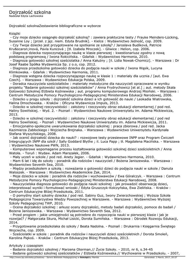Dojrzałość szkolna Nadesłał Edyta Lachowska Dojrzałość szkolnaZestawienie bibliograficzne w wyborze Książki - Czy moje dziecko osiągnęło dojrzałość szkolną? : zawiera praktyczne testy / Frauke Meinders-Lücking, Susanne Loy ; [przeł. z jęz. niem. Edyta Brudnik]. - Kielce : Wydawnictwo Jedność, cop. 2009. - Czy Twoje dziecko jest przygotowane na spotkanie ze szkołą? / Jaroslava Budíková, Patricie Krušinová, Pavla Kuncová ; [tł. Izabela Mroczek]. - Gliwice : Helion, cop. 2006. - Diagnoza dziecka rozpoczynającego naukę w klasie pierwszej : kwestionariusz zgodny z nową podstawą programową / Iwona Rokicińska. - Gdańsk : Wydawnictwo Harmonia, 2010. - Diagnoza gotowości szkolnej sześciolatka / Anna Kałużny ; [il. Lidia Nowak-Chomicz]. - Warszawa : Dr Josef Raabe Spółka Wydawnicza Sp. z o.o, cop. 2012. - Diagnoza przedszkolna gotowości dziecka do podjęcia nauki w szkole / Iwona Wąsik, Lucyna Klimkowska. - Gdańsk : Wydawnictwo Harmonia, 2011. - Diagnoza wstępna dziecka rozpoczynającego naukę w klasie 1 : materiały dla ucznia / [aut. Ewa Czech]. - Warszawa : Wydawnictwo Edukacja Polska, 2009. - Doradca nauczyciela sześciolatków : materiały metodyczne dla nauczycieli opracowane w wyniku projektu "Badanie gotowości szkolnej sześciolatków" / Anna Frydrychowicz [et al.] ; aut. metody Skala Gotowości Szkolnej Elżbieta Koźniewska ; aut. programu komputerowego Andrzej Misiński. - Warszawa : Centrum Metodyczne Pomocy Psychologiczno-Pedagogicznej Ministerstwa Edukacji Narodowej, 2006. - Dziecko u progu szkoły : dojrzałość szkolna dzieci a ich gotowość do nauki / Leokadia Wiatrowska, Halina Dmochowska. - Kraków : Oficyna Wydawnicza Impuls, 2013. - Dziecko w szkolnej rzeczywistości : założony i rzeczywisty obraz edukacji elementarnej / pod red. Haliny Sowińskiej. - Wyd. 2. - Poznań : Wydawnictwo Naukowe Uniwersytetu im. Adama Mickiewicza, 2013. - Dziecko w szkolnej rzeczywistości : założony i rzeczywisty obraz edukacji elementarnej / pod red Haliny Sowińskiej. - Poznań : Wydawnictwo Naukowe Uniwersytetu im. Adama Mickiewicza, 2011. - Emocjonalno-społeczne uwarunkowania dojrzałości szkolnej : praca zbiorowa / pod red. Jacka Kazimierza Zabłockiego i Wojciecha Brejnaka. - Warszawa : Wydawnictwo Uniwersytetu Kardynała Stefana Wyszyńskiego, 2008. - Jak ocenić dojrzałość dziecka do nauki? : rozwojowe testy przesiewowe INPP oraz Program Ćwiczeń Integrujących INPP dla szkół / Sally Goddard Blythe ; il. Luca Papp ; tł. Magdalena Macińska. - Warszawa : Wydawnictwo Naukowe PWN, 2013. - Komputerowe wspomaganie procesu kształtowania gotowości szkolnej dzieci sześcioletnich / Anna Watoła. - Toruń : Wydaw. Adam Marszałek, 2006. - Mały uczeń w szkole / pod red. Anety Jegier. - Gdańsk : Wydawnictwo Harmonia, 2010. - Mam 6 lat i idę do szkoły : poradnik dla rodziców i nauczycieli / Bożena Janiszewska. - Warszawa : Wydawnictwo Seventh Sea, 2010. - Między przedszkolem a szkołą : rozważania o gotowości dzieci do podjęcia nauki w szkole / Danuta Waloszek. - Warszawa : Wydawnictwo Akademickie Żak, 2014. - Moje dziecko w szkole : poradnik dla rodziców i wychowawców / Ewa Góralczyk. - Warszawa : Centrum Metodyczne Pomocy Psychologiczno-Pedagogicznej Ministerstwa Edukacji Narodowej, 2008. - Nauczycielska diagnoza gotowości do podjęcia nauki szkolnej : jak prowadzić obserwację dzieci, interpretować wyniki i formułować wnioski / Edyta Gruszczyk-Kolczyńska, Ewa Zielińska. - Kraków : Centrum Edukacyjne Bliżej Przedszkola, 2011. - O pomyślny start szkolny dziecka / pod red. Sabiny Guz, Iwony Zwierzchowskiej ; Wyższa Szkoła Pedagogiczna Towarzystwa Wiedzy Powszechnej w Warszawie. - Warszawa : Wydawnictwo Wyższej Szkoły Pedagogicznej TWP, 2010. - Ocena dojrzałości szkolnej : arkusz oceny dojrzałości, metody badań dojrzałości, pomoce do badań / Bożena Janiszewska. - Warszawa : Wydawnictwo Seventh Sea, 2012. - Przed progiem : jakie umiejętności są potrzebne do rozpoczęcia nauki w pierwszej klasie i jak je rozwijać? / Małgorzata Skura, Michał Lisicki, Dorota Sumińska. - Warszawa : Ośrodek Rozwoju Edukacji, 2014. - Przygotowanie przedszkolaka do szkoły / Beata Nadolna. - Poznań : Drukarnia i Księgarnia Świętego Wojciecha, cop. 2009. - Sześciolatki w szkole : poradnik dla rodziców i nauczycieli dzieci sześcioletnich / Dorota Smoleń, Karolina Piękoś. - Kraków : Centrum Edukacyjne Bliżej Przedszkola, 2013. Artykuły z czasopism - Badanie dojrzałości szkolnej / Marzena Oterman.// Życie Szkoły. - 2010, nr 6, s.34-45 - Badanie gotowości szkolnej sześciolatków / Elżbieta Koźniewska.// Wychowanie w Przedszkolu. - 2007, http://www.bp.ostroleka.pl/testowy - Serwis Biblioteki Pedagogicznej w Ostrołęce Powered by Mambo Generated: 3 March, 2017, 20:27 nr 3, s. 11-15 - Co dalej z sześciolatkami ? / Małgorzata Narożnik.// Wychowanie w Przedszkolu. - 2009, nr 8, s.35-36 - Co robić, aby absolwent przedszkola nie nudził się w pierwszej klasie? / Barbara Lubaszewska-Borys.// Dyrektor Szkoły. - 2006, nr 12, s. 48-51 - Co umieją sześciolatki / Radosław Kaczan, Piotr Rycielski.// Psychologia w Szkole. - 2013, nr 5, s. 4348 - Co warto wiedzieć, a o czym warto przypomnieć? W związku z wczesnoszkolną edukacją "sześciolatków" / Krzysztof Ziemba.// Lider. - 2010, nr 3, s. 25-26 - Co z tą dojrzałością szkolną? / Bożena Janiszewska.// Meritum. - 2009, nr 1, s. 33-37 - Czy daleka droga sześciolatka do szkoły? / Elżbieta Stój.// Życie Szkoły. - 2009, nr 7, s.60-62 - Czy posłać sześciolatka do szkoły? / Dorota Michałek.// Wychowanie w Przedszkolu. - 2012, nr 7, s. 57 - Czy sześciolatki dorosły do szkoły? / Ewa Maksymowska.// Dyrektor Szkoły. - 2015, nr 3, s.48-50 - Czy zabieramy dzieciństwo sześciolatkom? / Hanna Liberska, Mirosława Matuszewska.// Psychologia w Szkole. - 2011, nr 4, s. 97-105 - Czynniki warunkujące osiągnięcie dojrzałości szkolnej / Dorota Sa