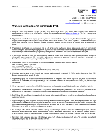 Wersja: D Dokument Systemu Zarządzania Jakością PN-EN ISO 9001:2001 C do P-7.5 Krautzberger Polska Górki 7, 82-400 Sztum tel. (55) 64-04-600, (55) 277-54-83 fax (55) 64-04-550, gsm 601-68-68-60 www.krautzberger.pl, [email protected] Warunki Udostępniania Sprzętu do Prób 1. Niniejsze Zasady Wypożyczania Sprzętu (WUSdP) firmy Krautzberger Polska (KP) opisują zasady wypożyczania sprzętu do wykonywania prób technicznych. Treść WUSdP znajduje się do pobrania na stronie www.krautzberger.pl . (WUSdP) obowiązują od dnia 03.05.2006. 2. Wypożyczanie sprzętu do prób dotyczy głównie wyrobów w zakresie techniki natryskowej firmy Krautzberger GmbH. Wypożyczenie mogą być inne narzędzia lub urządzenia, uzgodnione z kontrahentem. Firma KP jest gotowa uzgodnić z kontrahentem specjalna wersję prób, takich jak: próby w obecności naszego pracownika, próby w naszym zakładzie w Sztumie, próby w laboratorium w Eltville. 3. Wypożyczenie sprzętu do prób technicznych ma na celu przekonanie użytkownika o jego rzeczywistych walorach technicznych. Wykonywanie prób technicznych przez przyszłych użytkowników jest istotnym sposobem doradztwa technicznego przed sprzedażą. Daje duże bezpieczeństwo słuszności podejmowanych decyzji przez kontrahenta. Jest preferowaną formą sprzedaży KP. 4. Wypożyczanie sprzętu nie może być natomiast żadną, jawna lub ukrytą formą uzyskiwania przez kontrahenta ogólno dostępnych wiadomości technologicznych. KP gwarantuje jednocześnie zachowanie poufności informacji techniczny uzyskanych od kontrahentów w czasie przebiegu i uzgodnień prób technicznych. 5. Wypożyczenie sprzętu do prób następuje na podstawie pisemnego zgłoszenie, które powinno zawierać: dane kontrahenta i osoby zgłaszającej; dane narzędzia lub urządzenia; opis planowanej próby; czas wykonania próby; spodziewane efekty próby technicznej i kryteria uznania próby pozytywnej. 6. Warunkiem wypożyczenia sprzętu do prób jest pisemne zaakceptowanie niniejszych WUSdP – według formularza D do P-7.5 Zgłoszenie udostępniania sprzętu do prób 7. Wypożyczany sprzęt jest transportowany na koszt kontrahenta. W przypadku braku innych uzgodnień, przyjmuje się, że transport odbywa się na zlecenie KP przez firmę kurierską (np. DPD). Kosztami transportu KP obciąża kontrahenta fakturą VAT, bez osobnego zamówienia. 8. Okres wypożyczenia wynosi maksymalnie 20 dni kalendarzowych, licząc od dnia wysyłki do dnia odbioru w zakładzie w Sztumie. 9. Wypożyczenie sprzętu do prób technicznych, z wyłączeniem kosztów transportu, jest bezpłatne. Od momentu wysyłki do momentu odbioru sprzętu w zakładzie w Sztumie, całą odpowiedzialność za utratę lub uszkodzenie towaru ponosi kontrahent. 10. Najpóźniej w dniu wysyłki sprzętu przygotowuje się i wysyła (alternatywnie lub łącznie: e-mail, fax, poczta) do kontrahenta ofertę na wypożyczany sprzęt. 11. Wypożyczony sprzęt jest w przypadku pozytywnych prób przedmiotem sprzedaży, zgodnie z ofertą. Próby są negatywne o ile w ciągu okresu wypożyczenia kontrahent nie osiągnie spodziewanych efektów technicznych i zawiadomi o tym pisemnie KP. Brak pisemnego opisu przyczyn braku spodziewanego efektu technicznego uznawane jest za próby pozytywne. W takim przypadku nie jest wiążący fakt zwrotu w terminie lub po terminie wypożyczonego sprzętu. 12. KP zastrzega sobie prawo naliczenia kosztów naprawy wypożyczonego sprzętu w przypadku nadmiernego zużycia, używania niezgodnie z przeznaczeniem, zwrotu niekompletnego sprzętu. Kontrahent zobowiązany jest do używania sprzętu zgodnie z przeznaczeniem i instrukcją obsługi. Kontrahent zobowiązany jest do przeszkolenia pracowników w zakresie zasad bezpieczeństwa. 13. Kontrahent może dokonać osobnych, indywidualnych uzgodnień dotyczących świadczonych usług. W przypadku braku takich uzgodnień, przyjmuje się, że kontrahent akceptuje WUSdP. Niniejszy dokument jest własnością firmy Krautzberger Polska i nie może być kopiowany