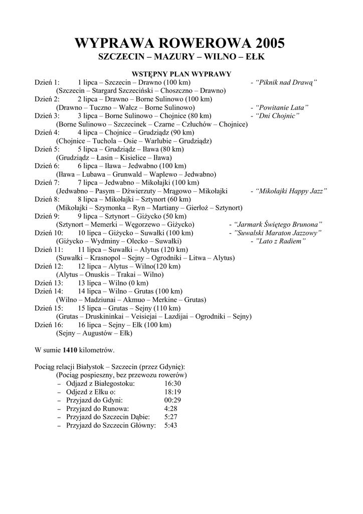 WYPRAWA ROWEROWA 2005 SZCZECIN – MAZURY – WILNO – EŁK WSTĘPNY PLAN WYPRAWY Dzień 1: 1 lipca – Szczecin – Drawno (100 km) - “Piknik nad Drawą” (Szczecin – Stargard Szczeciński – Choszczno – Drawno) Dzień 2: 2 lipca – Drawno – Borne Sulinowo (100 km) (Drawno – Tuczno – Wałcz – Borne Sulinowo) - “Powitanie Lata” Dzień 3: 3 lipca – Borne Sulinowo – Chojnice (80 km) - “Dni Chojnic” (Borne Sulinowo – Szczecinek – Czarne – Człuchów – Chojnice) Dzień 4: 4 lipca – Chojnice – Grudziądz (90 km) (Chojnice – Tuchola – Osie – Warlubie – Grudziądz) Dzień 5: 5 lipca – Grudziądz – Iława (80 km) (Grudziądz – Łasin – Kisielice – Iława) Dzień 6: 6 lipca – Iława – Jedwabno (100 km) (Iława – Lubawa – Grunwald – Waplewo – Jedwabno) Dzień 7: 7 lipca – Jedwabno – Mikołajki (100 km) (Jedwabno – Pasym – Dźwierzuty – Mrągowo – Mikołajki - “Mikołajki Happy Jazz” Dzień 8: 8 lipca – Mikołajki – Sztynort (60 km) (Mikołajki – Szymonka – Ryn – Martiany – Gierłoż – Sztynort) Dzień 9: 9 lipca – Sztynort – Giżycko (50 km) (Sztynort – Memerki – Węgorzewo – Giżycko) - “Jarmark Świętego Brunona” Dzień 10: 10 lipca – Giżycko – Suwałki (100 km) - ”Suwalski Maraton Jazzowy” (Giżycko – Wydminy – Olecko – Suwałki) - ”Lato z Radiem” Dzień 11: 11 lipca – Suwałki – Alytus (120 km) (Suwałki – Krasnopol – Sejny – Ogrodniki – Litwa – Alytus) Dzień 12: 12 lipca – Alytus – Wilno(120 km) (Alytus – Onuskis – Trakai – Wilno) Dzień 13: 13 lipca – Wilno (0 km) Dzień 14: 14 lipca – Wilno – Grutas (100 km) (Wilno – Madziunai – Akmuo – Merkine – Grutas) Dzień 15: 15 lipca – Grutas – Sejny (110 km) (Grutas – Druskininkai – Veisiejai – Lazdijai – Ogrodniki – Sejny) Dzień 16: 16 lipca – Sejny – Ełk (100 km) (Sejny – Augustów – Ełk) W sumie 1410 kilometrów. Pociąg relacji Białystok – Szczecin (przez Gdynię): (Pociąg pospieszny, bez przewozu rowerów) – Odjazd z Białegostoku: 16:30 – Odjezd z Ełku o: 18:19 – Przyjazd do Gdyni: 00:29 – Przyjazd do Runowa: 4:28 – Przyjazd do Szczecin Dąbie: 5:27 – Przyjazd do Szczecin Główny: 5:43 CIEKAWE MIEJSCA I IMPREZY JEZIORO MIEDWIE (Torpedownia): – Ośrodek po wojnie znalazł się na terenie bazy Armii Czerwonej. Dziś torpedownia na Miedwiu nie ma żadnego zastosowania militarnego. Wciąż znajduje się na terenie jednostki wojskowej i nie ma do niej swobodnego dostępu. Nieduży budynek, ulokowany sto metrów od brzegu. Były w nim tylko urządzenia do odpalania torped i obserwacyjnopomiarowe. – O torpedowni na jeziorze Miedwie wie niemal każdy mieszkaniec tych okolic. Mówiło się, że to właśnie w tym miejscu sprawdzane były rakiety V1 i V2, które miały umożliwić Niemcom zwycięstwo w II wojnie światowej. Jednak okazuje się, że to tylko miedwiańska legenda, a akwen jeziora wykorzystywany był do prób torped. DRAWNO: – 1-3 lipca 2005 – VII Piknik Nad Drawą: – 1.07 – Kombi, Kukiz i Piersi – 2.07 – Oddział Zamknięty, Budka Suflera – 3.07 – “Hip Hop nad Drawą” – W dniach 1-3 lipiec 2005 (podczas Pikniku nad Drawą), Gimnazjum w Drawnie udostępnia na noclegi dla turystów jedno pomieszczenie. Należy wziąć ze soba śpiwory i karimatę (łóżek nie ma na wyposażeniu). Dostęp do wody i sanitariatów zapewniony. Koszt ok 10 zł za dobę. STRZALINY: – Bunkry Wału Pomorskiego – Dojazd z Tuczna. Przed Strzalinami droga z płyt betonowych, za ostatnimi zabudowaniami Strzalin (droga polna) tuż przed masywem Góry Wisielczej należy skręcić w lewo pod górę, droga polna doprowadzi pod sam blok wejściowy grupy warownej (po prawej stronie drogi). – Góra Wisielcza to największa grupa warowna Wału Pomorskiego. Posiada rozbudowany system podziemny o dł. ponad 650m. Grupa składa się z 8 obiektów (odporność B) połączonych z systemem podziemnym. W okolicy ponadto znajduje się kilkanaście małych typowych schronów B1 i pozostałości zapór p.panc. Dostęp do dobrze zachowanego systemu podziemnego poprzez klatkę schodową w głównym schronie znajdującym się tuż przy drodze. Niestety większość obiektów (jeśli nie wszystkie) na tym terenie została wysadzona, jest mocno zniszczona i dosyć trudna do odnalezienia w lesie... RUTWICA: – Wieś Rutwica koło Wałcza - to właśnie tu dzieją się rzeczy, które przeczą nie tylko zdrowemu rozsądkowi, ale i prawom fizyki. Samochód sam wjeżdża pod górę, pod górę toczy się butelka z wodą, nieznacznie tylko trącona, a i deszczówka nie chce spływać w dół. Wprawdzie odkryto to już kilkadziesiąt lat temu, ale do dziś nie wiadomo, dlaczego tak się dzieje. Swego czasu wiele mówiło się o złudzeniu optycznym, o tym, że nie ma tu żadnej pochyłości. Gdy jednak "górkę cudów" zmierzono, okazało się, że nachylenie jednak istnieje. Później próbowano to wyjaśnić działaniem sił zaburzonego pola magnetycznego, ale i ta naprędce wymyślona koncepcja nie zdała egzaminu nie zdała egzaminu, bo pod górę "ruszają" nie tylko metale. Pozostała więc teoria o polu grawitacyjnym. Ale i te próby wyjaśnienia, dlaczego siła ciężkości nie działa tu prostopadle, lecz skośnie do powierzchni Ziemi, skazane są - przynajmniej na razie - na niepowodzenie. Bo jak udowodnić istnienie kilkaset metrów pod ziemią ciała o niewyobrażalnie dużej gęstości i masie - tylko takie mogłoby zaburzyć pole grawitacyjne. WAŁCZ: – GW Cegielnia składa się dwóch schronów, które łączyły się poterną z dwoma odosobnionymi dziełami w postaci "wież pancernych" pierwotnie wyposażonych w kopuły 3 strzelnicowe. Jeden z głównych schronów grupy jest dobrze zachowany wraz z poterną. Drugi schron na skutek podkopania osunął się na dno wyrobiska pocegielnianego, zachowała się poterna prowadząca do dzieł