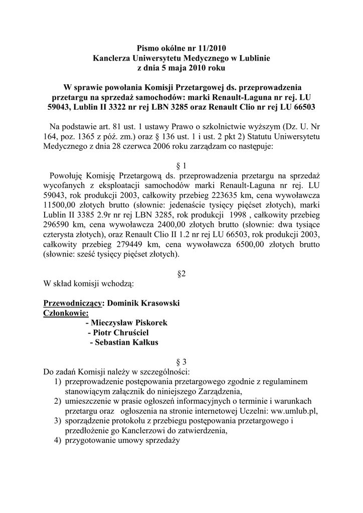 Pismo okólne nr 11/2010 Kanclerza Uniwersytetu Medycznego w Lublinie z dnia 5 maja 2010 roku W sprawie powołania Komisji Przetargowej ds. przeprowadzenia przetargu na sprzedaŜ samochodów: marki Renault-Laguna nr rej. LU 59043, Lublin II 3322 nr rej LBN 3285 oraz Renault Clio nr rej LU 66503 Na podstawie art. 81 ust. 1 ustawy Prawo o szkolnictwie wyŜszym (Dz. U. Nr 164, poz. 1365 z póź. zm.) oraz § 136 ust. 1 i ust. 2 pkt 2) Statutu Uniwersytetu Medycznego z dnia 28 czerwca 2006 roku zarządzam co następuje: §1 Powołuję Komisję Przetargową ds. przeprowadzenia przetargu na sprzedaŜ wycofanych z eksploatacji samochodów marki Renault-Laguna nr rej. LU 59043, rok produkcji 2003, całkowity przebieg 223635 km, cena wywoławcza 11500,00 złotych brutto (słownie: jedenaście tysięcy pięćset złotych), marki Lublin II 3385 2.9r nr rej LBN 3285, rok produkcji 1998 , całkowity przebieg 296590 km, cena wywoławcza 2400,00 złotych brutto (słownie: dwa tysiące czterysta złotych), oraz Renault Clio II 1.2 nr rej LU 66503, rok produkcji 2003, całkowity przebieg 279449 km, cena wywoławcza 6500,00 złotych brutto (słownie: sześć tysięcy pięćset złotych). §2 W skład komisji wchodzą: Przewodniczący: Dominik Krasowski Członkowie: - Mieczysław Piskorek - Piotr Chruściel - Sebastian Kałkus §3 Do zadań Komisji naleŜy w szczególności: 1) przeprowadzenie postępowania przetargowego zgodnie z regulaminem stanowiącym załącznik do niniejszego Zarządzenia, 2) umieszczenie w prasie ogłoszeń informacyjnych o terminie i warunkach przetargu oraz ogłoszenia na stronie internetowej Uczelni: ww.umlub.pl, 3) sporządzenie protokołu z przebiegu postępowania przetargowego i przedłoŜenie go Kanclerzowi do zatwierdzenia, 4) przygotowanie umowy sprzedaŜy §4 1. Przetarg odbędzie się 25 maja 2010 roku o godz. 10.30 w budynku bazy transportu UM, ul. W. Chodźki 8. 2. Drugi przetarg na pojazd/y nie sprzedane w pierwszym przetargu, odbędzie się 11 czerwca 2010 roku o godz. 10.30. §5 Wykonywanie niniejszego zarządzenia powierza się Przewodniczącemu Komisji. §6 Zarządzenie wchodzi w Ŝycie z dniem podpisania. KANCLERZ Uniwersytetu Medycznego w Lublinie mgr Ewa Abramek
