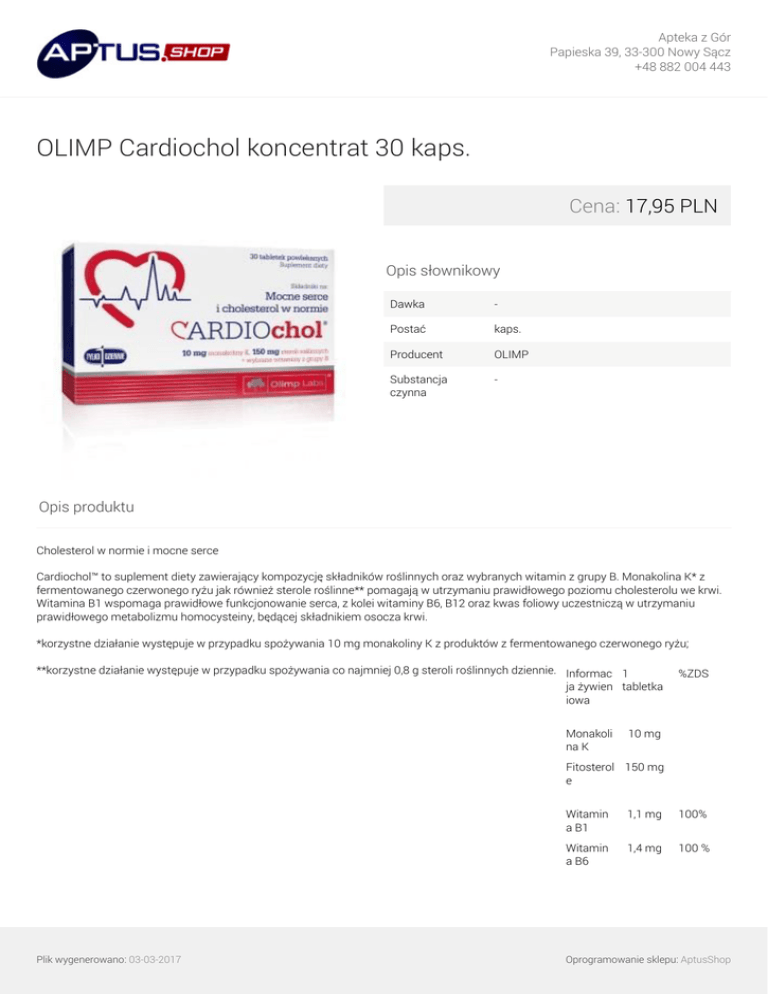 Apteka z Gór Papieska 39, 33-300 Nowy Sącz +48 882 004 443 OLIMP Cardiochol koncentrat 30 kaps. Cena: 17,95 PLN Opis słownikowy Dawka - Postać kaps. Producent OLIMP Substancja czynna - Opis produktu Cholesterol w normie i mocne serce Cardiochol™ to suplement diety zawierający kompozycję składników roślinnych oraz wybranych witamin z grupy B. Monakolina K* z fermentowanego czerwonego ryżu jak również sterole roślinne** pomagają w utrzymaniu prawidłowego poziomu cholesterolu we krwi. Witamina B1 wspomaga prawidłowe funkcjonowanie serca, z kolei witaminy B6, B12 oraz kwas foliowy uczestniczą w utrzymaniu prawidłowego metabolizmu homocysteiny, będącej składnikiem osocza krwi. *korzystne działanie występuje w przypadku spożywania 10 mg monakoliny K z produktów z fermentowanego czerwonego ryżu; **korzystne działanie występuje w przypadku spożywania co najmniej 0,8 g steroli roślinnych dziennie. Informac 1 ja żywien tabletka iowa Monakoli na K %ZDS 10 mg Fitosterol 150 mg e Plik wygenerowano: 03-03-2017 Witamin a B1 1,1 mg 100% Witamin a B6 1,4 mg 100 % Oprogramowanie sklepu: AptusShop Apteka z Gór Papieska 39, 33-300 Nowy Sącz +48 882 004 443 Kwas foliowy 200 µg 100 % Witamin a B12 2,5 µg 100 % *%ZDS – procent realizacji zalecanego dziennego spożycia. Składniki: fermentowany czerwony ryż, substancja wypełniająca – celuloza mikrokrystaliczna, sterole roślinne, substancje glazurujące – alkohol poliwinylowy, glikol polietylenowy, talk; substancje przeciwzbrylające – dwutlenek krzemu, sole magnezowe kwasów tłuszczowych; cyjanokobalamina – wit. B12, chlorowodorek pirydoksyny – wit. B6, chlorowodorek tiaminy – wit. B1, kwas pteroilomonoglutaminowy – folian, barwnik – E 171. Preparat przeznaczony: jako suplement diety dla osób dorosłych dbających o serce i układ krążenia, dążących do utrzymania prawidłowego poziomu cholesterolu we krwi. Warunki przechowywania: przechowywać w suchych pomieszczeniach, w temperaturze pokojowej, w szczelnie zamkniętych opakowaniach, chronić od wilgoci. Przechowywać w sposób niedostępny dla małych dzieci. Plik wygenerowano: 03-03-2017 Powered by TCPDF (www.tcpdf.org) Oprogramowanie sklepu: AptusShop