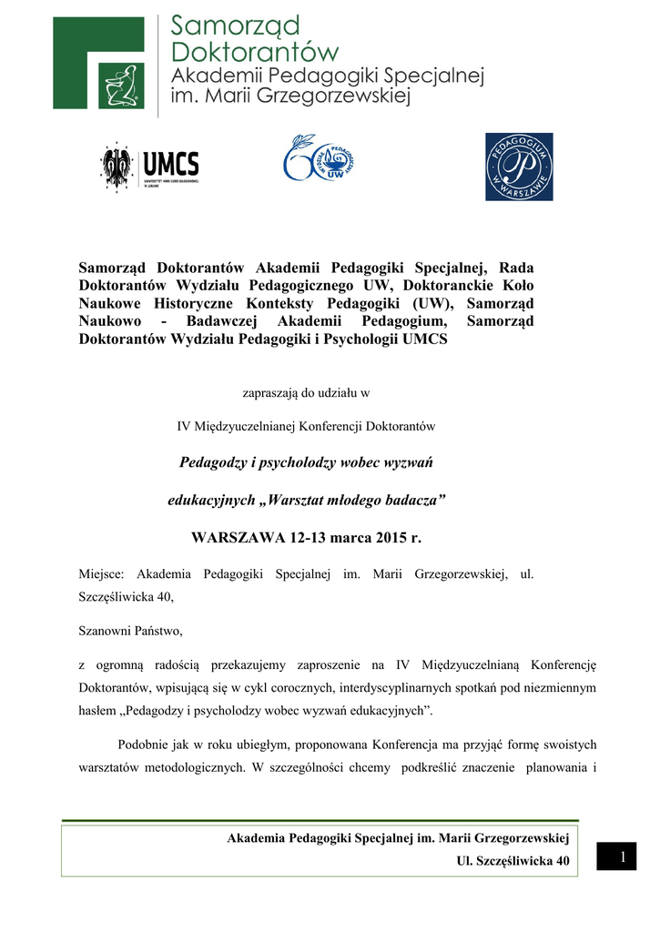 Samorząd Doktorantów Akademii Pedagogiki Specjalnej, Rada Doktorantów Wydziału Pedagogicznego UW, Doktoranckie Koło Naukowe Historyczne Konteksty Pedagogiki (UW), Samorząd Naukowo - Badawczej Akademii Pedagogium, Samorząd Doktorantów Wydziału Pedagogiki i Psychologii UMCS zapraszają do udziału w IV Międzyuczelnianej Konferencji Doktorantów Pedagodzy i psycholodzy wobec wyzwań edukacyjnych „Warsztat młodego badacza” WARSZAWA 12-13 marca 2015 r. Miejsce: Akademia Pedagogiki Specjalnej im. Marii Grzegorzewskiej, ul. Szczęśliwicka 40, Szanowni Państwo, z ogromną radością przekazujemy zaproszenie na IV Międzyuczelnianą Konferencję Doktorantów, wpisującą się w cykl corocznych, interdyscyplinarnych spotkań pod niezmiennym hasłem „Pedagodzy i psycholodzy wobec wyzwań edukacyjnych”. Podobnie jak w roku ubiegłym, proponowana Konferencja ma przyjąć formę swoistych warsztatów metodologicznych. W szczególności chcemy podkreślić znaczenie planowania i Akademia Pedagogiki Specjalnej im. Marii Grzegorzewskiej Ul. Szczęśliwicka 40 02-353 Warszawa 1 realizacji projektów badawczych, a także dyskutować na temat etycznego wymiaru badań w naukach społecznych. Konferencja odbywać się będzie w dniach 12 i 13 marca 2015 roku, z podziałem na blok o charakterze edukacyjnym (dzień I) i blok dyskusyjny (dzień II). Zgodnie z zaplanowaną strukturą, Konferencję rozpoczniemy Szkołą Mistrzów, która umożliwi Państwu zapoznanie się z poglądami wybitnych Profesorów na temat współczesnych problemów nauk społecznych. Następnie wysłuchamy wystąpień młodych doktorów, eksponujących oryginalne, innowacyjne rozwiązania metodologiczne. W drugim dniu odbędą się dwie sekcje, każda z 4 panelami tematycznymi, w których głos oddamy głównie Państwu - doktorantom, aby wspólnie urzeczywistniać ideę otwartej nauki, wymiany myśli, poczynając od najwcześniejszych etapów projektów badawczych. Dlatego też i w tym roku zachęcamy do zgłaszania wystąpień akcentujących założenia teoretyczne oraz metodologiczne podejmowanych tematów z obszaru nauk pedagogicznych i psychologicznych. Mamy nadzieję spotkać się z Państwem w murach Akademii Pedagogiki Specjalnej im. Marii Grzegorzewskiej w Warszawie, aby odważnie dyskutować o problemach towarzyszących badaniom własnym i innych badaczy. HONOROWY KOMITET NAUKOWY KONFERENCJI: prof. dr hab. Ryszard Bera, Dziekan UMCS prof. dr hab. Marek Konopczyński, Rektor Pedagogium WSNS prof. dr hab. Mirosław Józef Szymański (APS) prof. dr hab. Wiesław Theiss (UW) dr hab Maciej Karwowski, prof. APS dr hab. Anna Kowalewska, prof. UW dr hab. Jan Łaszczyk, prof. APS, Rektor APS prof. dr hab. Irena Mudrecka, prof. Pedagogium WSNS dr hab. Beata Maria Nowak, prof. Pedagogium WSNS Akademia Pedagogiki Specjalnej im. Marii Grzegorzewskiej Ul. Szczęśliwicka 40 02-353 Warszawa 2 dr hab. Barbara Smolińska-Theiss, prof. APS dr hab. Franciszek Szlosek, prof. APS dr hab., Grzegorz Szumski, prof. APS, Kierownik Studiów Doktoranckich dr hab. Maciej Tanaś, prof. APS, Dziekan WNP APS dr hab. Dorota Turska, prof. UMCS, Kierownik Studiów Doktoranckich dr hab. Małgorzata Żytko, prof. UW, Kierownik Studiów Doktoranckich KIEROWNIK NAUKOWY: dr hab., Grzegorz Szumski prof. APS KOORDYNATORZY KONFERENCJI: Mgr Krystyna Heland Mgr Marcin Szostakowski KOMITET ORGANIZACYJNY KONFERENCJI Mgr Alina Ukalisz (UMCS) Mgr Magdalena Sokołowska (UW) Dr Marcin Stradowski (Pedagogium) Mgr Renata Gardian – Miałkowska (APS) Mgr Natalia Józefacka – Szram (APS Mgr Katarzyna Kołaczyńska (APS) Mgr Agnieszka Przybylak (APS) Mgr Edyta Zawadzka (APS) Termin nadesłania zgłoszeń do: 15 lutego 2015 r. na adres: [email protected] Proponowany program konferencji, który może ulec zmianie: Akademia Pedagogiki Specjalnej im. Marii Grzegorzewskiej Ul. Szczęśliwicka 40 02-353 Warszawa 3 Pierwszy dzień konferencji 10:00 – 11:00 Rejestracja uczestników konferencji 11:00 – 11:10 Uroczyste otwarcie Konferencji – wystąpienie Rektora APS 11:10 – 11:50 Wystąpienia Kierowników Studiów Doktoranckich z APS, UW, UMSC, Pedagogium 11:50 – 12:40 Wykład inauguracyjny. Prof. dr hab. Mirosław Józef Szymański 12:40 – 13:00 Przerwa kawowa 13:00 – 15:00 Szkoła Mistrzów – wystąpienia Profesorów na temat metodologicznych problemów nauk społecznych 15:00 – 15:30 Sesja pytań 15:30 – 16:30 Przerwa obiadowa 16:30 – 18:30 Refleksje metodologiczne młodych doktorów (3 grupy tematyczne) podział ze względu na typ prowadzonych badań 18:30 Oficjalne zakończenie pierwszego dnia konferencji 19:00 „Kolacja metodologiczna” - Spotkanie integrujące uczestników Konferencji Drugi dzień konferencji 10:00 – 10:30 Rejestracja uczestników konferencji 10:30 – 12:30 Sekcja pierwsza 4 panele tematyczne, których opiekunami będą Profesorowie reprezentujący określony typ badań 12:30 – 13:30 Przerwa obiadowa 13:30 – 15:30 Sekcja druga 4 panele tematyczne których opiekunami będą Profesorowie reprezentujący określony typ badań 15:30 – 16:00 Przerwa kawowa 16:00 Podsumowanie i zakończenie konferencji PUBLIKACJA: Teksty, które chcieliby Państwo opublikować w monografii recenzowanej będą przyjmowane w nieprzekraczalnym terminie do 31 marca 2015r. Następne trafią do recenzji. Pozytywnie zrecenzowane artykuły zostaną opublikowane. Przyjmowane są tylko artykuły o charakterze badawczym,. Przewidywany termin publikacji: jesień 2015 roku. Opłata konferencyjna wynosi: Akademia Pedagogiki Specjalnej im. Marii Grzegorzewskiej Ul. Szczęśliwicka 40 02-353 Warszawa 4 Uczestnik czynny: 130zł. Cena zawiera obiady, wszystkie przerwy kawowe oraz proponowaną monografię recenzowaną. Po zakwalifikowaniu referatu do wystąpienia, zostanie wysłany numer konta z prośbą o opłatę do dnia 2 marca. Uczestnik bierny: udział bezpłatny. Możliwość uczestniczenia w wykładach i panelach podczas konferencji Akademia Peda