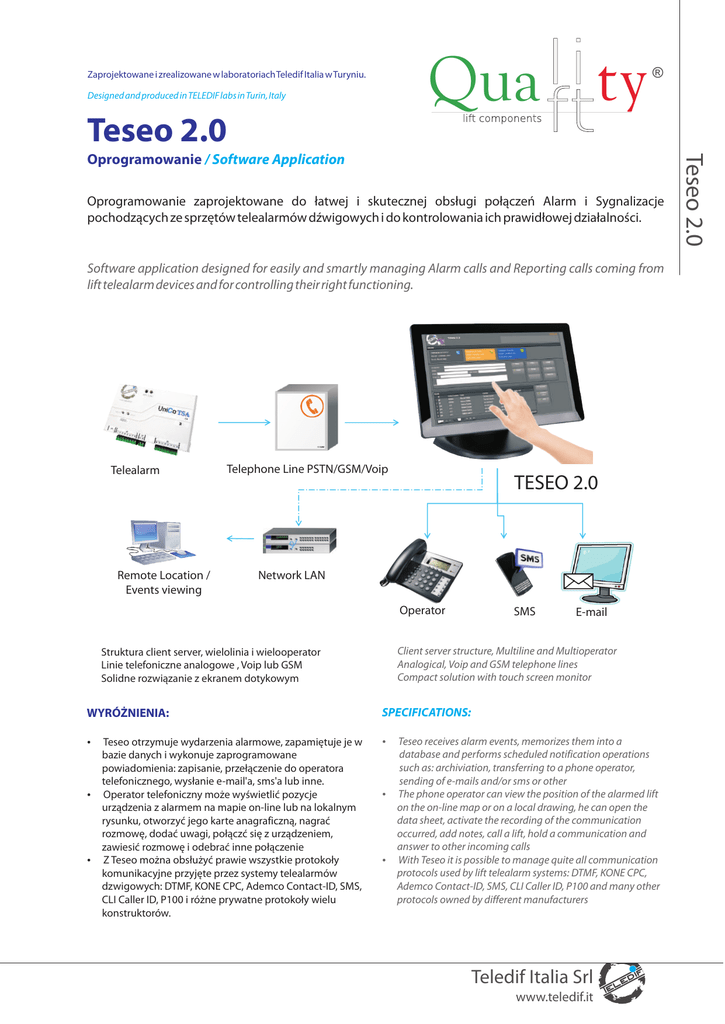 y t Qua li ft Zaprojektowane i zrealizowane w laboratoriach Teledif Italia w Turyniu. Designed and produced in TELEDIF labs in Turin, Italy ® lift components Teseo 2.0 Oprogramowanie zaprojektowane do ³atwej i skutecznej obs³ugi po³¹czeñ Alarm i Sygnalizacje pochodz¹cych ze sprzêtów telealarmów dŸwigowych i do kontrolowania ich prawid³owej dzia³alnoœci. Software application designed for easily and smartly managing Alarm calls and Reporting calls coming from lift telealarm devices and for controlling their right functioning. Telealarm Remote Location / Events viewing Telephone Line PSTN/GSM/Voip TESEO 2.0 Network LAN Operator Struktura client server, wielolinia i wielooperator Linie telefoniczne analogowe , Voip lub GSM Solidne rozwi¹zanie z ekranem dotykowym SMS E-mail Client server structure, Multiline and Multioperator Analogical, Voip and GSM telephone lines Compact solution with touch screen monitor WYRÓ¯NIENIA: SPECIFICATIONS: ? Teseo otrzymuje wydarzenia alarmowe, zapamiêtuje je w ? Teseo receives alarm events, memorizes them into a bazie danych i wykonuje zaprogramowane powiadomienia: zapisanie, prze³¹czenie do operatora telefonicznego, wys³anie e-mail'a, sms'a lub inne. ? Operator telefoniczny mo¿e wyœwietliæ pozycje urz¹dzenia z alarmem na mapie on-line lub na lokalnym rysunku, otworzyæ jego karte anagraficzn¹, nagraæ rozmowê, dodaæ uwagi, po³¹czæ siê z urz¹dzeniem, zawiesiæ rozmowê i odebraæ inne po³¹czenie ? Z Teseo mo¿na obs³u¿yæ prawie wszystkie protoko³y komunikacyjne przyjête przez systemy telealarmów dzwigowych: DTMF, KONE CPC, Ademco Contact-ID, SMS, CLI Caller ID, P100 i ró¿ne prywatne protoko³y wielu konstruktorów. database and performs scheduled notification operations such as: archiviation, transferring to a phone operator, sending of e-mails and/or sms or other ? The phone operator can view the position of the alarmed lift on the on-line map or on a local drawing, he can open the data sheet, activate the recording of the communication occurred, add notes, call a lift, hold a communication and answer to other incoming calls ? With Teseo it is possible to manage quite all communication protocols used by lift telealarm systems: DTMF, KONE CPC, Ademco Contact-ID, SMS, CLI Caller ID, P100 and many other protocols owned by different manufacturers Teledif Italia Srl www.teledif.it Teseo 2.0 Oprogramowanie / Software Application