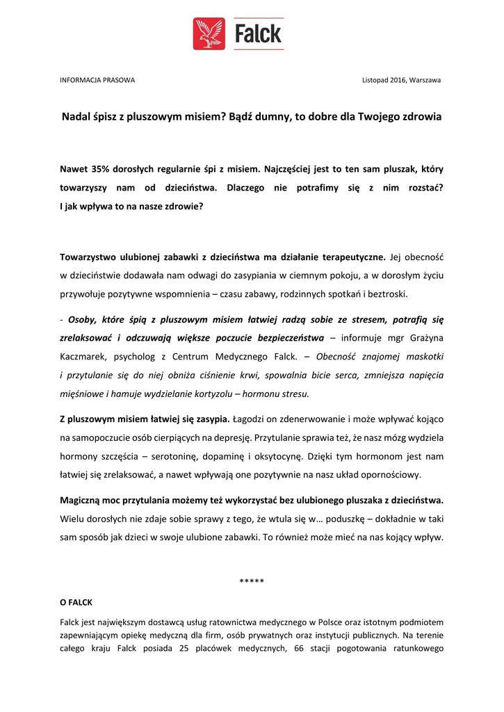 INFORMACJA PRASOWA Listopad 2016, Warszawa Nadal śpisz z pluszowym misiem? Bądź dumny, to dobre dla Twojego zdrowia Nawet 35% dorosłych regularnie śpi z misiem. Najczęściej jest to ten sam pluszak, który towarzyszy nam od dzieciństwa. Dlaczego nie potrafimy się z nim rozstać? I jak wpływa to na nasze zdrowie? Towarzystwo ulubionej zabawki z dzieciństwa ma działanie terapeutyczne. Jej obecność w dzieciństwie dodawała nam odwagi do zasypiania w ciemnym pokoju, a w dorosłym życiu przywołuje pozytywne wspomnienia – czasu zabawy, rodzinnych spotkań i beztroski. - Osoby, które śpią z pluszowym misiem łatwiej radzą sobie ze stresem, potrafią się zrelaksować i odczuwają większe poczucie bezpieczeństwa – informuje mgr Grażyna Kaczmarek, psycholog z Centrum Medycznego Falck. – Obecność znajomej maskotki i przytulanie się do niej obniża ciśnienie krwi, spowalnia bicie serca, zmniejsza napięcia mięśniowe i hamuje wydzielanie kortyzolu – hormonu stresu. Z pluszowym misiem łatwiej się zasypia. Łagodzi on zdenerwowanie i może wpływać kojąco na samopoczucie osób cierpiących na depresję. Przytulanie sprawia też, że nasz mózg wydziela hormony szczęścia – serotoninę, dopaminę i oksytocynę. Dzięki tym hormonom jest nam łatwiej się zrelaksować, a nawet wpływają one pozytywnie na nasz układ opornościowy. Magiczną moc przytulania możemy też wykorzystać bez ulubionego pluszaka z dzieciństwa. Wielu dorosłych nie zdaje sobie sprawy z tego, że wtula się w… poduszkę – dokładnie w taki sam sposób jak dzieci w swoje ulubione zabawki. To również może mieć na nas kojący wpływ. ***** O FALCK Falck jest największym dostawcą usług ratownictwa medycznego w Polsce oraz istotnym podmiotem zapewniającym opiekę medyczną dla firm, osób prywatnych oraz instytucji publicznych. Na terenie całego kraju Falck posiada 25 placówek medycznych, 66 stacji pogotowania ratunkowego oraz 150 nowoczesnych ambulansów. Zatrudniając 3000 osób, Falck zapewnia usługi dla ponad 2,5 miliona osób. Działalność operacyjna spółki podzielona jest na dwie części: ratownictwo medyczne oraz nowoczesna opieka medyczna. Więcej informacji na stronie www.falck.pl Kontakt dla mediów: Jarosław Melon Neuron Agencja Public Relations e: [email protected] t: 666 83 10 80 Marta Bujakiewicz Neuron Agencja Public Relations e: [email protected] t: 664 125 433