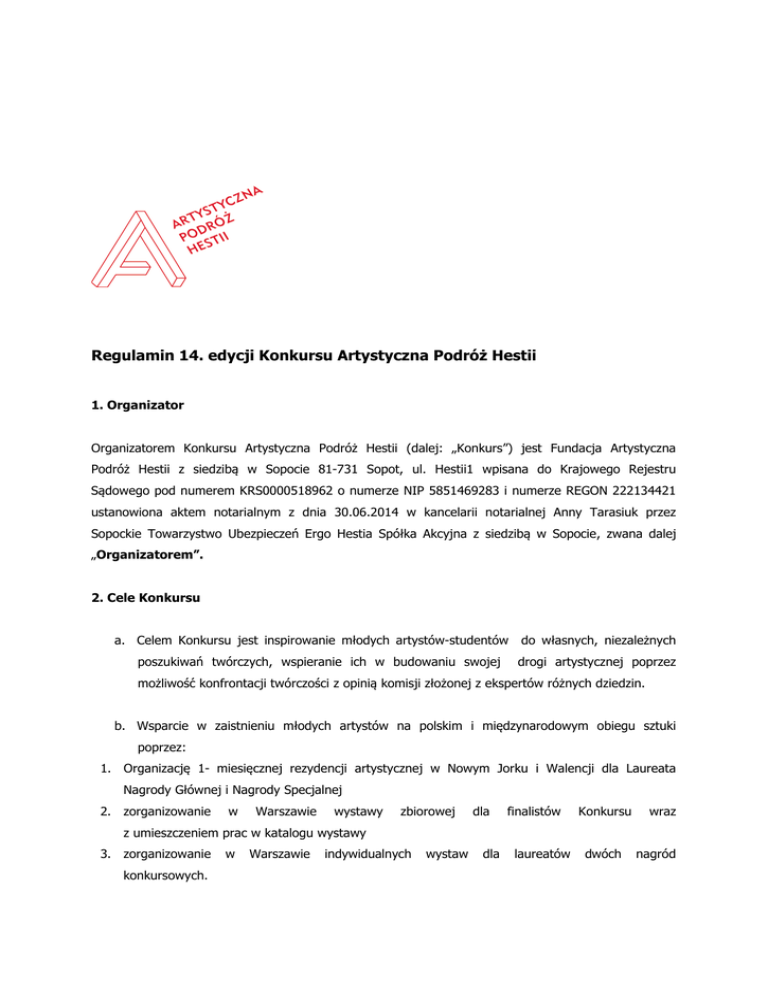 Regulamin 14. edycji Konkursu Artystyczna Podróż Hestii 1. Organizator Organizatorem Konkursu Artystyczna Podróż Hestii (dalej: „Konkurs”) jest Fundacja Artystyczna Podróż Hestii z siedzibą w Sopocie 81-731 Sopot, ul. Hestii1 wpisana do Krajowego Rejestru Sądowego pod numerem KRS0000518962 o numerze NIP 5851469283 i numerze REGON 222134421 ustanowiona aktem notarialnym z dnia 30.06.2014 w kancelarii notarialnej Anny Tarasiuk przez Sopockie Towarzystwo Ubezpieczeń Ergo Hestia Spółka Akcyjna z siedzibą w Sopocie, zwana dalej „Organizatorem”. 2. Cele Konkursu a. Celem Konkursu jest inspirowanie młodych artystów-studentów do własnych, niezależnych poszukiwań twórczych, wspieranie ich w budowaniu swojej drogi artystycznej poprzez możliwość konfrontacji twórczości z opinią komisji złożonej z ekspertów różnych dziedzin. b. Wsparcie w zaistnieniu młodych artystów na polskim i międzynarodowym obiegu sztuki poprzez: 1. Organizację 1- miesięcznej rezydencji artystycznej w Nowym Jorku i Walencji dla Laureata Nagrody Głównej i Nagrody Specjalnej 2. zorganizowanie w Warszawie wystawy zbiorowej dla finalistów Konkursu wraz z umieszczeniem prac w katalogu wystawy 3. zorganizowanie konkursowych. w Warszawie indywidualnych wystaw dla laureatów dwóch nagród c. Upowszechnianie w środowisku artystycznym i biznesowym idei promocji młodych artystów i wspierania edukacji artystycznej poprzez organizowanie przy okazji Konkursu wykładów, spotkań i dyskusji z przedstawicielami świata sztuki i biznesu. 3. Uczestnicy a. Uczestnikami Konkursu mogą być wyłącznie aktualni studenci III, IV i V roku wszystkich kierunków artystycznych uczelni wyższych w Polsce. b. Uczestnicy Konkursu muszą posługiwać się językiem angielskim w stopniu umożliwiającym im realizację rezydencji zagranicznej. 4. Techniki Na Konkurs można nadsyłać prace z obszarów: malarstwa, grafiki, rzeźby i instalacji, fotografii, sztuki cyfrowej, performance. a. Malarstwo - dzieła wykonane w dowolnej technice ( olej, tempera, akryl, akwarela, kredki, kolaż itd.) i na dowolnym materiale (płótno, papier, drewno, plastik, metal itd.). Maksymalny dozwolony wymiar każdej pracy to 200 cm na każdym boku. Dozwolone jest stworzenie poliptyku jako jednego dzieła, pod warunkiem, że jego całkowite wymiary nie przekroczą 200 cm. b. Grafika warsztatowa - dzieło wykonane w dowolnej technice. Maksymalny dozwolony wymiar każdej pracy to 200 cm na każdym boku. Dozwolone jest stworzenie poliptyku jako jednego dzieła, pod warunkiem, że jego całkowite wymiary nie przekroczą 200 cm. c. Rzeźba i instalacja - prace mogą zostać wykonane z dowolnego materiału z możliwością wykorzystania efektów dźwiękowych, świetlnych i filmu. Maksymalny dozwolony rozmiar każdej pracy to 2 metry długości, 2 metry głębokości i 3 metry wysokości. Waga nie powinna przekraczać 50 kilogramów. Jeśli autor znajdzie się w gronie finalistów , których prace zostaną przedstawione na wystawie to jest on zobowiązany do samodzielnego dostarczenia obiektu na wystawę i montażu pracy. d. Fotografia - fotografie i fotografie z obróbkami graficznymi wykonanymi przy pomocy programów graficznych. Dozwolone jest dostarczenie serii zdjęć jeśli całkowity ich rozmiar nie przekroczy 200 cm x 200 cm i seria nie przekroczy 10 obiektów. W przypadku wejścia do Finału, Artysta zobowiązany jest przekazać na wystawę pracę wydrukowaną na papierze archiwalnym i odpowiednio zabezpieczoną certyfikatem. e. Sztuka cyfrowa - dzieła w całości zrealizowane przy pomocy komputera lub za pomocą aplikacji i cyfrowych urządzeń. Są to obrazy, filmy, instalacje, w których znaczącą rolę gra użycie mediów cyfrowych. Maksymalny czas trwania filmu wynosi 10 minut. f. Performance - zapis sytuacji artystycznej, której przedmiotem i podmiotem jest ciało performera w określonym kontekście czasu i przestrzeni. Zapis performance obejmuje: a) minimum 7 zdjęć z przeprowadzonego działania; b) dokumentacja wideo performances – maksymalny czas trwania filmu wynosi 10 minut. 5. Sposoby zgłoszenia się do Konkursu a. Uczestnik może zgłosić jedną, oryginalną, wykonaną samodzielnie przez siebie pracę, która jest jego własnością i do której żadnych roszczeń nie mogą mieć osoby trzecie. b. W konkursie mogą brać udział uczestnicy poprzednich edycji konkursu, w tym finaliści, o ile spełniają kryteria regulaminowe, z wyjątkiem laureatów ubiegłych edycji. c. Udział w konkursie jest bezpłatny. d. Zgłoszenie do Konkursu następuje do dnia 04.04.2015r. wyłącznie poprzez skorzystanie z metody on-line. e. Link do formularza znajduje się na stronie www.artystycznapodrozhestii.pl. f. Zgłaszana praca nie może przekroczyć 1 GB. g. Nadesłanie zgłoszenia do Konkursu jest jednoznaczne z zaakceptowaniem niniejszego Regulaminu w całości. h. Finałowe prace uczestników Konkursu zostaną umieszczone na stronie www.artystycznapodrozhestii.pl. i. Finałowe prace będą przyjęte na wystawę wyłącznie jeśli będą przystosowane do wystawiennictwa. 6. Sposoby dostarczania prac finałowych na wystawę a. Prace finałowe należy przesyłać w opakowaniu wykluczającym uszkodzenie. Dostawa oraz odbiór prac na Konkurs następuje na koszt i ryzyko Uczestnika Konkursu . b. Prace finałowe powinny być opatrzone sygnaturą oraz czytelnym opisem na odwrocie obrazu/dzieła oraz dołączoną metryczką zawierającą imię i nazwisko autora, tytuł obrazu, wymiary, technikę, rok powstania oraz oznaczenia –„góra”, „dół”. c. Prace w kategorii sztuka cyfrowa i wideo performance powinny być dostarczone w formacie DVD video, avi, mov, nagrane na płycie DVD wraz ze szczegółowym opisem plików zawierającym tytuł, datę i miejsce wykonania, imię i nazwisko autora dokumentacji. Przesłane materiały nie będą zwracane. d. Prace finałowe wymagające montażu, aranżacji przestrzennej, zestawie