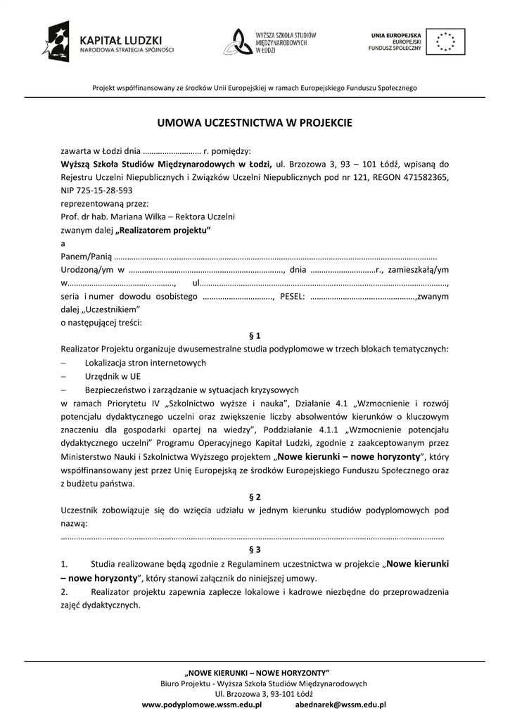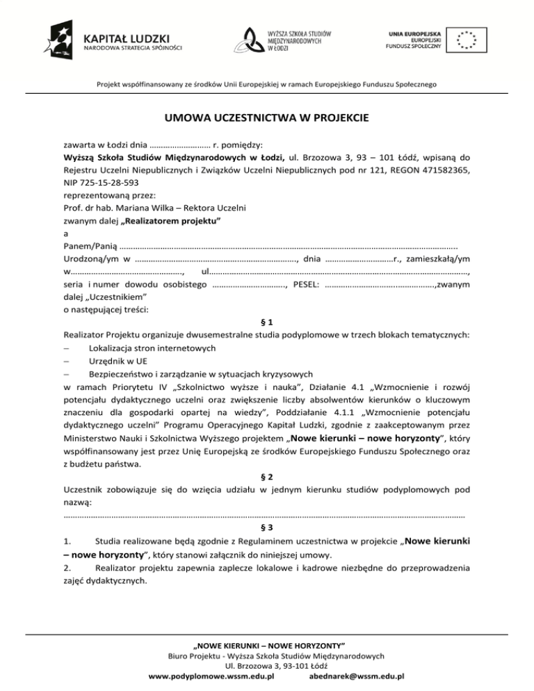 Projekt współfinansowany ze środków Unii Europejskiej w ramach Europejskiego Funduszu Społecznego UMOWA UCZESTNICTWA W PROJEKCIE zawarta w Łodzi dnia ……………………… r. pomiędzy: Wyższą Szkoła Studiów Międzynarodowych w Łodzi, ul. Brzozowa 3, 93 – 101 Łódź, wpisaną do Rejestru Uczelni Niepublicznych i Związków Uczelni Niepublicznych pod nr 121, REGON 471582365, NIP 725-15-28-593 reprezentowaną przez: Prof. dr hab. Mariana Wilka – Rektora Uczelni zwanym dalej „Realizatorem projektu” a Panem/Panią ………………………………………………………………………………………………………………………………….. Urodzoną/ym w ……………………………………….……………………., dnia …………………………r., zamieszkałą/ym w…………………………………………., ul……………………………………………………………………………………………………, seria i numer dowodu osobistego ………………………….., PESEL: …………………………..…………….,zwanym dalej „Uczestnikiem” o następującej treści: §1 Realizator Projektu organizuje dwusemestralne studia podyplomowe w trzech blokach tematycznych: Lokalizacja stron internetowych Urzędnik w UE Bezpieczeostwo i zarządzanie w sytuacjach kryzysowych w ramach Priorytetu IV „Szkolnictwo wyższe i nauka”, Działanie 4.1 „Wzmocnienie i rozwój potencjału dydaktycznego uczelni oraz zwiększenie liczby absolwentów kierunków o kluczowym znaczeniu dla gospodarki opartej na wiedzy”, Poddziałanie 4.1.1 „Wzmocnienie potencjału dydaktycznego uczelni” Programu Operacyjnego Kapitał Ludzki, zgodnie z zaakceptowanym przez Ministerstwo Nauki i Szkolnictwa Wyższego projektem „Nowe kierunki – nowe horyzonty”, który współfinansowany jest przez Unię Europejską ze środków Europejskiego Funduszu Społecznego oraz z budżetu paostwa. §2 Uczestnik zobowiązuje się do wzięcia udziału w jednym kierunku studiów podyplomowych pod nazwą: …………………………………………………………………………………………………………………………………………………………… §3 1. Studia realizowane będą zgodnie z Regulaminem uczestnictwa w projekcie „Nowe kierunki – nowe horyzonty”, który stanowi załącznik do niniejszej umowy. 2. Realizator projektu zapewnia zaplecze lokalowe i kadrowe niezbędne do przeprowadzenia zajęd dydaktycznych. „NOWE KIERUNKI – NOWE HORYZONTY” Biuro Projektu - Wyższa Szkoła Studiów Międzynarodowych Ul. Brzozowa 3, 93-101 Łódź www.podyplomowe.wssm.edu.pl [email protected] Projekt współfinansowany ze środków Unii Europejskiej w ramach Europejskiego Funduszu Społecznego §4 1. 2. 3. 1. 2. 3. a) b) c) d) 1. 1. 2. 3. Udział w projekcie jest odpłatny. Roczna opłata za udział w projekcie wynosi 1 100,00 zł (słownie: jeden tysiąc sto zł 00/100) i jest płatna jednorazowo nie później niż do dnia rozpoczęcia zajęd dydaktycznych. Opłata, o której mowa w § 4. pkt 2 nie podlega zwrotowi. §5 Uczestnik jest zobowiązany do uczestnictwa w wybranym przez siebie kierunku studiów podyplomowych i brania czynnego udziału w zajęciach, a w tym wypełniania testów kontrolujących postępy w nauce. Uczestnik jest zobowiązany do powiadomienia Realizatora projektu o jakichkolwiek zmianach dotyczących jego osoby (w szczególności dotyczących zmiany miejsca zamieszkania, zatrudnienia i danych osobowych) Uczestnik oświadcza, że: Posiada wykształcenie wyższe . Dane zawarte w formularzu zgłoszeniowym uczestnika projektu są zgodne z prawdą i nie uległy zmianie. Zapoznał się z Regulaminem uczestnictwa w projekcie „Nowe kierunki – nowe horyzonty”, akceptuje go i zobowiązuje się do jego przestrzegania. Został poinformowany, że projekt jest współfinansowany ze środków Unii Europejskiej w ramach Europejskiego Funduszu Społecznego. §6 Umowa zostaje zawarta na czas trwania studiów podyplomowych – dwa semestry §7 Spory między Stronami niniejszej umowy rozpatrywane będą przez sąd właściwy dla siedziby Uczelni. W sprawach nieuregulowanych niniejszą Umową oraz Regulaminem uczestnictwa w projekcie „Nowe kierunki – nowe horyzonty” mają zastosowanie przepisy kodeksu cywilnego. Umowę sporządzono w dwóch jednobrzmiących egzemplarzach. REALIZATOR PROJEKTU …………………………………………………………… UCZESTNIK PROJEKTU ……………………………………………………. „NOWE KIERUNKI – NOWE HORYZONTY” Biuro Projektu - Wyższa Szkoła Studiów Międzynarodowych Ul. Brzozowa 3, 93-101 Łódź www.podyplomowe.wssm.edu.pl [email protected]