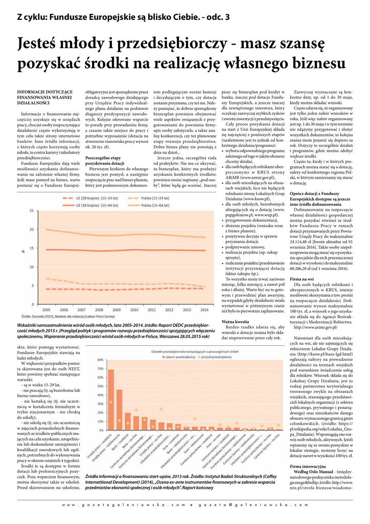 gazeta goleniowska - reklamy i ogłoszenia 18 21.10.2016 r. Z cyklu: Fundusze Europejskie są blisko Ciebie. - odc. 3 Jesteś młody i przedsiębiorczy - masz szansę pozyskać środki na realizację własnego biznesu INFORMACJE DOTYCZĄCE FINANSOWANIA WŁASNEJ DZIAŁALNOŚCI Informacje o finansowaniu najczęściej uzyskuje się w urzędach pracy, chociaż osoby rozpoczynające działalność często wykorzystują w tym celu także strony internetowe banków. Inne źródła informacji, z których często korzystają osoby młode, to centra kariery i inkubatory przedsiębiorczości. Fundusze Europejskie dają wiele możliwości uzyskania dofinansowania na założenie własnej firmy. Jeśli masz pomysł na biznes, warto postarać się o Fundusze Europej- obligatoryjne jest sporządzenie przez doradcę zawodowego działającego przy Urzędzie Pracy indywidualnego planu działania na podstawie diagnozy predyspozycji zawodowych. Kolejne oferowane wsparcie to porady przy prowadzeniu firmy, a czasem także miejsce do pracy i potrzebne wyposażenie (dotacja na stworzenie stanowiska pracy wynosi ok. 20 tys. zł). Poszczególne etapy pozyskiwania dotacji Pierwszym krokiem do własnego biznesu jest pomysł, a następnie rozpoczęcie prac nad biznes planem, który jest podstawowym dokumen- tem podlegającym ocenie komisji i decydującym o tym, czy dotacja zostanie przyznana, czy też nie. Należy pamiętać, że dobrze sporządzony biznesplan powinien obejmować wiele aspektów związanych z przygotowaniami do powstania firmy: opis osoby założyciela, a także analizę konkurencji, czy też planowane etapy rozwoju przedsiębiorstwa. Dobre biznes plany nie powstają z dnia na dzień... Jeszcze jedna, szczególna rada od praktyków: Nie ma co ukrywać, że biznesplan, który ma posłużyć uzyskaniu konkretnych środków, powinien zostać napisany „pod osoby”, które będą go oceniać. Inaczej Wskaźniki samozatrudnienia wśród osób młodych, lata 2005-2014. źródło: Raport OEDC przedsiębiorczość młodych 2015 r. (Przegląd polityk i programów rozwoju przedsiębiorczości sprzyjających włączeniu społecznemu, Wspieranie przedsiębiorczości wśród osób młodych w Polsce, Warszawa 28.05.2015 rok) skie, które pomogą wystartować. Fundusze Europejskie stawiają na ludzi młodych. W większości przypadków pomoc ta skierowana jest do osób NEET, które powinny spełniać następujące warunki: - są w wieku 15-29 lat, - nie pracują (tj. są bezrobotne lub bierne zawodowo), - nie kształcą się (tj. nie uczestniczą w kształceniu formalnym w trybie stacjonarnym - nie chodzą do szkoły), - nie szkolą się (tj. nie uczestniczą w zajęciach pozaszkolnych finansowanych ze środków publicznych mających na celu uzyskanie, uzupełnienie lub doskonalenie umiejętności i kwalifikacji zawodowych lub ogólnych, potrzebnych do wykonywania pracy w okresie ostatnich 4 tygodni). Środki te są dostępne w formie dotacji lub preferencyjnych pożyczek. Poza wsparciem finansowym, można skorzystać także ze szkoleń. Przed skierowaniem na szkolenie, pisze się biznesplan pod kredyt w banku, inaczej pod dotacje Funduszy Europejskich, a jeszcze inaczej dla zewnętrznego inwestora, który oczekuje zazwyczaj szybkich zysków i zwrotu inwestycji z przedsięwzięcia. Cały proces pozyskania dotacji na start z Unii Europejskiej składa się najczęściej z poniższych etapów (uzależnione jest to jednak od konkretnego działania/programu): • wyboruodpowiedniegoprogramu zależnego od tego w jakim obszarze chcemy działać, •dlaosóbbędącychrolnikamiubezpieczonymi w KRUS strony ARiMR (www.armir.gov.pl), •dlaosóbmieszkającychnaobszarach wiejskich, lecz nie będących rolnikami strony Lokalnych Grup Działania (www.ksow.pl), • dla osób młodych, bezrobotnych ubiegających się o dotację (www. pupgoleniow.pl, www.wup.pl). •przygotowaniedokumentacji, • złożenieprojektu(wnioskuwraz z biznes planem), • pozytywnadecyzjawsprawie przyznania dotacji. •podpisywanieumowy, •realizacjaprojektu(np.zakup sprzętu), •rozliczenieprojektu(przedstawienie instytucji przyznającej dotację faktur zakupu itp.). To wszystko może trwać zarówno miesiąc, kilka miesięcy, a nawet pół roku i dłużej. Warto być na to gotowym i przewidzieć plan awaryjny, na wypadek gdyby działalność miała wystartować w późniejszym czasie niż było to pierwotnie zaplanowane. Ważna kwestia Bardzo rzadko zdarza się, aby wnioski o dotacje można było składać nieprzerwanie przez cały rok. Źródła informacji o finansowaniu start-upów, 2013 rok. Źródło: Instytut Badań Strukturalnych (Coffey Internattional Development) (2014), „Ocena ex-ante instrumentów finansowych w zakresie wsparcia przedmiotów ekonomii społecznej i osób młodych”. Raport końcowy w w w . g a z e t a g o l e n i o w s k a . c o m l Zazwyczaj wyznaczane są konkretne daty, np. od 1 do 30 maja, kiedy można składać wnioski. Często zdarza się, że organizowany jest tylko jeden nabór wniosków w roku. Jeśli więc nabór organizowany jest np. 1 do 30 maja i w tym terminie nie zdążymy przygotować i złożyć wszystkich dokumentów, to kolejna szansa może pojawić się dopiero za rok. Dotyczy to szczególnie działań i programów, gdzie można zdobyć większe środki. Często to, kiedy i w których programach można starać się o dotację, zależy od konkretnego regionu Polski, w którym zamierzamy się starać o dotację. Oprócz dotacji z Funduszy Europejskich dostępne są jeszcze inne źródła dofinansowania Dofinansowanie na rozpoczęcie własnej działalności gospodarczej można pozyskać również ze środków Funduszu Pracy w ramach dotacji przyznawanych przez Powiatowe Urzędy Pracy do maksymalnie 24.114,48 zł [kwota aktualna od 01 września 2016]. Także osoby niepełnosprawne mogą starać się o pozyskanie specjalnie dla nich przeznaczonej dotacji w wysokości do maksymalnie 60.286,20 zł (od 1 wrze