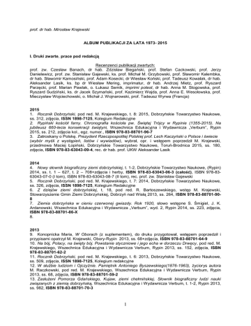 prof. dr hab. Mirosław Krajewski ALBUM PUBLIKACJI ZA LATA 1973- 2015 I. Druki zwarte, prace pod redakcją Recenzenci publikacji zwartych: prof. zw. Czesław Banach, dr hab. Zdzisław Biegański, prof. Stefan Cackowski, prof. Jerzy Danielewicz, prof. zw. Stanisław Gajewski, ks. prof. Michał M. Grzybowski, prof. Sławomir Kalembka, dr hab. Sławomir Kamosiński, prof. Adam Kosecki, dr Wiesław Koński, prof. Tadeusz Kowalak, dr hab. Aleksander Lasik, ks. bp dr Wiesław Mering, imprimatur, dr hab. Andrzej Mietz, prof. Ryszard Parzęcki, prof. Marian Pawlak, o. Łukasz Semik, imprimi potest, dr hab. Anna M. Stogowska, prof. Ryszard Sudziński, ks. dr Jacek Szymański, prof. Kazimierz Wajda, prof. Anna E. Wesołowska, prof. Mieczysław Wojciechowski, o. Michał J. Wojnarowski, prof. Tadeusz Wyrwa (Francja) 2015 1. Rocznik Dobrzyński, pod red. M. Krajewskiego, t. 8: 2015, Dobrzyńskie Towarzystwo Naukowe, ss. 312, zdjęcia, ISSN 1898-7125, Kolegium Redakcyjne 2. Rypiński kościół farny. Chronografia kościoła pw. Świętej Trójcy w Rypinie (1355-2015). Na jubileusz 660-lecia konsekracji świątyni, Wszechnica Edukacyjna i Wydawnicza „Verbum”, Rypin 2015, ss. 212, zdjęcia kol., egz. numer., ISBN 978-83-88701-96-7 3. Zatroskany o Polskę. Prezydent Rzeczpospolitej Polskiej prof. Lech Kaczyński o Polsce i świecie (wybór myśli z wystąpień, listów i wywiadów), wybrał, opr. i wstępem poprzedził M. Krajewski, przedmowa Maciej Łopiński, Dobrzyńskie Towarzystwo Naukowe, Toruń-Brodnica 2015, ss. 180, zdjęcia, ISBN 978-83-63043-09-4, rec. dr hab. prof. UKW Aleksander Lasik 2014 4. Nowy słownik biograficzny ziemi dobrzyńskiej, t. 1-2, Dobrzyńskie Towarzystwo Naukowe, (Rypin) 2014, ss. t. 1 – 627, t. 2 – 708+zdjęcia i herby, ISBN 978-83-63043-06-3 (całość), ISBN 978-8363043-07-0 (I tom), ISBN 978-83-63043-08-7 (II tom), rec. prof. zw. Stanisław Gajewski 5. Rocznik Dobrzyński, pod red. M. Krajewskiego, t. 7: 2014, Dobrzyńskie Towarzystwo Naukowe, ss. 326, zdjęcia, ISSN 1898-7125, Kolegium Redakcyjne 6. Z dziejów ziemi dobrzyńskiej, t. 18, pod red. R. Bartoszewskiego, wstęp M. Krajewski, Stowarzyszenie Gmin Ziemi Dobrzyńskiej, Dobrzyń nad Wisłą 2013, ss. 264, ISBN 978-83-88701-908 7. Ziemia dobrzyńska w cieniu czerwonej gwiazdy. Rok 1920, słowo wstępne S. Śmigiel, J. K. Ardanowski, Wszechnica Edukacyjna i Wydawnicza „Verbum”, wyd. 2, Rypin 2014, ss. 223, zdjęcia, ISBN 978-83-88701-86-X 8. 2013 9. Konopnicka Maria, W Oborach (z suplementem), do druku przygotował, wstępem poprzedził i przypisami opatrzył M. Krajewski, Obory-Rypin 2013, ss. 68+zdjęcia, ISBN 978-83-88701-64-9 10. Na bój, Polacy, na święty bój. Powstanie styczniowe i jego echa w dorzeczu Drwęcy, pod red. M. Krajewskiego, Wszechnica Edukacyjna i Wydawnicza Verbum, Rypin 2013, ss. 152, zdjęcia, ISBN 978-83-88701-62-2 11. Rocznik Dobrzyński, pod red. M. Krajewskiego, t. 6: 2013, Dobrzyńskie Towarzystwo Naukowe, ss. 509, zdjęcia, ISSN 1898-7125, Kolegium redakcyjne 12. W służbie ludziom i Ojczyźnie. Pamiętnik Antoniego Byszewskiego(1876-1963), życiorys autora M. Raczkowski, pod red. M. Krajewskiego, Wszechnica Edukacyjna i Wydawnicza Verbum, Rypin 2013, ss. 68, zdjęcia, ISBN 978-83-88701-59-2 13. Zasłużeni Pomorza Gdańskiego, Kujaw, ziemi chełmińskiej. Słownik biograficzny ludzi nauki związanych z ziemią dobrzyńską, Wszechnica Edukacyjna i Wydawnicza Verbum, t. 1-2, Rypin 2013, ss. 982, ISBN 978-83-88701-70-3 1 14. Z dziejów ziemi dobrzyńskiej, t. 17, pod red. R. Bartoszewskiego, wstęp M. Krajewski, Stowarzyszenie Gmin Ziemi Dobrzyńskiej, Dobrzyń nad Wisłą 2013, ss. 211, ISBN 978-83-88701-584 15. Z krwi Waszej posiew wolności. Ludzie i miejsca powstania styczniowego na ziemi dobrzyńskiej, Dobrzyńskie Towarzystwo Naukowe, Rypin 2013, s. 357, zdjęcia, ISBN 978-83-63043-04-9 2012 16. Dama Niezłomna. Maria Sobocińska (1920-2012). Biografia wpisana w okupacyjne dzieje Skępego, Dobrzyńskie Towarzystwo Naukowe, Rypin-Skępe 2012, ss. 217, zdjęcia, rec. dr hab. prof. UKW Aleksander Lasik, ISBN 978-83-630043-03-2 17. Rocznik Dobrzyński, t. 5: 2012, pod red. M. Krajewskiego, Dobrzyńskie Towarzystwo Naukowe, Rypin 2012, ss. 354, zdjęcia, ISSN 1898-7125, Kolegium Redakcyjne 18. Rypinie grodzie cichy. Albumowa monografia miasta, Wszechnica Edukacyjna i Wydawnicza „Verbum”, Rypin 2012, ss. 374+zdjęcia, ISBN 978-88701-54-1 19. Samorząd gospodarczy i zawodowy w Polsce. Studium historyczno-prawne, Dobrzyńskie Towarzystwo Naukowe, Bydgoszcz 2012, ss. 235, ISBN 978-83-63043-02-5, rec. dr hab. prof. UKW Sławomir Kamosiński 20. Z dziejów ziemi dobrzyńskiej, t. 16, pod red. R. Bartoszewskiego, wstęp M. Krajewski, Stowarzyszenie Gmin Ziemi Dobrzyńskiej, Dobrzyń nad Wisłą 2012, ss. 232, ISBN 978-83-88701-584 2011 21. Deo et Matris. Almanach religijnej poezji ziemi dobrzyńskiej, wybrał, opr., wstępem i przypisami opatrzył M. Krajewski, „Biblioteka Dobrzyńska”, t. 4, Wszechnica Edukacyjna i Wydawnicza "Verbum", Rypin 2011, ss. 172, zdjęcia, ISBN 978-83-88701-46-7 22. Dmochowski Franciszek Salezy, Przekleństwo matki. Opowiadanie na rzeczywistych faktach osnowane, wstępem i przypisami opatrzył M. Krajewski, "Biblioteka Dobrzyńska", t. 2, Wszechnica Edukacyjna i Wydawnicza "Verbum", Rypin 2011, ss. 238, zdjęcia, ISBN 8-83-8701-44-3 23. Gawin-Waśniewska Janina, Morituri te salutant ave Patria, wstępem poprzedził, przypisami śródtytułami opatrzył M. Krajewski, "Biblioteka Dobrzyńska" t. 3, Wszechnica Edukacyjna i Wydawnicza "Verbum", Rypin 2011, ss. 179, zdjęcia, ISBN 978-83-701-45-0 24. Rocznik Dobrzyński, t. 4, pod red. M. Krajewskiego, Dobrzyńskie Towarzystwo Naukowe, Rypin 2011, ss. 382, zdjęcia, ISSN 1898-7125, Kolegium redakcyjne 25. Stulecie orkiestry dętej w Dobrzyniu nad Wisłą, opr. red. M. Krajewski, Dobrzyński Dom Kultury "Żak", Dobrzyń nad Wisłą 2011, ss. 82, ISBN 978-83-88701-5107 26. Universitas w nauczaniu J