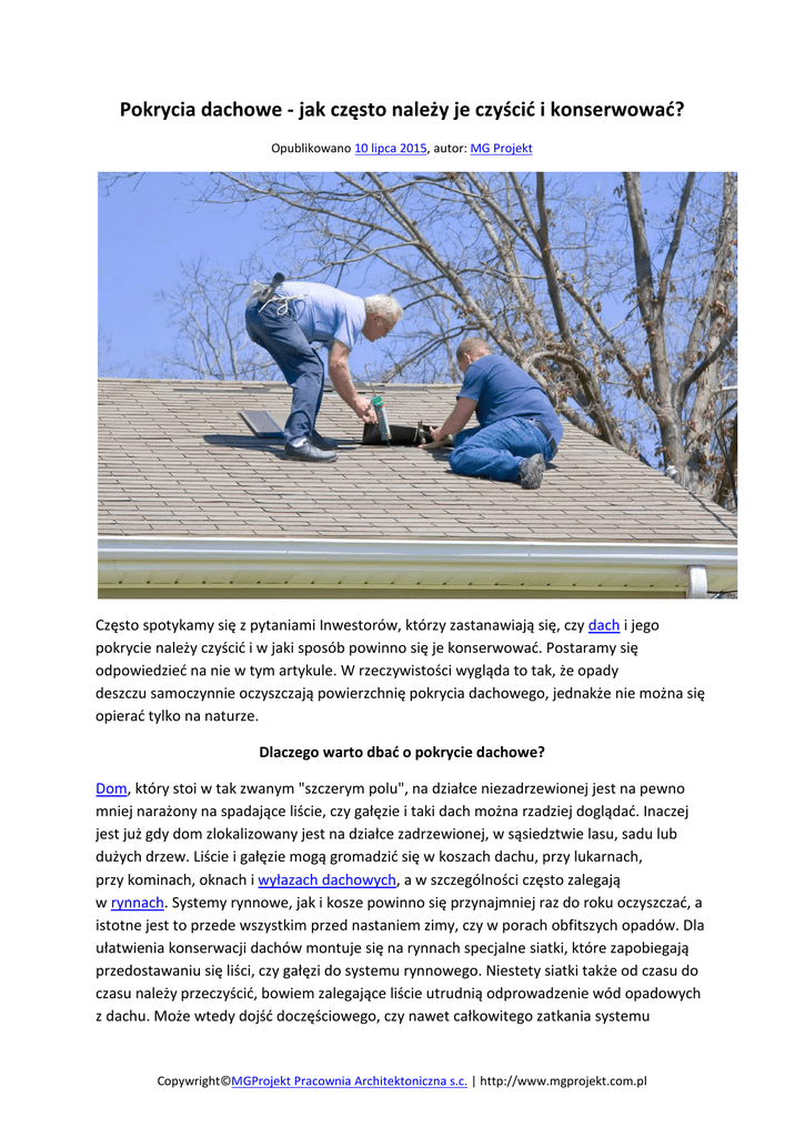 Pokrycia dachowe - jak często należy je czyścić i konserwować? Opublikowano 10 lipca 2015, autor: MG Projekt Często spotykamy się z pytaniami Inwestorów, którzy zastanawiają się, czy dach i jego pokrycie należy czyścić i w jaki sposób powinno się je konserwować. Postaramy się odpowiedzieć na nie w tym artykule. W rzeczywistości wygląda to tak, że opady deszczu samoczynnie oczyszczają powierzchnię pokrycia dachowego, jednakże nie można się opierać tylko na naturze. Dlaczego warto dbać o pokrycie dachowe? Dom, który stoi w tak zwanym "szczerym polu", na działce niezadrzewionej jest na pewno mniej narażony na spadające liście, czy gałęzie i taki dach można rzadziej doglądać. Inaczej jest już gdy dom zlokalizowany jest na działce zadrzewionej, w sąsiedztwie lasu, sadu lub dużych drzew. Liście i gałęzie mogą gromadzić się w koszach dachu, przy lukarnach, przy kominach, oknach i wyłazach dachowych, a w szczególności często zalegają w rynnach. Systemy rynnowe, jak i kosze powinno się przynajmniej raz do roku oczyszczać, a istotne jest to przede wszystkim przed nastaniem zimy, czy w porach obfitszych opadów. Dla ułatwienia konserwacji dachów montuje się na rynnach specjalne siatki, które zapobiegają przedostawaniu się liści, czy gałęzi do systemu rynnowego. Niestety siatki także od czasu do czasu należy przeczyścić, bowiem zalegające liście utrudnią odprowadzenie wód opadowych z dachu. Może wtedy dojść doczęściowego, czy nawet całkowitego zatkania systemu Copywright©MGProjekt Pracownia Architektoniczna s.c. | http://www.mgprojekt.com.pl rynnowego. Niedrożne rynny, czy rury spustowe mogą wtedy ulec zniszczeniu, czy korozji co doprowadzi w konsekwencji do zaciekania elewacji domu, a zimą do oblodzeń. Wiosną mogą wtedy zaistnieć niebezpieczne dla elewacji jej miejscowe rozsadzenia i zniszczenia tynku, czy okładzin lub nawet ich odpadnięcie. Mogą także pojawić się wykwity i przebarwienia na elewacjach. Nieoczyszczone elementy dachu jak kosze, czy miejsca przy kominach, oknach połaciowych, czy śniegołapach mogą spowodować zniszczenie nawierzchni dachu i jego przeciekanie. Brak troski o pielęgnację pokrycia dachowego może także doprowadzić do rozwoju pleśni, czy mchów, co dodatkowo oszpeci dach, czy pośrednio elewacje. Jak często należy sprawdzać stan dachu? Standardowe kontrole wykonuje się poprzez obejrzenie dachu i jego pokrycia przynajmniej raz na rok, a kontrole dokładniejsze należy przeprowadzić co pięć lat. Wówczas sprawdza się stan pokrycia dachowego, jego powłoki izolacyjnej, czy koloru. Wykonuje się to bez względu na rodzaj pokrycia oraz przez cały okres gwarancji wydanej przez producenta na dany materiał pokryciowy. Przy szczegółowej kontroli trzeba także zwrócić szczególną uwagę na: 1. stan krawędzi dachu, 2. stan koszy, 3. stan sytemu rynnowego. Copywright©MGProjekt Pracownia Architektoniczna s.c. | http://www.mgprojekt.com.pl Ważne, aby sprawdzić czy nie pojawiły się przebarwienia, rdza lub pęknięcia. W przypadku dachówek, sprawdza się miedzy innymi stan zabarwienia oraz czy nie wystąpiły ukruszenia, pęknięcia lub odłamki materiału. Wadliwe dachówki wymienia się na nowe. Istotnym jest również czy na powłoce dachówek nie pojawiły się zakwity pleśni, a nawet mchu. W przypadku pokryć z blachy ocynkowanej niemalowanej często po kilku latach pojawia się rdza, a pokrycie matowieje tracąc szczelność i wygląd. Taki dach należy pomalować odpowiednimi farbami, przeznaczonymi do dachów z blachy ocynkowanej. Przy dachu pokrytym blachą malowaną fabrycznie, czy powlekaną, należy obejrzeć stan powłoki, jej zabarwienia i sprawdzić czy na materiale nie pojawiły się odbarwienia oraz czy powłoka nie odpada miejscowo kawałkami. Warto zwrócić uwagę, czy powłoka nie posiada pęknięć, czy też nie pojawiły się pęcherze. Jeśli tak się stało, pokrycie należy poddać naprawie, którą najlepiej zlecić fachowej firmie. Mniejsze naprawy można wykonać we własnym zakresie. Zazwyczaj wystarczy jedno lub dwukrotne malowanie w miejscu odprysku farby, czy powłoki w zależności od głębokości ubytku (przy głębszym uszkodzeniu zaleca się malowanie podwójną warstwą). Pamiętajmy, że zawsze należy dobrać odpowiednią farbę przeznaczoną do naprawy pokryć, czy powłok dachowych a miejsca ubytków maluje się małym pędzelkiem z miękkim włosiem, a następnie sprawdza, czy farba lub powłoka odpowiednio przywiera do nawierzchni pokrycia. Prace takie, wykonywane we własnym zakresie są jak najbardziej wskazane, bowiem ignorując drobne ubytki można doprowadzić Copywright©MGProjekt Pracownia Architektoniczna s.c. | http://www.mgprojekt.com.pl do ich powiększenia i wtedy naprawę trzeba będzie powierzyć fachowcom, co znacząco zwiększy koszty prac remontowych. Przy dachach z papy lub bitumu, sprawdza się czy materiał przy pracy w wysokich różnicach temperatur nie stracił swoich właściwości izolacyjnych. Mogą tutaj pojawić się przetarcia materiału, ubytki, dziury i pęknięcia. Szczególnie narażone na to są: 1. 2. 3. 4. kosze, kalenice, miejsca przy lukarnach, okolice kominów. Zniszczone miejscowo pokrycie wymienia się poprzez montaż nowej papy we fragmentach. Przy dużych zniszczeniach kładzie się na nowo całe pokrycie. Konserwacja dachu Brudny, czy zakurzony dach można samemu oczyścić przy użyciu miękkiej szczotki i wody pod ciśnieniem. Przy większych i trudniejszych zabrudzeniach można zastosować detergenty ale odpowiednio dobrane i specjalnie przeznaczone do danego rodzaju pokrycia. Dach oraz system rynien przepłukuje się od góry, zgodnie z naturalnym kierunkiem spływu, bo w przeciwnym wypadku można doprowadzić do przecieków pod blachą, papą czy dachówkami. Copywright©MGProjekt Pracownia Architektoniczna s.c. | http://www.mgprojekt.com.pl Dachu bez względu na rodzaj pokr