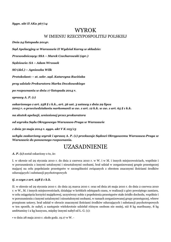 Sygn. akt II AKa 367/14 WYROK W IMIENIU RZECZYPOSPOLITEJ POLSKIEJ Dnia 24 listopada 2014r. Sąd Apelacyjny w Warszawie II Wydział Karny w składzie: Przewodniczący: SSA – Marek Czecharowski (spr.) Sędziowie: SA – Adam Wrzosek SO (del.) – Agnieszka Wilk Protokolant: – st. sekr. sąd. Katarzyna Rucińska przy udziale Prokuratora Marka Deczkowskiego po rozpoznaniu w dniu 17 listopada 2014 r. sprawy A. P. (1) oskarżonego z art. 258 § 1 k.k., art. 56 ust. 3 ustawy z dnia 29 lipca 2005 r. o przeciwdziałaniu narkomanii w zw. z art. 12 k.k. w zw. z art. 65 § 1 k.k. na skutek apelacji, wniesionej przez prokuratora od wyroku Sądu Okręgowego Warszawa-Praga w Warszawie z dnia 30 maja 2014 r. sygn. akt V K 103/13 uchyla zaskarżony wyrok i sprawę A. P. (1) przekazuje Sądowi Okręgowemu Warszawa-Praga w Warszawie do ponownego rozpoznania. UZASADNIENIE A. P. (1) został oskarżony o to, że: I. w okresie od 29 stycznia 2010 r. do dnia 2 czerwca 2010 r. w W. i w M. i innych miejscowościach, wspólnie i w porozumieniu z innymi ustalonymi i nieustalonymi osobami, brał udział w zorganizowanej grupie przestępczej mającej na celu popełnianie przestępstw w szczególności związanych z obrotem znacznymi ilościami środków odurzających i substancji psychotropowych tj. o czyn z art. 258 § 1 k.k. II. w okresie od 29 stycznia 2010 r. do dnia 25 marca 2010 r. oraz od dnia 26 maja 2010 r. do dnia 2 czerwca 2010 r. w W., M. i innych miejscowościach, działając w krótkich odstępach czasu, w realizacji z góry powziętego zamiaru, w celu osiągnięcia korzyści majątkowej, uczyniwszy sobie z popełnienia przestępstw stałe źródło dochodu, wspólnie i w porozumieniu z innymi ustalonymi i nieustalonymi osobami, w ramach zorganizowanej grupy przestępczej, wbrew przepisom ustawy, brał udział w obrocie znacznymi ilościami środków odurzających i substancji psychotropowych w ten sposób, że nabył, a następnie wielokrotnie udzielał różnym osobom nie mniej, niż 8 kg marihuany, 8 kg amfetaminy i 2 kg haszyszu, między innymi nabył od Ł. G. (1): • w dniu 28 maja 2010 r. około godz. 19.17 w W. - 2 kilogramy marihuany; • w dniu 9 lutego 2010 r., ok. godz. 18.00 - 1 kg marihuany i 1 kg amfetaminy oraz ok. godz. 09.08 - 2 kg haszyszu, • w dniu 13 lutego 2010 r. ok. godz. 5.00 -1 kg marihuany i 1 kg amfetaminy, • w dniu 6 marca 2010 r. ok. godz. 20.52 w M. - 2 kg marihuany, • w dniu 10 marca 2010 r. ok. godz. 17.33 w W. -1 kg marihuany i 1 kg amfetaminy, • w dniu 20 marca 2010 r. ok. godz. 19.50 w M. - 2 kg amfetaminy; • w dniu 23 marca 2010 r. ok. godz. 18.23 w M. - 2 kg marihuany; • w dniu 25 marca 2010 r. ok. godz. 19.50 w W. przy ul. (...) -1 kg amfetaminy i 1 kg marihuany; tj. o czyn z art. 56 ust. 3 ustawy z dnia 29 lipca 2005 r. o przeciwdziałaniu narkomanii w zw. z art. 12 k.k. w zw. z art. 65 § 1 k.k. Sąd Okręgowy Warszawa – Praga w Warszawie wyrokiem z dnia 30 maja 2014 r. (sygn. akt V K 103/13) uniewinnił oskarżonego od popełnienia obu zarzucanych mu czynów; kosztami procesu obciążył Skarb Państwa, zaś na rzecz oskarżonego zasądził stosowną kwotę z tytułu zwrotu kosztów obrony. Wyrok powyższy zaskarżył prokurator zarzucając mu: 1. obrazę przepisów postępowania mającą wpływ na treść wyroku, a mianowicie art 19 ust. 1 i 3 ustawy o Policji polegającą na błędnej wykładni powyższego przepisu i uznaniu, iż kontrola operacyjna w stosunku do A. P. (1) została zarządzona z naruszeniem art. 19 ust. 3 powyższej ustawy, co w konsekwencji skutkowało błędnym przekonaniem, iż dowody w postaci materiałów kontroli operacyjnej (...) krypt. (...)i (...) krypt. (...) były uzyskane bez zachowania ustawowych warunków ich dopuszczalności i w efekcie uniewinnieniem oskarżonego od popełnienia zarzucanych mu czynów podczas, gdy prawidłowa wykładnia powyższego przepisu winna doprowadzić Sąd do stwierdzenia, że materiały kontroli operacyjnej pozyskano i wykorzystano w zakresie A. P. (1) w sposób zgodny z prawem, z zachowaniem obowiązujących procedur; 2. obrazę przepisów postępowania, a mianowicie 7 k.p.k. i 410 k.p.k. mającą wpływ na treść orzeczenia, polegającą na kształtowaniu przez Sąd przekonania o niewinności oskarżonego odnośnie zarzucanych mu czynów na podstawie ujawnionych w sprawie dowodów, ocenionych w sposób dowolny, z naruszeniem zasad prawidłowego rozumowania, wskazań wiedzy i doświadczenia życiowego, całkowite pominięcie przez Sąd I instancji dowodów i okoliczności przemawiających na niekorzyść oskarżonego i oparcie podstawy faktycznej wyroku jedynie na części okoliczności ujawnionych w toku rozprawy głównej, bez uwzględnienia najistotniejszych dowodów: utrwalonych w trakcie kontroli operacyjnej rozmów, ekspertyzy fonoskopijnej, opinii z zakresu slangu narkotykowego oraz zeznań świadków J. K., M. S. i P. K. podczas, gdy zebrany w sprawie materiał dowodowy oceniony prawidłowo i wszechstronnie z uwzględnieniem dyrektyw wskazanych art. 7 k.p.k. prowadzić winien do oparcia rozstrzygnięcia na całokształcie dowodów zgromadzonych w sprawie, w szczególności zaś na wymienionych powyżej dowodach, które pominięto, w konsekwencji prowadząc do wniosku o sprawstwie i winie oskarżonego za zarzucone mu przestępstwa; 3. błąd w ustaleniach faktycznych przyjętych za podstawę orzeczenia polegający uznaniu, iż zgromadzone w niniejszej sprawie dowody nie dają podstaw do uznania oskarżonego A. P. (1) za winnego popełnienia zarzucanych mu przestępstw, podczas gdy prawidłowa ocena całokształtu materiału dowodowego, zwłaszcza błędnie pominiętych przez Sąd przy poczynieniu ustaleń faktycznych dowodów takich jak treści rozmów zarejestrowanych podczas kontroli operacyjnej, ekspertyzy fonoskopijnej, opinii z zakresu slangu narkotykowego oraz zeznań świadków, prowadzi niechybnie do wniosku zgoła przeciwnego. W konkluzji skarżący wniósł o uchyl