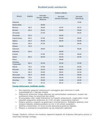 Rozkład jazdy autokarów Godzina odjazdu Miasto Dopłata kierunek: Korsyka, Włochy, Słowenia kierunek: Ukraina, Rumunia Białystok kierunek: Petersburg 13:00 Bielsko Biała 09:00 Bochnia 40 zł 06:00 07:45 03:15 Brzesko 40 zł 05:45 08:00 03:00 Chrzanów 07:30 04:45 Chrzanów 50 zł Częstochowa 60 zł 07:00 05:00 06:00 Dębica 60 zł 04:30 08:30 02:00 Gliwice 40 zł 07:30 Gliwice 70 zł Katowice Katowice 04:30 05:30 08:00 60 zł Kraków Opole 06:30 80 zł 05:00 06:00 07:00 07:00 04:00 06:30 04:30 03:30 Pilzno 09:00 Piotrków Trybunalski 80 zł 05:30 03:30 07:00 Rybnik 70 zł 07:00 05:00 04:00 Rzeszów 70 zł 03:30 08:00 01:00 Tarnów 60 zł 05:00 08:45 02:30 Warszawa 90 zł 04:00 02:00 09:00 Wodzisław Śląski 70 zł 06:30 04:30 03:30 Wrocław 90 zł 05:00 03:00 02:00 Żory 70 zł 07:15 05:15 04:15 Uwagi dotyczące rozkładu jazdy: Dla realizacji połączeń antenowych wymagane jest minimum 6 osób wyjeżdżających z danego miasta Połączenia antenowe mogą odbywać się samochodem osobowym, busem lub autokarem klasy turystycznej bez pilota W przypadku zbyt małej frekwencji na trasach antenowych, organizator może odwołać połączenie antenowe do 2 dni od daty rozpoczęcia imprezy Podane godziny wyjazdu są godzinami orientacyjnymi. Dokładne godziny oraz miejsca odjazdu zostaną podane na min 2 dni przed wyjazdem Zbiórka uczestników 15 minut przed planowaną godziną odjazdu Miejsca w autokarze przydzielane są wg kolejności zgłoszeń Uwaga: Osobom, którym nie możemy zapewnić dojazdu do Krakowa oferujemy pomoc w rezerwacji taniego noclegu.