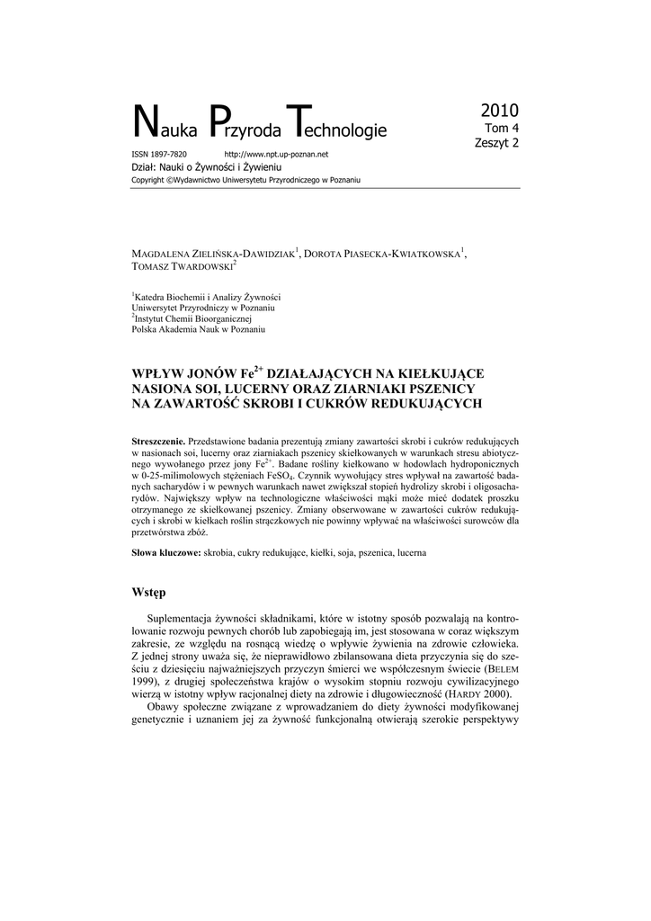 Nauka Przyroda Technologie ISSN 1897-7820 http://www.npt.up-poznan.net 2010 Tom 4 Zeszyt 2 Dział: Nauki o Żywności i Żywieniu Copyright ©Wydawnictwo Uniwersytetu Przyrodniczego w Poznaniu MAGDALENA ZIELIŃSKA-DAWIDZIAK1, DOROTA PIASECKA-KWIATKOWSKA1, TOMASZ TWARDOWSKI2 1 Katedra Biochemii i Analizy Żywności Uniwersytet Przyrodniczy w Poznaniu 2 Instytut Chemii Bioorganicznej Polska Akademia Nauk w Poznaniu WPŁYW JONÓW Fe2+ DZIAŁAJĄCYCH NA KIEŁKUJĄCE NASIONA SOI, LUCERNY ORAZ ZIARNIAKI PSZENICY NA ZAWARTOŚĆ SKROBI I CUKRÓW REDUKUJĄCYCH Streszczenie. Przedstawione badania prezentują zmiany zawartości skrobi i cukrów redukujących w nasionach soi, lucerny oraz ziarniakach pszenicy skiełkowanych w warunkach stresu abiotycznego wywołanego przez jony Fe2+. Badane rośliny kiełkowano w hodowlach hydroponicznych w 0-25-milimolowych stężeniach FeSO4. Czynnik wywołujący stres wpływał na zawartość badanych sacharydów i w pewnych warunkach nawet zwiększał stopień hydrolizy skrobi i oligosacharydów. Największy wpływ na technologiczne właściwości mąki może mieć dodatek proszku otrzymanego ze skiełkowanej pszenicy. Zmiany obserwowane w zawartości cukrów redukujących i skrobi w kiełkach roślin strączkowych nie powinny wpływać na właściwości surowców dla przetwórstwa zbóż. Słowa kluczowe: skrobia, cukry redukujące, kiełki, soja, pszenica, lucerna Wstęp Suplementacja żywności składnikami, które w istotny sposób pozwalają na kontrolowanie rozwoju pewnych chorób lub zapobiegają im, jest stosowana w coraz większym zakresie, ze względu na rosnącą wiedzę o wpływie żywienia na zdrowie człowieka. Z jednej strony uważa się, że nieprawidłowo zbilansowana dieta przyczynia się do sześciu z dziesięciu najważniejszych przyczyn śmierci we współczesnym świecie (BELEM 1999), z drugiej społeczeństwa krajów o wysokim stopniu rozwoju cywilizacyjnego wierzą w istotny wpływ racjonalnej diety na zdrowie i długowieczność (HARDY 2000). Obawy społeczne związane z wprowadzaniem do diety żywności modyfikowanej genetycznie i uznaniem jej za żywność funkcjonalną otwierają szerokie perspektywy 2 Zielińska-Dawidziak M., Piasecka-Kwiatkowska D., Twardowski T., 2010. Wpływ jonów Fe2+ działających na kiełkujące nasiona soi, lucerny oraz ziarniaki pszenicy na zawartość skrobi i cukrów redukujących. Nauka Przyr. Technol. 4, 2, #27. przed wzbogacaniem żywności w cenne składniki prozdrowotne poprzez stosowanie biofortyfikacji roślin klasycznymi metodami hodowlanymi, czyli poprzez naturalną selekcję odmian i zmianę warunków hodowli. Modyfikacje warunków uprawy roślin mogą wywoływać znaczne zmiany ich składu i wpływać na przydatność technologiczną surowca do przemysłowego przetwórstwa żywności. Wprowadzenie kiełków roślinnych do diety człowieka w celu jej wzbogacenia, szczególnie w witaminy, przeciwutleniacze i błonnik pokarmowy (ZIELIŃSKI i IN. 2005 a, 2005 b), jest stosowane od lat, głównie przez mieszkańców krajów Dalekiego Wschodu. Należy jednak pamiętać, że podczas kiełkowania nasion i ziarniaków dochodzi do szeregu istotnych zmian w składzie otrzymywanego materiału, w tym w składzie sacharydów (BAU i IN. 1997). Stosowanie skiełkowanych ziarniaków lub nasion jako dodatku w produktach zbożowych zawsze było związane z obawami dotyczącymi pogorszenia jakości mąki (DOJCZEW i IN. 2004, MIŚ 2002, NEETHIRAJAN i IN. 2007), dlatego należy prześledzić zmiany, jakie następują podczas kiełkowania w obecności silnego czynnika stresowego. W prezentowanych doświadczeniach badano, w jaki sposób wpływa wzrost obecności jonów żelaza podczas kiełkowania roślin na zawartość skrobi i cukrów redukujących. Sacharydy te w istotny sposób determinują przydatność stosowanego materiału jako suplementu do przetwórstwa zbóż. Dekstrynizacja skrobi przyczynia się bowiem do zmian lepkości, a wzrastająca ilość cukrów prostych i niektórych disacharydów powoduje intensyfikację zachodzących podczas przetwórstwa procesów fermentacji (DOJCZEW i IN. 2004). W badanych preparatach otrzymywanych ze skiełkowanych roślin strączkowych lub zbóż zostaje wymuszone silne wiązanie żelaza, w tym w formie o bardzo dużej biodostępności – w ferrytynie. Działanie silnego stresu abiotycznego uruchamia w komórkach mechanizmy obronne przed zwiększeniem w nich stężenia czynników prooksydacyjnych. Pociąga to za sobą również szereg zmian w procesach syntezy i rozkładu omawianych sacharydów. Materiał i metody Ziarniaki pszenicy zwyczajnej (Triticum aestivum L., odm. ‘Bombona’) otrzymano ze Stacji Hodowli Roślin Danko w Choryni, soi (Glycine max, odm. ‘Naviko’) z Katedry Genetyki i Hodowli Roślin Uniwersytetu Przyrodniczego w Poznaniu, natomiast lucerny (Medicago sativa L., odm. ‘Tula’) z Poznańskiej Hodowli Roślin w Tulcach. W celu przygotowania preparatu skiełkowanych nasion i ziarniaków poddawano je odkażaniu za pomocą 70-procentowego roztworu etanolu i pozostawiano na 12 h w roztworach FeSO4 o stężeniu 0-25 mM, a następnie wysiewano w kiełkownicach. Hodowlę kiełków prowadzono przez sześć-siedem dni, w pokojowej temperaturze, nawilżając każdego dnia rośliny za pomocą odpowiedniego roztworu FeSO4. Otrzymane kiełki wraz z nasionami i ziarniakami ponownie odkażano i suszono owiewowo do otrzymania wilgotności poniżej 10%. Wysuszony materiał mielono i przechowywano w szklanych, szczelnie zamkniętych naczyniach w temperaturze pokojowej. 3 Zielińska-Dawidziak M., Piasecka-Kwiatkowska D., Twardowski T., 2010. Wpływ jonów Fe2+ działających na kiełkujące nasiona soi, lucerny oraz ziarniaki pszenicy na zawartość skrobi i cukrów redukujących. Nauka Przyr. Technol. 4, 2, #27. Zawartość cukrów redukujących oznaczano metodą MILLERA (1959), natomiast skrobi – metodą HOLMA i IN. (1986). Do wykonania analiz statystycznych wyk