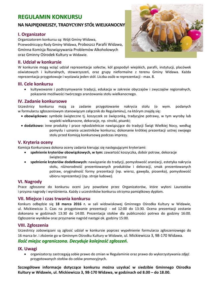 REGULAMIN KONKURSU NA NAJPIĘKNIEJSZY, TRADYCYJNY STÓŁ WIELKANOCNY I. Organizator Organizatorem konkursu są: Wójt Gminy Widawa, Przewodniczący Rady Gminy Widawa, Proboszcz Parafii Widawa, Gminna Komisja Rozwiązywania Problemów Alkoholowych oraz Gminny Ośrodek Kultury w Widawie. II. Udział w konkursie W konkursie mogą wziąć udział reprezentacje sołectw, kół gospodyń wiejskich, parafii, instytucji, placówek oświatowych i kulturalnych, stowarzyszeń, oraz grupy nieformalne z terenu Gminy Widawa. Każda reprezentacja przygotowuje i wystawia jeden stół. Liczba osób w reprezentacji - max. 8. III. Cele konkursu kultywowanie i podtrzymywanie tradycji, edukacja w zakresie obyczajów i zwyczajów regionalnych, pokazanie możliwości twórczego aranżowania stołu wielkanocnego. IV. Zadanie konkursowe Uczestnicy konkursu mają za zadanie przygotowanie nakrycia stołu (o wym. podanych w formularzu zgłoszeniowym stanowiącym załącznik do Regulaminu), na którym znajdą się: obowiązkowo: symbole świąteczne tj. koszyczek ze święconką, tradycyjne potrawy, w tym wyroby lub wypieki wielkanocne, dekoracje, np. stroiki, pisanki; dodatkowo: inne produkty i prace rękodzielnicze nawiązujące do tradycji Świąt Wielkiej Nocy, według pomysłu i uznania uczestników konkursu; dokonanie krótkiej prezentacji ustnej swojego stołu przed Komisją konkursową podczas imprezy. V. Kryteria oceny Komisja Konkursowa dokona oceny zadania kierując się następującymi kryteriami: spełnienie kryteriów obowiązkowych, w tym: zawartość koszyczka, dobór potraw, dekoracje świąteczne spełnienie kryteriów dodatkowych: nawiązanie do tradycji, pomysłowość aranżacji, estetyka nakrycia stołu, różnorodność prezentowanych produktów i dekoracji, smak prezentowanych potraw, oryginalność formy prezentacji (np. wiersz, gawęda, piosenka), pomysłowość ubioru reprezentacji (np. stroje ludowe). VI. Nagrody Prace zgłoszone do konkursu oceni jury powołane przez Organizatorów, które wyłoni Laureatów i przyzna nagrody i wyróżnienia. Każdy z uczestników konkursu otrzyma pamiątkowy dyplom. VII. Miejsce i czas trwania konkursu Konkurs odbędzie się 18 marca 2016 r. w sali widowiskowej Gminnego Ośrodka Kultury w Widawie, ul. Mickiewicza 3. Czas na przygotowanie prezentacji - od 12:00 do 13:30. Ocena prezentacji zostanie dokonana w godzinach 13:30 do 14:00. Prezentacja stołów dla publiczności potrwa do godziny 16:00. Ogłoszenie wyników oraz przyznanie nagród nastąpi ok. godziny 15:00. VIII. Zgłoszenia Uczestnicy zobowiązani są zgłosić udział w konkursie poprzez wypełnienie formularza zgłoszeniowego do 16 marca br. i złożenie go w Gminnym Ośrodku Kultury w Widawie, ul. Mickiewicza 3, 98-170 Widawa. Ilość miejsc ograniczona. Decyduje kolejność zgłoszeń. IX. Uwagi organizatorzy zastrzegają sobie prawo do zmian w Regulaminie oraz prawo do wykorzystywania zdjęć przygotowanych stołów do celów promocyjnych. Szczegółowe informacje dotyczące konkursu można uzyskać w siedzibie Gminnego Ośrodka Kultury w Widawie, ul. Mickiewicza 3, 98-170 Widawa, w godzinach od 8.00 – do 18.00.