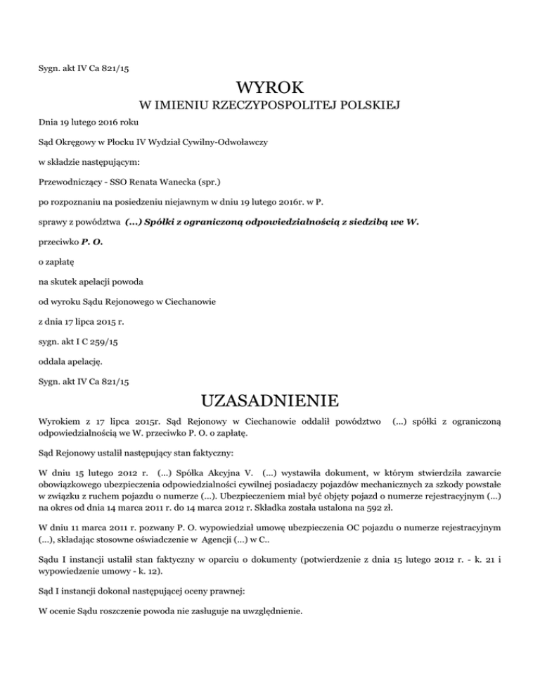 Sygn. akt IV Ca 821/15 WYROK W IMIENIU RZECZYPOSPOLITEJ POLSKIEJ Dnia 19 lutego 2016 roku Sąd Okręgowy w Płocku IV Wydział Cywilny-Odwoławczy w składzie następującym: Przewodniczący - SSO Renata Wanecka (spr.) po rozpoznaniu na posiedzeniu niejawnym w dniu 19 lutego 2016r. w P. sprawy z powództwa (...) Spółki z ograniczoną odpowiedzialnością z siedzibą we W. przeciwko P. O. o zapłatę na skutek apelacji powoda od wyroku Sądu Rejonowego w Ciechanowie z dnia 17 lipca 2015 r. sygn. akt I C 259/15 oddala apelację. Sygn. akt IV Ca 821/15 UZASADNIENIE Wyrokiem z 17 lipca 2015r. Sąd Rejonowy w Ciechanowie oddalił powództwo odpowiedzialnością we W. przeciwko P. O. o zapłatę. (...) spółki z ograniczoną Sąd Rejonowy ustalił następujący stan faktyczny: W dniu 15 lutego 2012 r. (...) Spółka Akcyjna V. (...) wystawiła dokument, w którym stwierdziła zawarcie obowiązkowego ubezpieczenia odpowiedzialności cywilnej posiadaczy pojazdów mechanicznych za szkody powstałe w związku z ruchem pojazdu o numerze (...). Ubezpieczeniem miał być objęty pojazd o numerze rejestracyjnym (...) na okres od dnia 14 marca 2011 r. do 14 marca 2012 r. Składka została ustalona na 592 zł. W dniu 11 marca 2011 r. pozwany P. O. wypowiedział umowę ubezpieczenia OC pojazdu o numerze rejestracyjnym (...), składając stosowne oświadczenie w Agencji (...) w C.. Sądu I instancji ustalił stan faktyczny w oparciu o dokumenty (potwierdzenie z dnia 15 lutego 2012 r. - k. 21 i wypowiedzenie umowy - k. 12). Sąd I instancji dokonał następującej oceny prawnej: W ocenie Sądu roszczenie powoda nie zasługuje na uwzględnienie. Sąd Rejonowy podniósł, że (...) spółka z ograniczoną odpowiedzialnością we W. domagała się od pozwanego P. O. zasądzenia kwoty 813,39 zł, którą miała stanowić wierzytelność przysługująca pierwotnie (...) S.A. V. (...). Pozwany wnosił o oddalenie powództwa i wskazał, że nie przedłużał umowy ubezpieczenia OC swojego pojazdu. Sąd zwrócił uwagę, iż aby skutecznie domagać się zasądzenia świadczenia, które miało być nabyte w drodze cesji wierzytelności, należy wykazać po pierwsze istnienie tej pierwotnej wierzytelności, a po drugie, że doszło do skutecznego jej nabycia. Strona powodowa nie podołała temu obowiązkowi. Przede wszystkim nie udowodniła, aby pierwotnemu wierzycielowi przysługiwało skuteczne w stosunku do pozwanego roszczenie w związku z przedłużeniem ochrony ubezpieczeniowej jego pojazdu o numerze rejestracyjnym (...). Pozwany bowiem skutecznie wykazał – składając do akt sprawy potwierdzone przez agenta ubezpieczeniowego oświadczenie o wypowiedzeniu umowy. Powód tej okoliczności nie zanegował. Sąd wskazał ponadto, że stosownie do art. 28 ust. 1 ustawy z dnia 22 maja 2003 r. o ubezpieczeniach obowiązkowych, Ubezpieczeniowym Funduszu Gwarancyjnym i Polskim Biurze Ubezpieczycieli Komunikacyjnych (Dz. U. Nr 124, poz. 1152 z późn. zm.), w brzmieniu obowiązującym przed dniem 11 lutego 2012 r., jeżeli posiadacz pojazdu mechanicznego nie później niż na jeden dzień przed upływem okresu 12 miesięcy, na który umowa ubezpieczenia OC posiadaczy pojazdów mechanicznych została zawarta, nie powiadomi na piśmie zakładu ubezpieczeń o jej wypowiedzeniu, uważa się, że została zawarta następna umowa na kolejne 12 miesięcy, z zastrzeżeniem ust. 2. Sąd Rejonowy podkreślił, że skoro zawarcie tej kolejnej umowy miało nastąpić na okres od 14 marca 2011 r. do 14 marca 2012 r., to oczywistym jest, że poprzednia umowa obowiązywała od 14 marca 2010 r. do 13 marca 2011 r. Złożenie więc przez pozwanego wypowiedzenia umowy w dniu 11 marca 2011 r., czyniło zadość obowiązkowi wynikającemu z cytowanego wyżej art. 28 ust. 1 ustawy z dnia 22 maja 2003 r. o ubezpieczeniach obowiązkowych, Ubezpieczeniowym Funduszu Gwarancyjnym i Polskim Biurze Ubezpieczycieli Komunikacyjnych. W tych okolicznościach – wbrew twierdzeniom strony powodowej – nie mogło dojść do przedłużenia przedmiotowej umowy, a co za tym idzie, odpadła podstawa obciążenia pozwanego składką z tytułu tego przedłużonego ubezpieczenia. Niezależnie od powyższego Sąd zwrócił uwagę, że strona powodowa nie przedłożyła pierwotnej umowy ubezpieczeniowej. Dlatego nie było możliwości zweryfikowania, czy mogło w ogóle dojść do przedłużenia tej umowy, a jeżeli TAK – czy składka, którą ustalono i obowiązkiem jej zapłacenia obciążono pozwanego, została prawidłowo obliczona. Sąd przypomniał również, że zgodnie z zasadami obowiązującymi w prawie cywilnym i w procedurze cywilnej obowiązek przedstawienia dowodów spoczywa na stronach (art. 3 KPC), a ciężar udowodnienia faktu spoczywa na osobie, która z faktu tego wywodzi skutki prawne (art. 6 KC). Zatem w myśl ogólnych zasad, to na powodzie spoczywał ciężar udowodnienia okoliczności uzasadniających jego roszczenie – mianowicie faktu, iż umowa ubezpieczenia OC pojazdu (...) została prawidłowo przedłużona i że składkę ustalono zgodnie z warunkami umowy. Na koniec Sąd I instancji stwierdził, że powód nie wykazał nawet, że doszło do przejęcia spornej wierzytelności od (...) S.A. V. (...). Z tych względów, Sąd Rejonowy oddalił powództwo. Apelację od wyroku złożyła powódka, zaskarżając go w całości i zarzuciła naruszenie przepisów postępowania: - art. 233 § 1 kpc oraz art. 227 kpc i art. 217 § 2 kpc poprzez dowolną i błędną ocenę dowodów i brak wszechstronnego rozważenia zebranego materiału; - art. 6 kc w zw. z art. 232 zd. 1 kpc poprzez przyjęcie, że powód nie udowodnił istnienia oraz wysokości zadłużenia pozwanego; - art. 328 § 2 pkt. 1 kpc poprzez nieodniesienie się przez Sąd w uzasadnieniu wyroku do podnoszonych przez stronę powodową okoliczności dotyczących stosunku podstawowego przez co nie została rozpoznana istota sprawy. Wskazując na powyższe, (...) spółka z o.