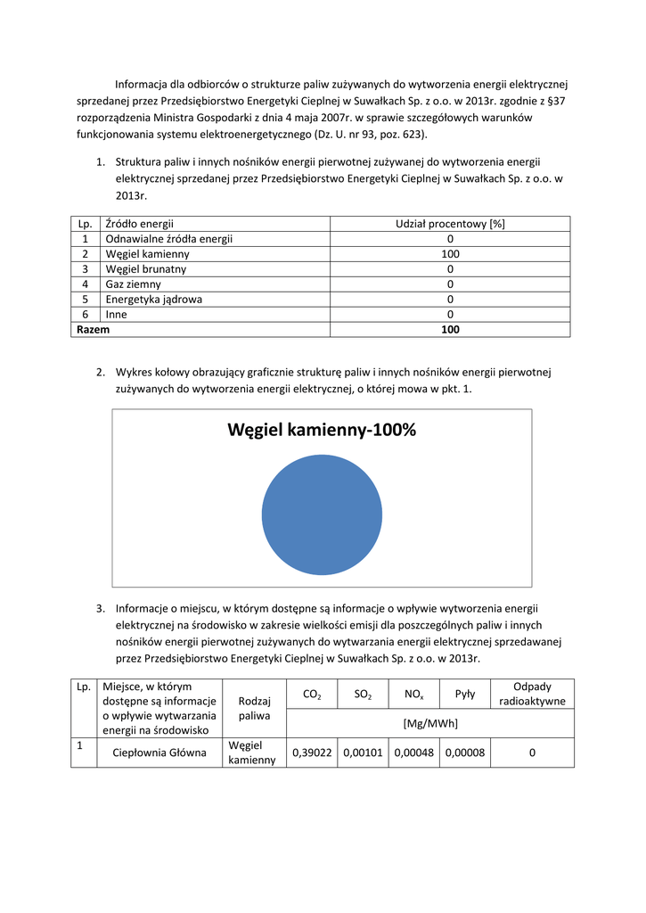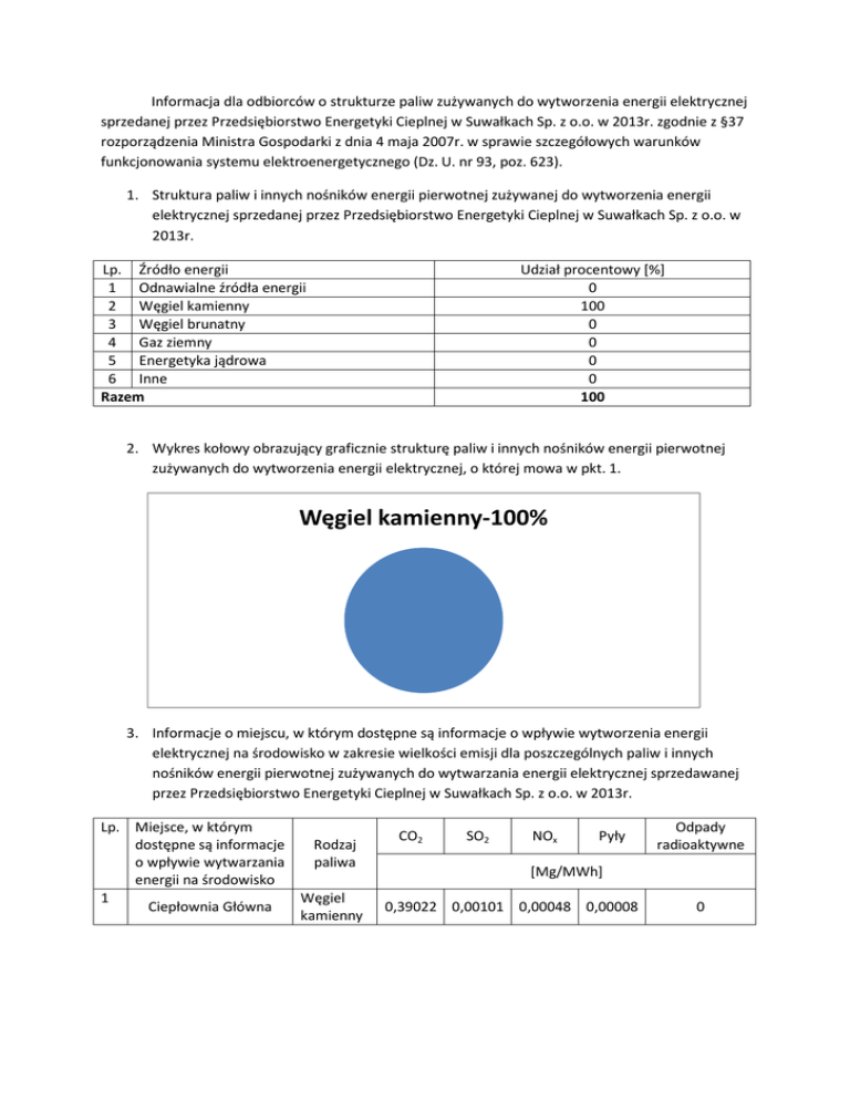 Informacja dla odbiorców o strukturze paliw zużywanych do wytworzenia energii elektrycznej sprzedanej przez Przedsiębiorstwo Energetyki Cieplnej w Suwałkach Sp. z o.o. w 2013r. zgodnie z §37 rozporządzenia Ministra Gospodarki z dnia 4 maja 2007r. w sprawie szczegółowych warunków funkcjonowania systemu elektroenergetycznego (Dz. U. nr 93, poz. 623). 1. Struktura paliw i innych nośników energii pierwotnej zużywanej do wytworzenia energii elektrycznej sprzedanej przez Przedsiębiorstwo Energetyki Cieplnej w Suwałkach Sp. z o.o. w 2013r. Lp. Źródło energii 1 Odnawialne źródła energii 2 Węgiel kamienny 3 Węgiel brunatny 4 Gaz ziemny 5 Energetyka jądrowa 6 Inne Razem Udział procentowy [%] 0 100 0 0 0 0 100 2. Wykres kołowy obrazujący graficznie strukturę paliw i innych nośników energii pierwotnej zużywanych do wytworzenia energii elektrycznej, o której mowa w pkt. 1. Węgiel kamienny-100% 3. Informacje o miejscu, w którym dostępne są informacje o wpływie wytworzenia energii elektrycznej na środowisko w zakresie wielkości emisji dla poszczególnych paliw i innych nośników energii pierwotnej zużywanych do wytwarzania energii elektrycznej sprzedawanej przez Przedsiębiorstwo Energetyki Cieplnej w Suwałkach Sp. z o.o. w 2013r. Lp. Miejsce, w którym dostępne są informacje o wpływie wytwarzania energii na środowisko 1 Ciepłownia Główna Rodzaj paliwa Węgiel kamienny CO2 SO2 NOx Pyły Odpady radioaktywne [Mg/MWh] 0,39022 0,00101 0,00048 0,00008 0
