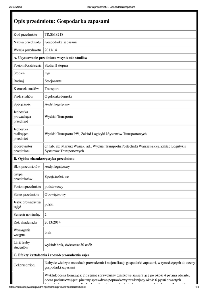 25.09.2013 Karta przedmiotu - Gospodarka zapasami Opis przedmiotu: Gospodarka zapasami Kod przedmiotu TR.SMS218 Nazwa przedmiotu Gospodarka zapasami Wersja przedmiotu 2013/14 A. Usytuowanie przedmiotu w systemie studiów Poziom Kształcenia Studia II stopnia Stopień mgr Rodzaj Stacjonarne Kierunek studiów Transport Profil studiów Ogólnoakademicki Specjalność Audyt logistyczny Jednostka prowadząca przedmiot Wydział Transportu Jednostka realizująca przedmiot Wydział Transportu PW, Zakład Logistyki i Systemów Transportowych Koordynator przedmiotu dr hab. inż. Mariusz Wasiak, ad., Wydział Transportu Politechniki Warszawskiej, Zakład Logistyki i Systemów Transportowych B. Ogólna charakterystyka przedmiotu Blok przedmiotów Audyt logistyczny Grupa przedmiotów Specjalnościowe Poziom przedmiotu podstawowy Status przedmiotu Obowiązkowy Język prowadzenia zajęć polski Semestr nominalny 2 Rok akademicki 2013/2014 Wymagania wstępne brak Limit liczby studentów wykład: brak, ćwiczenia: 30 osób C. Efekty kształcenia i sposób prowadzenia zajęć Cel przedmiotu Nabycie wiedzy o metodach prowadzenia i racjonalizacji gospodarki zapasami, w tym służących do oceny gospodarki zapasami. Wykład: ocena formująca: 2 pisemne sprawdziany cząstkowe zawierające po około 4 pytania otwarte, ocena podsumowująca: pisemny sprawdzian poprawkowy zawierający około 6 pytań otwartych (obowiązkowy w przypadku braku zaliczenia przynajmniej jednego ze sprawdzianów cząstkowych). https://ects.coi.pw.edu.pl/adminprzedmiot/print/idPrzedmiot/763846 1/4 25.09.2013 Metody oceny Efekty kształcenia Karta przedmiotu - Gospodarka zapasami (obowiązkowy w przypadku braku zaliczenia przynajmniej jednego ze sprawdzianów cząstkowych). Ćwiczenia: ocena formująca: weryfikacja umiejętności samodzielnego rozwiązywania wybranych problemów obliczeniowych (w tym rozwiązywanie zadań przy tablicy), ocena podsumowująca: kolokwium zawierające około 4 zadania rachunkowe. Patrz tabela 1 1 Ćwiczenia 1 Forma zajęć dydaktycznych i ich wymiar tygodniowy Wykład Laboratoria 0 Projekty Treści kształcenia 0 Wykład: Usystematyzowanie podstawowych pojęć stosowanych w gospodarce zapasami. Przyczyny gromadzenia zapasów, cele zarządzania zapasami, klasyfikacja zapasów, struktura zapasów. Rodzaje i metody kalkulacji kosztów zapasów. Mierniki i wskaźniki oceny gospodarki zapasami oraz mierniki i wskaźniki obsługi klienta. Zapas zabezpieczający oraz metoda jego optymalizacji dla różnych rozkładów prawdopodobieństwa. Zapas cykliczny oraz metoda jego optymalizacji. Wrażliwość funkcji kosztów uzupełniania i utrzymywania zapasu cyklicznego. Zarządzanie zapasami grup asortymentów, metoda analizy pokrycia zapasu, metoda grupowania zamówień. Istota zapasów rozproszonych oraz metoda wyznaczania poziomów zapasów zabezpieczających dla zapasów rozproszonych. Rodzaje popytu oraz metoda planowania zapotrzebowania materiałowego. Systemy zamawiania oparte na poziomie informacyjnym oraz systemy oparte na przeglądzie okresowym Ćwiczenia: Wyznaczanie mierników i wskaźników stosowanych w gospodarce zapasami. Metody wyznaczania poziomu zapasu średniego. Optymalizacja poziomu obsługi dla gospodarki zapasami. Optymalizacja poziomu zapasu zabezpieczającego dla różnych typów rozkładów prawdopodobieństwa. Optymalizacja poziomu zapasu cyklicznego dla różnych modeli. Analiza pokrycia zapasu. Metoda grupowania zamówień. Wyznaczanie zapasu zabezpieczającego dla zapasów rozproszonych. Wyznaczanie zapotrzebowania zależnego. Planowanie zaopatrzenia w systemach zamawiania opartych na poziomie informacyjnym oraz na przeglądzie okresowym. Metody sprawdzenia Patrz tabela 1 efektów kształcenia Egzamin nie Literatura podstawowa: 1. Krzyżaniak St.: Podstawy zarządzania zapasami w przykładach. Instytut Logistyki i Magazynowania, Poznań 2002; 2. Saryusz-Wolski Z.: Sterowanie zapasami w przedsiębiorstwie, Polskie Wydawnictwo Ekonomiczne, Warszawa 2000; 3. Abt S.: Zarządzanie Literatura Witryna www przedmiotu logistyczne w przedsiębiorstwie, Polskie Wydawnictwo Ekonomiczne, Warszawa 1998. Literatura uzupełniająca: 1. Fertsch M..: Podstawy zarządzania przepływem materiałów w przykładach, Biblioteka Logistyka, Poznań 2003; 2. Saryusz- Wolski Z., Strategia zarządzania zaopatrzeniem, Agencja Wydawnicza Placet, Warszawa 1997 www.wt.pw.edu.pl D. Nakład pracy studenta Liczba punktów ECTS 2 Liczba godzin pracy studenta związanych z osiągnięciem efektów kształcenia(opis): 58 godzin, w tym: praca na wykładach 15 godz., praca na ćwiczeniach 15 godz., studiowanie literatury przedmiotu 5 godz., konsultacje 3 godz., przygotowanie się do zaliczenia wykładu 10 godz., przygotowanie się do ćwiczeń oraz do kolokwium z ćwiczeń 10 godz. Liczba punktów https://ects.coi.pw.edu.pl/adminprzedmiot/print/idPrzedmiot/763846 2/4 25.09.2013 Karta przedmiotu - Gospodarka zapasami Liczba punktów ECTS na zajęciach wymagających bezpośredniego udziału nauczycieli akademickich: 1,5 pkt. ECTS (33 godzin, w tym: praca na wykładach 15 godz., praca na ćwiczeniach 15 godz., konsultacje 3 godz.) Liczba punktów ECTS, którą student uzyskuje w ramach zajęć o charakterze praktycznym 0 E. Informacje dodatkowe Uwagi Data ostatniej aktualizacji 2013-09-24 17:27:04 Tabela 1: Profil Ogólnoakademicki Efekty kierunkowe Efekty przedmiotowe Efekty obszarowe Wiedza Zna przyczyny gromadzenia zapasów, ich rodzaje oraz posiada uporządkowaną wiedzę o kosztach zapasów, jak również o zapasie Efekt: zabezpieczającym i zapasie cyklicznym oraz o metodach i uwarunkowaniach optymalizacji poziomu tych zapasów Kod efektu: W01 Weryfikacja: Sprawdzian 1 z wykładu, wymagane jest udzielenie pełnych odpowiedzi na nie mniej niż połowę z zadanych pytań oraz ew. sprawdzian poprawkowy Efekt: Posiada uporządkowaną wiedzę o zarządzaniu zapasami grup asortymentów, o zarządzaniu zapasami rozproszonymi oraz rodz