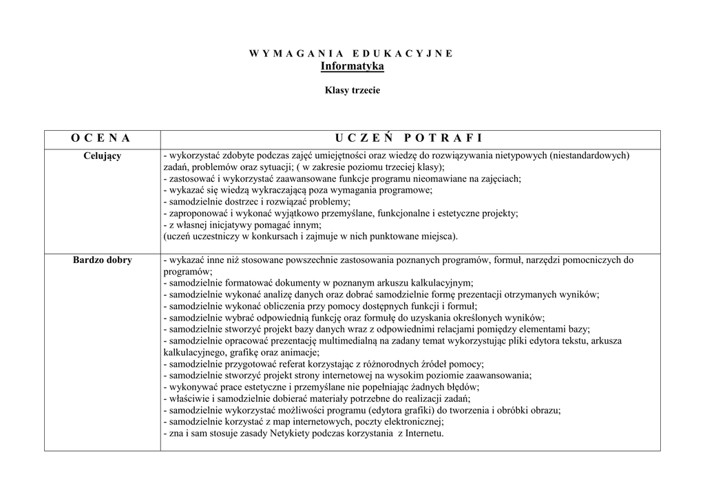 WYMAGANIA EDUKACYJNE Informatyka Klasy trzecie OCENA UCZEŃ POTRAFI Celujący - wykorzystać zdobyte podczas zajęć umiejętności oraz wiedzę do rozwiązywania nietypowych (niestandardowych) zadań, problemów oraz sytuacji; ( w zakresie poziomu trzeciej klasy); - zastosować i wykorzystać zaawansowane funkcje programu nieomawiane na zajęciach; - wykazać się wiedzą wykraczającą poza wymagania programowe; - samodzielnie dostrzec i rozwiązać problemy; - zaproponować i wykonać wyjątkowo przemyślane, funkcjonalne i estetyczne projekty; - z własnej inicjatywy pomagać innym; (uczeń uczestniczy w konkursach i zajmuje w nich punktowane miejsca). Bardzo dobry - wykazać inne niż stosowane powszechnie zastosowania poznanych programów, formuł, narzędzi pomocniczych do programów; - samodzielnie formatować dokumenty w poznanym arkuszu kalkulacyjnym; - samodzielnie wykonać analizę danych oraz dobrać samodzielnie formę prezentacji otrzymanych wyników; - samodzielnie wykonać obliczenia przy pomocy dostępnych funkcji i formuł; - samodzielnie wybrać odpowiednią funkcję oraz formułę do uzyskania określonych wyników; - samodzielnie stworzyć projekt bazy danych wraz z odpowiednimi relacjami pomiędzy elementami bazy; - samodzielnie opracować prezentację multimedialną na zadany temat wykorzystując pliki edytora tekstu, arkusza kalkulacyjnego, grafikę oraz animacje; - samodzielnie przygotować referat korzystając z różnorodnych źródeł pomocy; - samodzielnie stworzyć projekt strony internetowej na wysokim poziomie zaawansowania; - wykonywać prace estetyczne i przemyślane nie popełniając żadnych błędów; - właściwie i samodzielnie dobierać materiały potrzebne do realizacji zadań; - samodzielnie wykorzystać możliwości programu (edytora grafiki) do tworzenia i obróbki obrazu; - samodzielnie korzystać z map internetowych, poczty elektronicznej; - zna i sam stosuje zasady Netykiety podczas korzystania z Internetu. Dobry - zaprezentować średni poziom wiedzy o poznanych programach i jego funkcjach; - wymienić zastosowanie potrzebnych programów użytkowych; - wyszukiwać informacje za pomocą wcześniej nie poznanych programów; - wykonać obliczenia w arkuszu kalkulacyjnym oraz sporządzić tabelę z odpowiednio sformatowanymi danymi; - wykonać wykres wg wskazań wykorzystując wcześniej przygotowane dane; - wykonać projekt pracy graficznej z zastosowaniem prostych efektów programu graficznego; - wykonać różnorodne operacje na istniejącej bazie danych oraz stworzyć bazę na podstawie podanych informacji; - stworzyć stronę internetową stosując podstawowe komendy dotyczące formatowania tekstu, grafiki, łączy; - wykorzystać możliwości programu (edytora grafiki) do tworzenia i obróbki obrazu; - korzystać z map internetowych podczas zajęć, z poczty elektronicznej; - zna zasady Netykiety i stara się je stosować podczas korzystania z Internetu; - samodzielnie wykonać zadania popełniając tylko nieliczne błędy. Uczeń wykonuje prace estetycznie lecz do rozwiązania problemu stosuje tylko szablonowe rozwiązania. Dostateczny - określić korzyści wynikające z wykorzystywania różnych programów i technik informatycznych; - dokonać analizy danych wg ściśle określonych założeń, podanych funkcji i formuł; - sporządzić tabelę z danymi wg określonych wskazówek dotyczących formatu komórek; - sporządzić wykres wg wskazówek; - wykonać prostą bazę danych pod opieką nauczyciela; - wykonać prosty rysunek wg wcześniej poznanych procedur; - wykonać prezentację bazującą na tekście i gotowych elementach graficznych; - stworzyć stronę internetową stosując podstawowe komendy dotyczące formatowania tekstu; - wykonać mało złożony rysunek oraz dokonać podstawowych zmian w obrazie w poznanym edytorze grafiki; - założyć skrzynkę mail’ową i wysłać wiadomość elektroniczną przy pomocy nauczyciela; - wyszukać miejsce wskazane przez nauczyciela przy pomocy wybranej mapy internetowej wykonując polecenia nauczyciela; - wymienić niektóre zasady Netykiety. Uczeń: - ma widoczne braki w wiedzy i umiejętnościach lecz nadrabia chęcią wykonania swojej pracy; - nie rozumie problemów, które przed nim postawiono lecz stara się pracować samodzielnie i zgodnie z poleceniami; - w pracy popełnia często błędy i nie przywiązuje wagi do estetycznego wyglądu swojej pracy. dopuszczający - wskazać zastosowanie komputera w różnych dziedzinach życia; - wymienić podstawowe elementy komputera i wykonać na komputerze bardzo proste czynności; - uruchomić wskazany program dowolnym sposobem; - wykonywać podstawowe czynności w zakresie kopiowania, wklejania zaznaczonych fragmentów dokumentu; - wyszukiwać wskazane informacje w Internecie na podanych stronach; - opracować prosty projekt rysunku za pomocą poznanych narzędzi; - wpisać dane do komórek w dokładnie określonym formacie; - wykorzystać podstawowe funkcje w zakresie sumowania, wyliczania średniej wielkości; - wykonać fragment prezentacji wg podanego przykładu; - z pomocą nauczyciela dokonać podstawowych zmian obrazu w edytorze grafiki; - odnaleźć wskazaną przez nauczyciela mapę internetową oraz ją uruchomić; - własnymi słowami zdefiniować pojęcie Etykiety; - z pomocą nauczyciela wykonać proste zadania oraz opanować część umiejętności zawartych w podstawie programowej. Uczeń wykazuje chęć do pracy choć nie rozumie do końca problemów, które przed nim postawiono. niedostateczny Uczeń nie potrafi: - wykonać na komputerze prostych zadań; - rozwiązać postawionego przed nim zadania nawet z pomocą nauczyciela; - opanować podstawowych umiejętności zawartych w podstawie programowej; - nawet w minimalnym stopniu poradzić sobie z problemem. Uczeń lekceważy przedmiot i nie wykazuje chęci współpracy. Opracowała: Ewa Cieślak