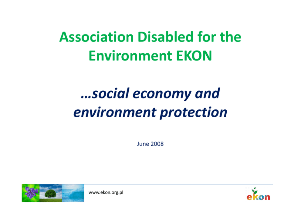Association Disabled for the Environment EKON …social economy and environment protection June 2008 www.ekon.org.pl Association Disabled for the Environment EKON founded in 2003 one of the first and leading social enterprise in Poland operates in 16 places in Poland created over 900 stable workplaces social advantages of EKON’s operating were assessed in 2007 at 2.1 million euro per year is a member of Workability International was awarded by PFRON, WFOŚiGW, MPiPS acquired the CERTIFICATE of Quality Management System PNEN ISO 9001:2001 since 1 of April 2008, as one of the first NGO in Poland, is sheltered workshop www.ekon.org.pl Association Disabled for the Environment EKON focuses on: environment protection (waste management, ecological education) professional rehabilitation of people with disabilities, especially with mental impairments www.ekon.org.pl Professional rehabilitation of people with disabilities Poland has over 38 millions of inhabitants of which 4.5 million are people with legal disability constitute 17.8% people with disability are professionally active barriers to professional activity: fear of loosing social benefits unwillingness of their family inadequate qualifications low motivation to work lack of information about employment possibilities unwillingness to hire people with disabilities low of knowledge about benefits concerning employing people with disabilities www.ekon.org.pl Aim of EKON Association in the field of professional rehabilitation of people with disabilities Development of supported employment of people with disabilities in Poland Supported employment is a process, which consists of: pull out disable person from inactivity preparing him/her to work placing disabled person on the labour market www.ekon.org.pl Aim of EKON Association in the field of professional rehabilitation of people with disabilities Main role is played by AZW, who is a person that takes care of disable person from the very first moment of their entering supported employment process until their are independant in the workplace. AZW main tasks: identifying the needs of unemployed disabled person provide adequate trainings finding suitable workplaces supporting employed disabled person meetings with employers – encouraging them to hire disabled persons www.ekon.org.pl Thank you for your attention Monika Baraniewska [email protected] Mobile: 0-512-364-112 Association Disabled for the Environment EKON ul. Kępińska 90, 05-805 Otrębusy tel. + 48 22 729 40 04 | fax. + 48 22 758 57 01 [email protected] | www.ekon.org.pl www.ekon.org.pl