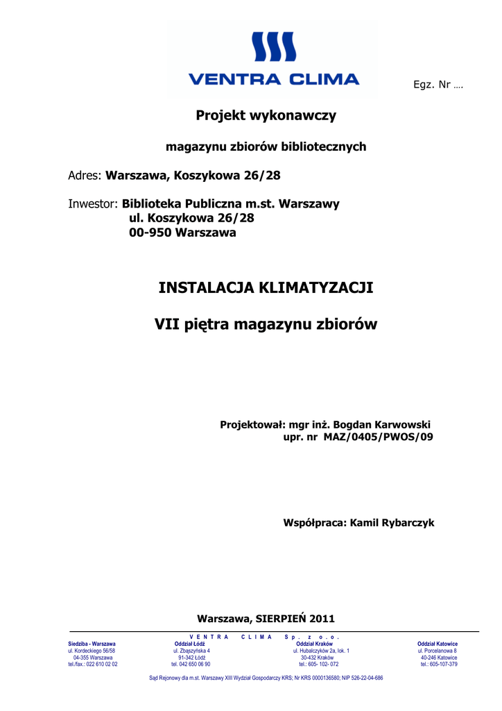 Egz. Nr …. Projekt wykonawczy magazynu zbiorów bibliotecznych Adres: Warszawa, Koszykowa 26/28 Inwestor: Biblioteka Publiczna m.st. Warszawy ul. Koszykowa 26/28 00-950 Warszawa INSTALACJA KLIMATYZACJI VII piętra magazynu zbiorów Projektował: mgr inŜ. Bogdan Karwowski upr. nr MAZ/0405/PWOS/09 Współpraca: Kamil Rybarczyk Warszawa, SIERPIEŃ 2011 Siedziba - Warszawa ul. Kordeckiego 56/58 04-355 Warszawa tel./fax.: 022 610 02 02 V E N T R A Oddział Łódź ul. Zbąszyńska 4 91-342 Łódź tel. 042 650 06 90 C L I M A S p . z o . o . Oddział Kraków ul. Hubalczyków 2a, lok. 1 30-432 Kraków tel.: 605- 102- 072 Sąd Rejonowy dla m.st. Warszawy XIII Wydział Gospodarczy KRS; Nr KRS 0000136580; NIP 526-22-04-686 Oddział Katowice ul. Porcelanowa 8 40-246 Katowice tel.: 605-107-379 Warszawa, ul. Koszykowa 26/28 P.W. INSTALACJI KLIMATYZACJI SPIS ZAWARTOŚCI OPRACOWANIA I. ZAŁĄCZNIKI .............................................................................................. 2 Oświadczenie projektanta .................................................................................... 2 Uprawnienia i przynaleŜności do Izby InŜynierów Budownictwa projektanta ............ 3 2. PODSTAWA OPRACOWANIA. ................................................................ 5 3. CEL I ZAKRES OPRACOWANIA. ............................................................ 5 4. ZAŁOśENIA WSTĘPNE. ........................................................................... 5 5. OPIS STANU ISTNIEJĄCEGO................................................................. 6 6. OPIS PROJEKTOWANEJ INSTALACJI .................................................. 6 7. DOBÓR URZĄDZEŃ .................................................................................. 7 8. INSTALACJA FREONOWA I SKROPLIN ............................................... 8 9. OCHRONA PPOś. ...................................................................................... 8 10. WYTYCZNE BRANśOWE. ...................................................................... 8 III. CZĘŚĆ RYSUNKOWA - Rzut VII piętra skala 1:100 …………………………………………………………………………….. 01 - Rzut dachu skala 1:50 …………………………………………………………………………………….. 02 - Widok B skala 1:50 ……………………………………………………………………..………………….. 03 - Przekrój A-A skala 1:50 ………………………………………………………………..………………….. 04 - Szczegół C skala 1:50 ……..…………………………………………………………..………………….. 05 - Konstrukcja skala 1:25 ……..………………………………………………………..………………….. 06 - Sterowanie skala ------ ……..………………………………………………………..………………….. 07 www.ventra-clima.com.pl strona -1- Warszawa, ul. Koszykowa 26/28 P.W. INSTALACJI KLIMATYZACJI I. ZAŁĄCZNIKI projektant Bogdan Karwowski (imię i nazwisko) 09-100 Płońsk, ul. Konopnickiej 25 (adres) MAZ/0405/PWOS/09 (nr uprawnień) MAZ/IS/0081/10 (nr członkowski izby zawodowej) * Oświadczenie projektanta OŚWIADCZENIE projektanta Zgodnie z art. 20 ust. 4 ustawy z dnia 7 lipca 1994r. Prawo budowlane (t.j. Dz. U. z 2006r. Nr 156, poz. 1118 z późn. zm.) o ś w i a d c z a m , Ŝe: PROJEK WYKONAWCZY INSTALACJI KLIMATYZACJI (nazwa projektu budowlanego) VII PIĘTRO BUDYNKU BIUROWO-MAGAZYNOWEGO WARSZAWA, UL. KOSZYKOWA 26/28 (adres zamierzenia budowlanego) SIERPIEŃ 2011 (data sporządzenia projektu) sanitarna (branŜa) dla: Biblioteka Publiczna m.st. Warszawy, ul. Koszykowa 26/28, 00-950 Warszawa (inwestor – nazwa) został wykonany zgodnie z obowiązującymi przepisami oraz zasadami wiedzy technicznej. ...................................................... (podpis projektanta) www.ventra-clima.com.pl strona -2- Warszawa, ul. Koszykowa 26/28 P.W. INSTALACJI KLIMATYZACJI * Uprawnienia i przynaleŜności do Izby InŜynierów Budownictwa projektanta * www.ventra-clima.com.pl strona -3- Warszawa, ul. Koszykowa 26/28 P.W. INSTALACJI KLIMATYZACJI www.ventra-clima.com.pl strona -4- Warszawa, ul. Koszykowa 26/28 P.W. INSTALACJI KLIMATYZACJI Opis techniczny do projektu wykonawczego instalacji klimatyzacji dla pomieszczeń magazynowych na VII piętrze budynku zbiorów bibliotecznych w Bibliotece Publicznej m.st. Warszawy przy ul. Koszykowej 26/28 w Warszawie. II. OPIS TECHNICZNY 1. DANE OGÓLNE VII piętro budynku zbiorów bibliotecznych – Biblioteki Publicznej m.st. Warszawy 2. PODSTAWA OPRACOWANIA. 2.1 Formalną podstawą opracowania stanowi umowa. 2.2 Merytoryczną podstawę opracowania stanowi: - umowa z inwestorem, - podkłady budowlane, - obowiązujące normy i przepisy, - uzgodnienia z inwestorem i międzybranŜowe, - katalogi producentów urządzeń i kanałów. 3. CEL I ZAKRES OPRACOWANIA. Celem opracowania jest projekt instalacji klimatyzacji zapewniającej schłodzenie i nawilŜanie powietrza w obszarze VII piętra. Opracowanie obejmuje: Instalację wentylacji z nawilŜaniem tj: - obliczenia ( w archiwum projektanta ), - trasy instalacji, - dobór centrali wentylacyjnej, - dobór nawilŜacza. Instalację klimatyzacji (chłodzenia powietrza) tj: - dobór klimatyzatorów, - określenie przebiegu instalacji freonowej i skroplin, - wytyczne branŜowe. 4. ZAŁOśENIA WSTĘPNE. Obiekt połoŜony jest w Warszawie. Parametry powietrza zgodnie z PN 76/B-03420. Parametry powietrza zewnętrznego dla klimatyzacji: Lato temp. pow. tzew = 32°C, wilgotność 45% www.ventra-clima.com.pl Zima temp. pow. tzew = -20°C wilgotność 100% strona -5- Warszawa, ul. Koszykowa 26/28 P.W. INSTALACJI KLIMATYZACJI Parametry powietrza wewnętrznego dla lata dla klimatyzacji: Temp. Pow. Pom. Magazynowe - twew= +20oC ÷ +23oC Wilgotność 40% ± 5% Funkcje systemu klimatyzacji: - chłodzenie powie