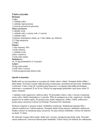 Ciasto cytrynka Biszkopt: 4 jajka ½ szklanki cukru ½ szklanki mąki pszennej ½ łyżeczki proszku do pieczenia Masa cytrynowa: 2 szklanki wody ½ szklanki soku z cytryny (sok z 2 cytryn) ¾ szklanki cukru 2 budynie śmietankowe (duże, na ¾ litra mleka, np. Delecta) 12,5 dag margaryny 2 żółtka Pianka: ½ litra śmietany 30% 1 łyżka żelatyny ½ szklanki wody cukier waniliowy 2 łyżki cukru pudru Dodatkowo: ok. 35 dag herbatników (3-4 paczki) Lukier: 20 dag cukru pudru 2 łyżki soku z cytryny 2 łyżki przegotowanej letniej wody Sposób wykonania: Białka ubić na sztywną pianę ze szczyptą soli, dodać cukier i ubijać. Następnie dodać żółtka i dalej ubijać. Na koniec wsypać mąkę pszenną wymieszaną z proszkiem do pieczenia. Delikatnie wymieszać. Ciasto wylać do wysmarowanej tłuszczem i wysypanej tartą bułką prostokątnej tortownicy o wymiarach 25 na 36 cm. Włożyć do nagrzanego piekarnika i piec przez około 25 minut. Ostudzić. 1 szklankę wody zagotować z połową cukru. W pozostałej wodzie i soku z cytryny rozmieszać resztę cukru i budyń śmietankowy w proszku. Wlać do gotującej się wody, zagotować i chwilkę pogotować na małym ogniu. Do gorącej masy dodać margarynę i żółtka. Całość zmiksować i gorącą masę cytrynową wyłożyć na biszkopt. Pozostawić do ostudzenia. Żelatynę rozpuścić w gorącej wodzie i dokładnie rozmieszać. Schłodzoną śmietanę ubić z cukrem waniliowym i cukrem pudrem. Następnie dodać letnią żelatynę i dokładnie zmiksować. Piankę wyłożyć na ostudzoną masę cytrynową. Na niej rozłożyć herbatniki i włożyć do lodówki na około 15 minut. Do miseczki wsypać cukier puder, dodać sok z cytryny i przegotowaną letnią wodę. Wszystko razem zmiksować. Gotowym lukrem polać herbatniki. Całość włożyć do lodówki do schłodzenia.