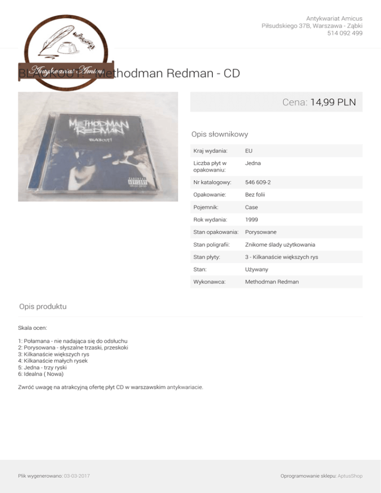 Antykwariat Amicus Piłsudskiego 37B, Warszawa - Ząbki 514 092 499 BLACKOUT! - Methodman Redman - CD Cena: 14,99 PLN Opis słownikowy Kraj wydania: EU Liczba płyt w opakowaniu: Jedna Nr katalogowy: 546 609-2 Opakowanie: Bez folii Pojemnik: Case Rok wydania: 1999 Stan opakowania: Porysowane Stan poligrafii: Znikome ślady użytkowania Stan płyty: 3 - Kilkanaście większych rys Stan: Używany Wykonawca: Methodman Redman Opis produktu Skala ocen: 1: Połamana - nie nadająca się do odsłuchu 2: Porysowana - słyszalne trzaski, przeskoki 3: Kilkanaście większych rys 4: Kilkanaście małych rysek 5: Jedna - trzy ryski 6: Idealna ( Nowa) Zwróć uwagę na atrakcyjną ofertę płyt CD w warszawskim antykwariacie. Plik wygenerowano: 03-03-2017 Oprogramowanie sklepu: AptusShop Antykwariat Amicus Piłsudskiego 37B, Warszawa - Ząbki 514 092 499 Galeria Plik wygenerowano: 03-03-2017 Powered by TCPDF (www.tcpdf.org) Oprogramowanie sklepu: AptusShop