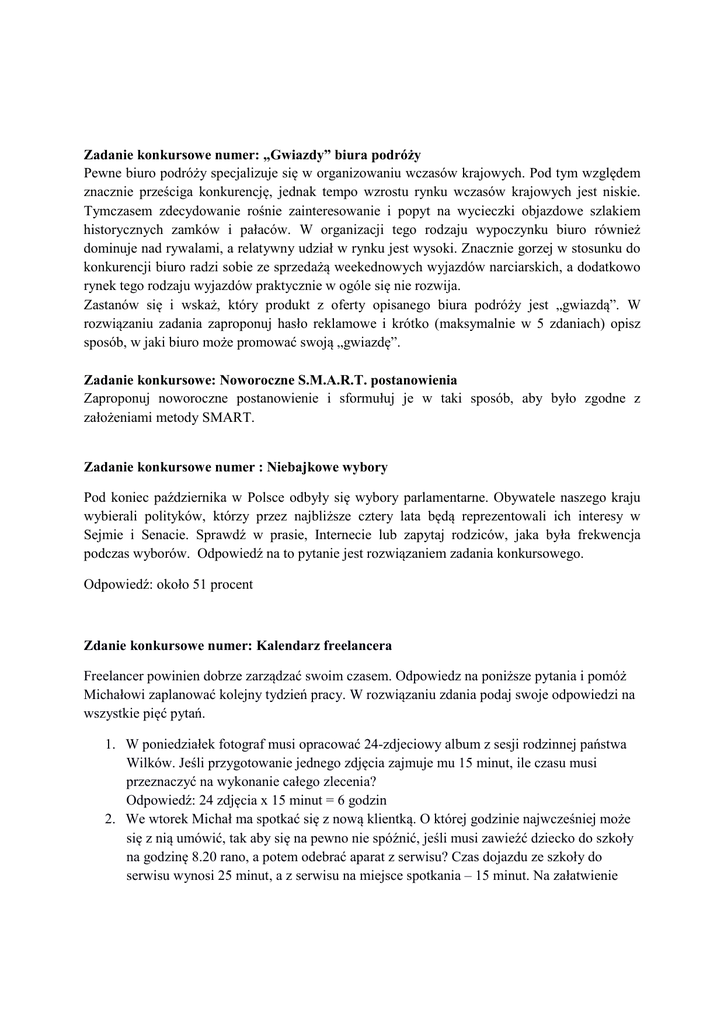 Zadanie konkursowe numer: „Gwiazdy” biura podróży Pewne biuro podróży specjalizuje się w organizowaniu wczasów krajowych. Pod tym względem znacznie prześciga konkurencję, jednak tempo wzrostu rynku wczasów krajowych jest niskie. Tymczasem zdecydowanie rośnie zainteresowanie i popyt na wycieczki objazdowe szlakiem historycznych zamków i pałaców. W organizacji tego rodzaju wypoczynku biuro również dominuje nad rywalami, a relatywny udział w rynku jest wysoki. Znacznie gorzej w stosunku do konkurencji biuro radzi sobie ze sprzedażą weekednowych wyjazdów narciarskich, a dodatkowo rynek tego rodzaju wyjazdów praktycznie w ogóle się nie rozwija. Zastanów się i wskaż, który produkt z oferty opisanego biura podróży jest „gwiazdą”. W rozwiązaniu zadania zaproponuj hasło reklamowe i krótko (maksymalnie w 5 zdaniach) opisz sposób, w jaki biuro może promować swoją „gwiazdę”. Zadanie konkursowe: Noworoczne S.M.A.R.T. postanowienia Zaproponuj noworoczne postanowienie i sformułuj je w taki sposób, aby było zgodne z założeniami metody SMART. Zadanie konkursowe numer : Niebajkowe wybory Pod koniec października w Polsce odbyły się wybory parlamentarne. Obywatele naszego kraju wybierali polityków, którzy przez najbliższe cztery lata będą reprezentowali ich interesy w Sejmie i Senacie. Sprawdź w prasie, Internecie lub zapytaj rodziców, jaka była frekwencja podczas wyborów. Odpowiedź na to pytanie jest rozwiązaniem zadania konkursowego. Odpowiedź: około 51 procent Zdanie konkursowe numer: Kalendarz freelancera Freelancer powinien dobrze zarządzać swoim czasem. Odpowiedz na poniższe pytania i pomóż Michałowi zaplanować kolejny tydzień pracy. W rozwiązaniu zdania podaj swoje odpowiedzi na wszystkie pięć pytań. 1. W poniedziałek fotograf musi opracować 24-zdjeciowy album z sesji rodzinnej państwa Wilków. Jeśli przygotowanie jednego zdjęcia zajmuje mu 15 minut, ile czasu musi przeznaczyć na wykonanie całego zlecenia? Odpowiedź: 24 zdjęcia x 15 minut = 6 godzin 2. We wtorek Michał ma spotkać się z nową klientką. O której godzinie najwcześniej może się z nią umówić, tak aby się na pewno nie spóźnić, jeśli musi zawieźć dziecko do szkoły na godzinę 8.20 rano, a potem odebrać aparat z serwisu? Czas dojazdu ze szkoły do serwisu wynosi 25 minut, a z serwisu na miejsce spotkania – 15 minut. Na załatwienie sprawy w serwisie fotograf potrzebuje pół godziny. Niestety na trasie pomiędzy serwisem a planowanym miejscem spotkania często tworzą się poranne korki, przez co przejazd może zająć trzy razy dłużej. Odpowiedź: Najwcześniej może umówić się na 10.00 (25 min + 30 min + 3 x 15 min = 1 h 40 min) 3. Na środę fotograf ma zaplanowaną trzygodzinną sesję plenerową. Klient wpłacił mu już zaliczkę w wysokości 50 złotych, zaś po spotkaniu Michał otrzyma kolejnych 250 złotych. Ile pieniędzy fotograf otrzyma za każdą godzinę pracy? Odpowiedź: (50 zł + 250 zł) / 3 = 100 zł 4. We czwartek fotograf ma umówione sesje trzech różnych modelek. Na którą godzinę powinien umówić się z każdą z nich, jeśli: a. Zrobienie stu zdjęć zajmuje mu godzinę. b. Pomiędzy sesjami Michał potrzebuje pół godziny przerwy. c. Michał chce zacząć pracę o 9.00 rano i jak najwcześniej skończyć. d. Pierwsza modelka chce mieć zrobionych tyle samo zdjęć, co pozostałe dwie modelki łącznie. e. Gdyby druga modelka zrezygnowała z 25 zdjęć, trzecia modelka miałaby trzy razy więcej zdjęć niż ona. f. Praca z trzecią modelką zajmie fotografowi 1,5 godziny. Odpowiedź: 9.00 Pierwsza modelka: 75 + 150 = 225 zdjęć (sesja 2 godziny 15 minut + przerwa) 11.45 Druga modelka: 3 x (z – 25) = 150 => 75 zdjęć (sesja 45 minut + przerwa) 13.00 Trzecia modelka: 1,5 godziny => 150 zdjęć 5. W piątek Michał chciałby umówić się na kawę z Kubą. Licząc łącznie z dojazdem na spotkanie potrzebuje dwóch godzin. Czy znajdzie na to czas przed godziną 17.00 jeśli: a. Na 8.00 zawozi dziecko do szkoły. b. Dwie godziny później musi być w swoim studiu. c. Między 11 a 13 do studia przyjdzie pan Wilk, żeby odebrać album z sesji. d. Żona prosiła go, aby zawiózł dziecko na zajęcia z ekonomii, które zaczynają się o 15.00 i trwają 45 minut (Michał musi poczekać na córkę). e. Fotograf potrzebuje godzinę na to, by złożyć dokumenty w konkursie na napiększniejsze zdjęcie Krakowa. Biuro konkursowe jest czynne między 9.00 a 17.00. Odpowiedź: nie Zadanie konkursowe numer: Krzyżówka Określenia haseł zostały podane w przypadkowej kolejności. Należy odgadnąć hasła, a następnie wpisać je w odpowiednie miejsca do diagramu. Dla ułatwienia w diagramie wpisano pierwsze litery wyrazów zaczynających się na d, h i p. Litery z kolorowych pól czytane kolumnami utworzą rozwiązanie. Odpowiedź: KOMANDYTARIUS