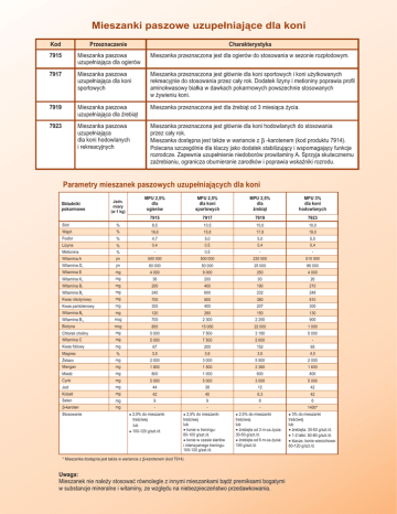 Mieszanki paszowe uzupe³niaj¹ce dla koni Kod Przeznaczenie Charakterystyka 7915 Mieszanka paszowa uzupe³niaj¹ca dla ogierów Mieszanka przeznaczona jest dla ogierów do stosowania w sezonie rozp³odowym. 7917 Mieszanka paszowa uzupe³niaj¹ca dla koni sportowych Mieszanka przeznaczona jest g³ównie dla koni sportowych i koni u¿ytkowanych rekreacyjnie do stosowania przez ca³y rok. Dodatek lizyny i metioniny poprawia profil aminokwasowy bia³ka w dawkach pokarmowych powszechnie stosowanych w ¿ywieniu koni. 7919 Mieszanka paszowa uzupe³niaj¹ca dla Ÿrebi¹t Mieszanka przeznaczona jest dla Ÿrebi¹t od 3 miesi¹ca ¿ycia. 7923 Mieszanka paszowa uzupe³niaj¹ca dla koni hodowlanych i rekreacyjnych Mieszanka przeznaczona jest g³ównie dla koni hodowlanych do stosowania przez ca³y rok. Mieszanka dostêpna jest tak¿e w wariancie z -karotenem (kod produktu 7914). Polecana szczególnie dla klaczy jako dodatek stabilizuj¹cy i wspomagaj¹cy funkcje rozrodcze. Zapewnia uzupe³nienie niedoborów prowitaminy A. Sprzyja skutecznemu zaŸrebianiu, ogranicza obumieranie zarodków i poprawia wskaŸniki rozrodu. Parametry mieszanek paszowych uzupe³niaj¹cych dla koni Sk³adniki pokarmowe Jedn. miary (w 1 kg) MPU 2,5% dla ogierów MPU 2,5% dla koni sportowych MPU 2,5% dla Ÿrebi¹t MPU 3% dla koni hodowlanych 7915 7917 7919 7923 Sód % 8,5 10,5 10,0 10,0 Wapñ % 16,6 15,8 17,8 19,0 Fosfor % 4,7 5,0 5,0 5,0 Lizyna % 0,4 0,5 0,4 0,4 Metionina % jm - 0,5 - - 500 000 500 000 230 000 510 000 Witamina D3 jm 80 000 50 000 25 000 86 000 Witamina E mg 4 000 9 000 250 4 000 Witamina K3 mg 36 200 93 26 Witamina B1 mg 200 400 190 210 Witamina B2 mg 240 600 232 248 Kwas nikotynowy mg 700 900 380 810 Kwas pantotenowy mg 300 400 207 300 Witamina B6 mg 280 150 130 Witamina B12 mcg 120 700 2 300 2 250 900 Biotyna mcg 800 15 000 22 000 1 000 Chlorek choliny mg 5 000 7 500 3 180 5 000 Witamina C mg 5 000 7 500 5 600 - Kwas foliowy mg 67 200 152 95 Magnez % mg 3,5 3,6 3,5 4,0 ¯elazo 2 000 3 000 5 900 2 000 Mangan mg 1 800 1 500 2 360 1 600 MiedŸ mg 800 1 000 600 800 Cynk mg 5 000 5 000 3 000 5 000 Jod mg 44 38 12 42 Kobalt Selen mg 42 40 6,3 42 mg 9 9 8 6 mg - - - 1400* 2,5% do mieszanki treœciwej lub Ÿrebiêta od 3 m-ca ¿ycia: 30-50 g/szt./d. Ÿrebiêta od 6 m-ca ¿ycia: 100 g/szt./d. 3% do mieszanki treœciwej lub Ÿrebiêta: 30-50 g/szt./d. 1-2 latki: 50-80 g/szt./d. klacze, konie wierzchowe: 80-120 g/szt./d. Witamina A Stosowanie 2,5% do mieszanki treœciwej lub 100-120 g/szt./d. 2,5% do mieszanki treœciwej lub konie w treningu: 80-100 g/szt./d. konie w czasie startów i intensywnego treningu: 100-120 g/szt./d. * Mieszanka dostêpna jest tak¿e w wariancie z -karotenem (kod 7914) Uwaga: Mieszanek nie nale¿y stosowaæ równolegle z innymi mieszankami b¹dŸ premiksami bogatymi w substancje mineralne i witaminy, ze wzglêdu na niebezpieczeñstwo przedawkowania.