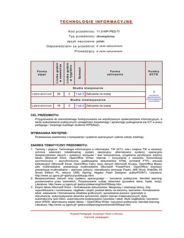 TTE EC CH HN NO OLLO OG GIIE E IIN NFFO OR RM MA AC CY YJJN NE E Kod przedm i ot u: 11.3-WP-PED-TI T yp przedm i ot u: obowiązkowy Język naucza ni a: polski dr Jacek Jędryczkowski Form a za j ę ć Se m e s t r Pro wadz ący: Li c z ba godz i n w t y godni u dr Jacek Jędryczkowski, Li c z ba godz i n w s em e s t r z e O dpo wi edzi al ni za przedm i ot : Form a za l i c ze ni a Punk t y ECTS St udi a s t a cj ona r ne L a b o r a t o ri um 30 2 1 lub 2 Zaliczenie na ocenę St udi a ni e st a c j ona r ne L a b o r a t o ri um 18 2 3 (na różnych specjalnościach może występować inna wartość) 1 lub 2 Zaliczenie na ocenę CEL PRZEDMIOTU: Przygotowanie do samodzielnego funkcjonowania we współczesnym społeczeństwie informacyjnym, a także wykształcenie praktycznych umiejętności świadomego i sprawnego posługiwania się ICT w pracy pedagoga / socjologa (każdego studenta WPSiNoZ). WYMAGANIA WSTĘPNE: Podstawowe wiadomości o komputerze i systemie operacyjnym (zakres szkoły średniej). ZAKRES TEMATYCZNY PRZEDMIOTU: 1. Terminy / pojęcia: Technologia informacyjna a informatyka. TIK (ICT); rola i miejsce TIK w edukacji; ochrona własności intelektualnej; system operacyjny; alternatywne systemy operacyjne (bezpieczeństwo danych i systemu); komputer i sieć komputerowa. urządzenia peryferyjne; edytory tekstu (Microsoft Word, OpenOffice Writer; Internet – korzystanie z zasobów, komunikacja synchroniczna i asynchroniczna; publikowanie dokumentów HTML (protokół FTP); arkusze kalkulacyjne (Microsoft Excel, OpenOffice Calc); bazy danych (Microsoft Access, OpenOffice Base); pliki multimedialne; prezentacje multimedialne (Microsoft PowerPoint, OpenOffice Impress); prezentacje multimedialne – sieciowe (witryny, interaktywne animacje Flash): (MS Word; WebSite X5 Smart Edition PL; witryny CMS; iSpring; Aligator Flash Designer; authorPOINT). Literatura: http://www.uz.zgora.pl/~jjedrycz/publikacje.html. 2. Bezpieczeństwo danych oraz systemu operacyjnego – ćwiczenia praktyczne; blended learning, poszanowanie praw autorskich. Poszanowanie cudzej własności (prywatne dane, hasła, kody). Literatura: http://www.uz.zgora.pl/~jjedrycz/elearning/html/00bezp.htm. 3. Edytor tekstu Microsoft Word – formatowanie dokumentów. Marginesy i orientacja strony, listy wypunktowane i numerowane, nagłówki i stopki, podział tekstu na kolumny, tworzenie i formatowanie tabel, wstawianie i formatowanie obiektów graficznych, sprawdzanie pisowni i gramatyki w dokumencie, wykorzystywanie słownika synonimów, edytor równań matematycznych; style, automatyczny spis treści, automatyczne podpisywanie rysunków i tabel, Style nagłówków; tworzenie stron WWW; alternatywny edytor tekstu – OpenOffice Writer. ćwiczenia praktyczne; blended learning. Literatura: http://www.uz.zgora.pl/~jjedrycz/elearning/word/word0/00hiper.htm. Wydział Pedagogiki, Socjologii i Nauk o Zdrowiu Kierunek: pedagogika 4. Arkusz kalkulacyjny - Microsoft Excel lub Apache OpenOffice / LibreOffice Calc (do wyboru). Tworzenie i formatowanie arkuszy danych, sortowanie, tworzenie i kopiowanie funkcji, podstawowe obliczenia, formatowanie wykresów; rejestracja makr; tworzenie formularzy. Formularz jako elektroniczny test lub ankieta. Arkusze sieciowe – import danych z wielu arkuszy, kwerenda sieci Web, sumy częściowe, tabela przestawna, autofiltrowanie, wykresy. Ćwiczenia praktyczne; blended learning. Dla zainteresowanych e-elearning – tworzenie elektronicznych testów i ankiet: http://www.uz.zgora.pl/~jjedrycz/elearning/excel1/00ex.htm. 5. Multimedia: grafika i dźwięk, film. Grafika - typy plików graficznych, konwersja. Fotografia cyfrowa, programy do edycji zdjęć, skanery i skanowanie, tworzenie animowanych plików gif, tworzenie animacji w prezentacji multimedialnej. Dźwięk - rejestracja dźwięku z różnych źródeł, obróbka dźwięku, konwersja plików dźwiękowych. Osadzanie dźwięku w prezentacji multimedialnej. Film - rejestracja filmów z zastosowaniem kamery internetowej, rejestracja ekranu komputera z zastosowaniem aplikacji do tworzenia filmów ekranowych, zapisywanie i konwersja filmów rozpowszechnianych legalnie w Internecie, montaż plików filmowych, tworzenie prostych animacji, animowane napisy. 6. Internet: FTP; WWW; CMS; Edytory HTML. Aplikacje w chmurze; Google Dokumenty oraz Microsoft SkyDrive; DropBox. Przegląd narzędzi do publikowania multimedialnych witryn w sieci Internet (MS Word lub kreatora, np. WebSite X5 Smart Edition PL); Podstawowe informacje o witrynach CMS. Projekt witryny (wykonanie witryny). METODY KSZTAŁCENIA: Pokaz, demonstracja, praca z książką (samodzielne korzystanie z multimedialnych kursów online: blended learning oraz e-learning), metoda zajęć praktycznych, metoda laboratoryjna. EFEKTY KSZTAŁCENIA: K_W08 K_U04 K_U05 K_U07 K_K05 K_K08 Student zna procesy, narzędzia i technik komunikowania z zastosowaniem ICT. - Student korzysta z nowoczesnych technologii (ICT): wyszukuje, sortuje, przetwarza, archiwizuje i wizualizuje informacje oraz komunikuje się synchroniczne i asynchroniczne. - Przygotowuje dokument tekstowy, arkusz kalkulacyjny lub bazę danych, których konstrukcja jest zgodna z podanymi uprzednio wymogami, a zawartość merytoryczna nie budzi zastrzeżeń. - Znajduje informację o ściśle określonej tematyce i formie przekazu (tekst, grafika, film) – znajomość narzędzi do wyszukiwania, sortowania, przetwarzania, archiwizacji i wizualizacji niezbędnych informacji. - Korzysta z narzędzi do komunikacji online a także aplikacji i zasobów w chmurze. - Opracowuje dane i prezentuje wyniki (z wykorzystaniem ICT). - Wizualizuje dowolną tematykę (np. w formie prezentacji multimedialnej, witryny internetowej, wykresu, fotografii, rysunku, filmu lub nagrania audio). - Stosuje podstawowe terminy i pojęcia z zakresu podstaw informatyki. - Stosuje różne kanały i techniki komunikacji online. - W obrębie samodzielnie przygotowywanych projektów 