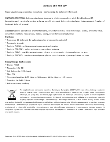 Żarówka LED RGB 12V Przed użyciem zapoznaj się z instrukcją i zachowaj ją dla dalszych informacji. ENERGOOSZCZĘDNA, kolorowa żarówka sterowana pilotem na podczerwień. Dzięki pilotowi IR kompaktowych rozmiarów można w łatwy sposób sterować świeceniem żarówki. Można włączyć / wyłączyć i ustawić kolory i jasność. Zastosowanie: oświetlenie architektoniczne, oświetlenie domu, kina domowego, studia, prywatny klub, oświetlenie reklam, restauracje, hotele, scenę, oświetlenia dzieł sztuki itp. Funkcje: * Świecenie 16 kolorami do wyboru(zgodnie z kolorami na pilocie) * Regulacja jasności * Funkcja FLASH: szybka automatyczna zmiana kolorów * Funkcja STROBE - wolna automatyczna zmiana kolorów * Funkcja FADE - szybkie automatyczne, płynne przechodzenie z jednego koloru na inny * Funkcja SMOOTH - wolne automatyczne płynne przechodzenie z jednego koloru na inny Specyfikacja techniczna: * Gwint: MR16 * Napięcie: 12V DC * Kąt świecenia: 120 stopni * Moc: 3W * Strumień świetlny: RGB Light = 50 Lumen; White Light = 110 Lumen * Średnica żarówki: 50mm * Kolor obudowy: srebrny To urządzenie jest oznaczone zgodnie z Dyrektywą Europejską 2002/96/WE oraz polską Ustawą o zużytym sprzęcie elektrycznym i elektronicznym symbolem przekreślonego kontenera na odpady. Takie oznakowanie informuje, że sprzęt ten, po okresie jego użytkowania nie może być umieszczany łącznie z innymi odpadami pochodzącymi z gospodarstwa domowego. Użytkownik jest zobowiązany do oddania go prowadzącym zbieranie zużytego sprzętu elektrycznego i elektronicznego. Prowadzący zbieranie, w tym lokalne punkty zbiórki, sklepy oraz gminne jednostki, tworzą odpowiedni system umożliwiający oddanie tego sprzętu. Właściwe postępowanie ze zużytym sprzętem elektrycznym i elektronicznym przyczynia się do uniknięcia szkodliwych dla zdrowia ludzi i środowiska naturalnego konsekwencji, wynikających z obecności składników niebezpiecznych oraz niewłaściwego składowania i przetwarzania takiego sprzętu. W urządzeniu ograniczono niektóre substancje mogące negatywnie oddziaływać na środowisko w okresie użytkowania tego produktu oraz po ich zużyciu. Importer: PHU GOTEL Andrzej Gołaszewski, Kolonia Porosły 53, 16-070 Choroszcz, POLAND
