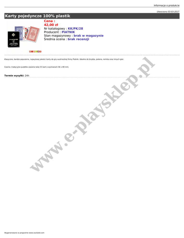 Informacje o produkcie Utworzono 03-03-2017 Karty pojedyncze 100% plastik Cena : 42,00 zł Nr katalogowy : KK/PK/28 Producent : PIATNIK Stan magazynowy : brak w magazynie Średnia ocena : brak recenzji p. pl Klasyczne, bardzo popularne, najwyższej jakości karty do gry austriackiej firmy Piatnik. Idealne do brydża, pokera, remika oraz innych gier. Czarne, tradycyjne pudełko zawiera talię 55 kart o wymiarach 58 x 89 mm. w w w .e - pl ay sk le Termin wysyłki: 24h Wygenerowano w programie www.oscGold.com