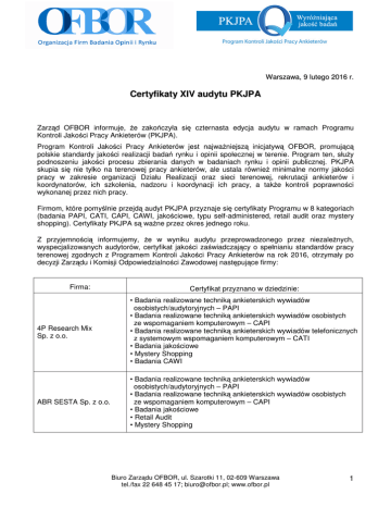 Warszawa, 9 lutego 2016 r. Certyfikaty XIV audytu PKJPA Zarząd OFBOR informuje, że zakończyła się czternasta edycja audytu w ramach Programu Kontroli Jakości Pracy Ankieterów (PKJPA). Program Kontroli Jakości Pracy Ankieterów jest najważniejszą inicjatywą OFBOR, promującą polskie standardy jakości realizacji badań rynku i opinii społecznej w terenie. Program ten, służy podnoszeniu jakości procesu zbierania danych w badaniach rynku i opinii publicznej. PKJPA skupia się nie tylko na terenowej pracy ankieterów, ale ustala również minimalne normy jakości pracy w zakresie organizacji Działu Realizacji oraz sieci terenowej, rekrutacji ankieterów i koordynatorów, ich szkolenia, nadzoru i koordynacji ich pracy, a także kontroli poprawności wykonanej przez nich pracy. Firmom, które pomyślnie przejdą audyt PKJPA przyznaje się certyfikaty Programu w 8 kategoriach (badania PAPI, CATI, CAPI, CAWI, jakościowe, typu self-administered, retail audit oraz mystery shopping). Certyfikaty PKJPA są ważne przez okres jednego roku. Z przyjemnością informujemy, że w wyniku audytu przeprowadzonego przez niezależnych, wyspecjalizowanych audytorów, certyfikat jakości zaświadczający o spełnianiu standardów pracy terenowej zgodnych z Programem Kontroli Jakości Pracy Ankieterów na rok 2016, otrzymały po decyzji Zarządu i Komisji Odpowiedzialności Zawodowej następujące firmy: Firma: Certyfikat przyznano w dziedzinie: 4P Research Mix Sp. z o.o. • Badania realizowane techniką ankieterskich wywiadów osobistych/audytoryjnych – PAPI • Badania realizowane techniką ankieterskich wywiadów osobistych ze wspomaganiem komputerowym – CAPI • Badania realizowane techniką ankieterskich wywiadów telefonicznych z systemowym wspomaganiem komputerowym – CATI • Badania jakościowe • Mystery Shopping • Badania CAWI ABR SESTA Sp. z o.o. • Badania realizowane techniką ankieterskich wywiadów osobistych/audytoryjnych – PAPI • Badania realizowane techniką ankieterskich wywiadów osobistych ze wspomaganiem komputerowym – CAPI • Badania jakościowe • Retail Audit • Mystery Shopping Biuro Zarządu OFBOR, ul. Szarotki 11, 02-609 Warszawa tel./fax 22 648 45 17; [email protected]; www.ofbor.pl 1 ACNielsen Polska Sp. z o.o. • Badania realizowane techniką ankieterskich wywiadów osobistych/audytoryjnych - PAPI • Badania realizowane techniką ankieterskich wywiadów osobistych ze wspomaganiem komputerowym - CAPI • Badania jakościowe • Retail Audit • Mystery Shopping AGB Nielsen Media Research • Badania, w których materiał przygotowywany jest samodzielnie przez badane osoby ALMARES Instytut Doradztwa i Badań Rynku • Badania realizowane techniką ankieterskich wywiadów osobistych/audytoryjnych - PAPI • Badania realizowane techniką ankieterskich wywiadów osobistych ze wspomaganiem komputerowym - CAPI • Badania jakościowe ARC Rynek i Opinia Sp. z o.o. • Badania realizowane techniką ankieterskich wywiadów osobistych/audytoryjnych - PAPI • Badania realizowane techniką ankieterskich wywiadów osobistych ze wspomaganiem komputerowym – CAPI • Badania realizowane techniką ankieterskich wywiadów telefonicznych z systemowym wspomaganiem komputerowym - CATI • Badania jakościowe • Mystery Shopping • Badania CAWI ASM - Centrum Badań i Analiz Rynku Sp. z o.o. • Badania realizowane techniką ankieterskich wywiadów osobistych/audytoryjnych - PAPI • Badania realizowane techniką ankieterskich wywiadów osobistych ze wspomaganiem komputerowym – CAPI • Badania realizowane techniką ankieterskich wywiadów telefonicznych z systemowym wspomaganiem komputerowym – CATI • Badania, w których materiał przygotowywany jest samodzielnie przez badane osoby • Badania jakościowe • Mystery Shopping • Badania CAWI BCMM – Badania Marketingowe Sp. z o.o. • Badania realizowane techniką ankieterskich wywiadów osobistych/audytoryjnych - PAPI • Badania realizowane techniką ankieterskich wywiadów telefonicznych z systemowym wspomaganiem komputerowym - CATI • Badania jakościowe BSM Pracownia Badawcza • Badania realizowane techniką ankieterskich wywiadów osobistych/audytoryjnych - PAPI • Badania jakościowe CEM Instytut Badań Rynku i Opinii Publicznej Sp. z o.o. • Badania realizowane techniką ankieterskich wywiadów telefonicznych z systemowym wspomaganiem komputerowym - CATI Centrum Badań • Badania realizowane techniką ankieterskich wywiadów Biuro Zarządu OFBOR, ul. Szarotki 11, 02-609 Warszawa tel./fax 22 648 45 17; [email protected]; www.ofbor.pl 2 Marketingowych INDICATOR Sp. z o.o. osobistych/audytoryjnych - PAPI • Badania realizowane techniką ankieterskich wywiadów osobistych ze wspomaganiem komputerowym – CAPI • Badania realizowane techniką ankieterskich wywiadów telefonicznych z systemowym wspomaganiem komputerowym - CATI • Badania jakościowe • Badania CAWI Dive Polska • Mystery Shopping Fundacja Centrum Badania Opinii Społecznej • Badania realizowane techniką ankieterskich wywiadów osobistych/audytoryjnych - PAPI • Badania realizowane techniką ankieterskich wywiadów osobistych ze wspomaganiem komputerowym - CAPI • Badania jakościowe • Badania CAWI GfK Polonia Sp. z o.o. • Badania realizowane techniką ankieterskich wywiadów osobistych/audytoryjnych - PAPI • Badania realizowane techniką ankieterskich wywiadów osobistych ze wspomaganiem komputerowym - CAPI • Badania realizowane techniką ankieterskich wywiadów telefonicznych z systemowym wspomaganiem komputerowym - CATI • Badania, w których materiał przygotowywany jest samodzielnie przez badane osoby • Badania jakościowe • Retail Audit • Mystery Shopping • Badania CAWI Grupa IQS Sp. z o.o. • Badania realizowane techniką ankieterskich wywiadów osobistych ze wspomaganiem komputerowym - CAPI • Badania realizowane techniką ankieterskich wywiadów telefonicznych z systemowym wspomaganiem kompute