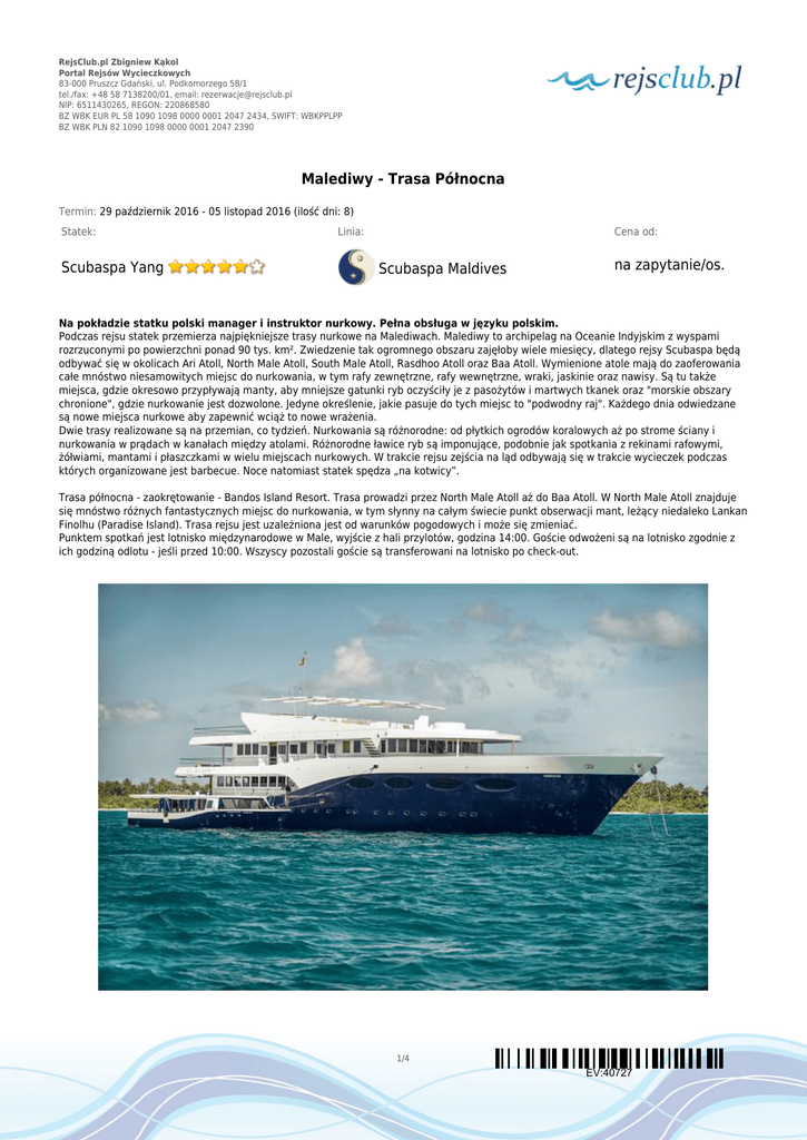 RejsClub.pl Zbigniew Kąkol Portal Rejsów Wycieczkowych 83-000 Pruszcz Gdański, ul. Podkomorzego 58/1 tel./fax: +48 58 7138200/01, email: [email protected] NIP: 6511430265, REGON: 220868580 BZ WBK EUR PL 58 1090 1098 0000 0001 2047 2434, SWIFT: WBKPPLPP BZ WBK PLN 82 1090 1098 0000 0001 2047 2390 Malediwy - Trasa Północna Termin: 29 październik 2016 - 05 listopad 2016 (ilość dni: 8) Statek: Scubaspa Yang Linia: Cena od: Scubaspa Maldives na zapytanie/os. Na pokładzie statku polski manager i instruktor nurkowy. Pełna obsługa w języku polskim. Podczas rejsu statek przemierza najpiękniejsze trasy nurkowe na Malediwach. Malediwy to archipelag na Oceanie Indyjskim z wyspami rozrzuconymi po powierzchni ponad 90 tys. km². Zwiedzenie tak ogromnego obszaru zajęłoby wiele miesięcy, dlatego rejsy Scubaspa będą odbywać się w okolicach Ari Atoll, North Male Atoll, South Male Atoll, Rasdhoo Atoll oraz Baa Atoll. Wymienione atole mają do zaoferowania całe mnóstwo niesamowitych miejsc do nurkowania, w tym rafy zewnętrzne, rafy wewnętrzne, wraki, jaskinie oraz nawisy. Są tu także miejsca, gdzie okresowo przypływają manty, aby mniejsze gatunki ryb oczyściły je z pasożytów i martwych tkanek oraz "morskie obszary chronione", gdzie nurkowanie jest dozwolone. Jedyne określenie, jakie pasuje do tych miejsc to "podwodny raj". Każdego dnia odwiedzane są nowe miejsca nurkowe aby zapewnić wciąż to nowe wrażenia. Dwie trasy realizowane są na przemian, co tydzień. Nurkowania są różnorodne: od płytkich ogrodów koralowych aż po strome ściany i nurkowania w prądach w kanałach między atolami. Różnorodne ławice ryb są imponujące, podobnie jak spotkania z rekinami rafowymi, żółwiami, mantami i płaszczkami w wielu miejscach nurkowych. W trakcie rejsu zejścia na ląd odbywają się w trakcie wycieczek podczas których organizowane jest barbecue. Noce natomiast statek spędza „na kotwicy”. Trasa północna - zaokrętowanie - Bandos Island Resort. Trasa prowadzi przez North Male Atoll aż do Baa Atoll. W North Male Atoll znajduje się mnóstwo różnych fantastycznych miejsc do nurkowania, w tym słynny na całym świecie punkt obserwacji mant, leżący niedaleko Lankan Finolhu (Paradise Island). Trasa rejsu jest uzależniona jest od warunków pogodowych i może się zmieniać. Punktem spotkań jest lotnisko międzynarodowe w Male, wyjście z hali przylotów, godzina 14:00. Goście odwożeni są na lotnisko zgodnie z ich godziną odlotu - jeśli przed 10:00. Wszyscy pozostali goście są transferowani na lotnisko po check-out. 1/4 EV:40727 RejsClub.pl Zbigniew Kąkol Portal Rejsów Wycieczkowych 83-000 Pruszcz Gdański, ul. Podkomorzego 58/1 tel./fax: +48 58 7138200/01, email: [email protected] NIP: 6511430265, REGON: 220868580 BZ WBK EUR PL 58 1090 1098 0000 0001 2047 2434, SWIFT: WBKPPLPP BZ WBK PLN 82 1090 1098 0000 0001 2047 2390 TRASA REJSU dzień 1 Data Port Wpłynięcie Wypłynięcie sobota 29.10.2016 Male --:-- 14:00 Legenda Malediwy Przywitanie na lotnisku, transfer na statek, koktajl powitalny i zakwaterowanie w kabinie. Przepłynięcie w kierunku Boduhithi. Prezentacja załogi i szkolenie z zakresu bezpieczeństwa. dzień 2 niedziela 30.10.2016 Boduhithi Thila --:-- --:-- --:-- --:-- --:-- --:-- Malediwy Poranne nurkowanie. dzień 2 niedziela 30.10.2016 Manta Road Malediwy Drugie nurkowanie. dzień 2 niedziela 30.10.2016 Rasfari North Malediwy Trzecie nurkowanie. Przepłyniecie w kierunku Rasdhoo Atoll. Koktajl o zachodzie słońca na Sun Deck'u. dzień 3 poniedziałek 31.10.2016 Rasdhoo Madivivaru, North Ari Atoll --:-- --:-- --:-- --:-- --:-- --:-- --:-- --:-- --:-- --:-- --:-- --:-- --:-- --:-- --:-- --:-- --:-- --:-- Malediwy Poranne nurkowanie. Przepłyniecie w kierunku North Ari Atoll. dzień 3 poniedziałek 31.10.2016 Hafsaa Thila, North Ari Atoll Malediwy Drugie nurkowanie. dzień 3 poniedziałek 31.10.2016 Fish Head, North Ari Atoll Malediwy Trzecie nurkowanie. Kolacja barbecue na bezludnej wyspie Alikoirah. dzień 4 wtorek 01.11.2016 Hafsaa Thila, North Ari Atoll Malediwy Poranne nurkowanie. dzień 4 wtorek 01.11.2016 Emas Thila Malediwy Drugie nurkowanie. Nocne nurkowanie na MaavaruFaru. dzień 5 środa 02.11.2016 Thundufushi Thila Malediwy Poranne nurkowanie. dzień 5 środa 02.11.2016 Bulhaalhohi Corner Malediwy Drugie nurkowanie. dzień 5 środa 02.11.2016 Rangali Beyru Malediwy Trzecie nurkowanie. dzień 6 czwartek 03.11.2016 Rangali Madivaru Malediwy 2/4 EV:40727 RejsClub.pl Zbigniew Kąkol Portal Rejsów Wycieczkowych 83-000 Pruszcz Gdański, ul. Podkomorzego 58/1 tel./fax: +48 58 7138200/01, email: [email protected] NIP: 6511430265, REGON: 220868580 BZ WBK EUR PL 58 1090 1098 0000 0001 2047 2434, SWIFT: WBKPPLPP BZ WBK PLN 82 1090 1098 0000 0001 2047 2390 Data Port Wpłynięcie Wypłynięcie Nalaguraidhoo Beyru --:-- --:-- --:-- --:-- Legenda Poranne nurkowanie. dzień 6 czwartek 03.11.2016 Malediwy Oglądanie rekina wielorybiego / drugie nurkowanie. dzień 6 czwartek 03.11.2016 Kudarah Thila Malediwy Trzecie nurkowanie. Nocne przepłyniecie w kierunku South Male Atoll. dzień 7 piątek 04.11.2016 Cocoa Corner --:-- --:-- --:-- --:-- Malediwy Poranne nurkowanie. dzień 7 piątek 04.11.2016 Ghuraidoo Malediwy Drugie nurkowanie. Popołudniu możliwość skorzystania z wycieczki fakultatywnej Male City Tour. Kotwiczymy niedaleko Kurumba / Hulhumale. dzień 8 sobota 05.11.2016 Male --:-- --:-- Malediwy Wyokrętowanie, transfer na lotnisko. Pokazane w tabelce punkty na trasie to w większości miejsca nurkowe. Jest to tylko przykładowa trasa północna. Elementy trasy mogą ulec zmianie w zależności od pogody lub warunków. CENNIK Cena katalogowa Kabina zewnętrzna z oknem Suite (apartament) Kabina jednoosobowa 3 osoba dorosła w kabinie Cena promocyjna $1 815.00 $2 025.00 - $2 625.00 +50% zniżka 25% Uwaga! Ceny za osobę w kabinie dwuosobowej. Cena zawiera: zakwaterowanie w wybranej kabinie - 7 noclegów; serwis kabinowy; serwis bag