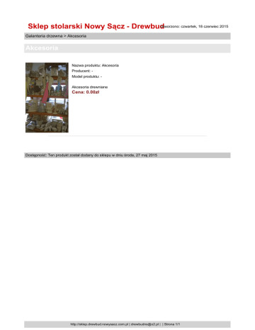 Utworzono: czwartek, 18 czerwiec 2015 Sklep stolarski Nowy Sącz - Drewbud Galanteria drzewna > Akcesoria Akcesoria Nazwa produktu: Akcesoria Producent: Model produktu: Akcesoria drewniane Cena: 0.00zł Dostępność: Ten produkt został dodany do sklepu w dniu środa, 27 maj 2015 http://sklep.drewbud.nowysacz.com.pl | [email protected] | | Strona 1/1