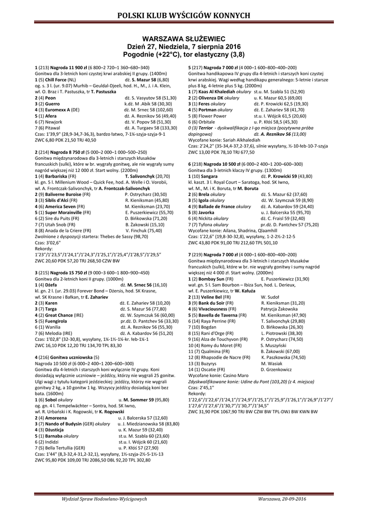 POLSKI KLUB WYŚCIGÓW KONNYCH WARSZAWA SŁUŻEWIEC Dzień 27, Niedziela, 7 sierpnia 2016 Pogodnie (+22°C), tor elastyczny (3,8) 1 (213) Nagroda 11 900 zł (6 800–2 720–1 360–680–340) Gonitwa dla 3-letnich koni czystej krwi arabskiej II grupy. (1400m) 1 (5) Chill Force (NL) dż. S. Mazur 58 (6,80) og. s. 3 l. (ur. 9.07) Murhib – Geuldal-Djeeli, hod. H., M., J. i A. Klein, wł. O. Braz i T. Pastuszka, tr T. Pastuszka 2 (4) Peon dż. S. Vasyutov 58 (51,30) 3 (2) Guerro k.dż. M .Abík 58 (30,30) 4 (3) Euromexx A (DE) dż. M. Srnec 58 (102,60) 5 (1) Afera dż. A. Reznikov 56 (49,40) 6 (7) Newjork dż. V. Popov 58 (51,30) 7 (6) Pitawal dż. A. Turgaev 58 (133,30) Czas: 1'39,9" (28,9-34,7-36,3), bardzo łatwo, 7-1¼-szyja-szyja-9-1 ZWC 6,80 PDK 21,50 TRJ 40,50 2 (214) Nagroda 8 750 zł (5 000–2 000–1 000–500–250) Gonitwa międzynarodowa dla 3-letnich i starszych kłusaków francuskich (sulki), które w br. wygrały gonitwę, ale nie wygrały sumy nagród większej niż 12 000 zł. Start wolny. (2200m) 1 (4) Barbariska (FR) T. Salivonchyk (20,70) kl. gn. 5 l. Millenium Wood – Quick Fee, hod. A. Welle i O. Vorobii, wł. A. Frontczak-Salivonchyk, tr A. Frontczak-Salivonchyk 2 (9) Baliverne Buroise (FR) P. Ostrycharz (30,50) 3 (3) Siblis d'Alci (FR) R. Kieniksman (45,80) 4 (6) America Seven (FR) M. Kieniksman (23,70) 5 (1) Super Morainville (FR) E. Puszerkiewicz (55,70) 6 (2) Sire du Puits (FR) D. Bińkowska (71,20) 7 (7) Utah Snob (FR) B. Żakowski (15,10) 8 (8) Anada de la Criere (FR) V. Finchuk (75,40) Zwolnione z dyspozycji startera: Thebes de Sassy (98,70) Czas: 3'02,6" Rekordy: 1’23”/1’23,5”/1’24,1”/1’24,3”/1’25,1”/1’25,4”/1’28,5”/1’29,5” ZWC 20,60 PDK 57,20 TRJ 268,50 CZW BW 3 (215) Nagroda 15 750 zł (9 000–3 600–1 800–900–450) Gonitwa dla 2-letnich koni II grupy. (1000m) 1 (4) Dżefa dż. M. Srnec 56 (16,10) kl. gn. 2 l. (ur. 29.03) Forever Bond – Dżersis, hod. SK Krasne, wł. SK Krasne i Bałkan, tr E. Zahariev 2 (3) Karen dż. E. Zahariev 58 (10,20) 3 (7) Targa dż. S. Mazur 56 (77,80) 4 (2) Great Chance (IRE) dż. W. Szymczuk 56 (60,00) 5 (5) Fuengirola pr.dż. D. Pantchev 56 (33,30) 6 (1) Wanilia dż. A. Reznikov 56 (55,30) 7 (6) Melodia (IRE) dż. A. Kabardov 56 (51,20) Czas: 1'02,8" (32-30,8), wysyłany, 1¼-1½-1¼-kr. łeb-1¼-1 ZWC 16,10 PDK 12,20 TRJ 134,70 TPL 83,30 4 (216) Gonitwa uczniowska (5) Nagroda 10 500 zł (6 000–2 400–1 200–600–300) Gonitwa dla 4-letnich i starszych koni wyłącznie IV grupy. Koni dosiadają wyłącznie uczniowie – jeźdźcy, którzy nie wygrali 25 gonitw. Ulgi wagi z tytułu kategorii jeździeckiej: jeźdźcy, którzy nie wygrali gonitwy 2 kg, a 10 gonitw 1 kg. Wszyscy jeźdźcy dosiadają koni bez bata. (1600m) 1 (6) Sobol okulary u. M. Sommer 59 (95,80) og. gn. 4 l. Tempelwächter – Sontra, hod. SK Iwno, wł. R. Urbański i K. Rogowski, tr K. Rogowski 2 (4) Amoreena u. J. Balcerska 57 (12,60) 3 (7) Nando of Budysin (GER) okulary u. J. Miedzianowska 58 (83,80) 4 (3) Dżusticja u. K. Mazur 59 (32,40) 5 (1) Barnaba okulary st.u. M. Szabla 60 (23,60) 6 (2) Indidzi st.u. I. Wójcik 60 (21,60) 7 (5) Bella Tertullia (GER) u. P. Kłóś 57 (27,90) Czas: 1'44" (8,3-32,4-31,2-32,1), wysyłany, 1½-szyja-2½-5-1½-13 ZWC 95,80 PDK 109,00 TRJ 2086,50 DBL 92,20 TPL 302,80 Wydział Spraw Hodowlano-Wyścigowych 5 (217) Nagroda 7 000 zł (4 000–1 600–800–400–200) Gonitwa handikapowa IV grupy dla 4-letnich i starszych koni czystej krwi arabskiej. Wagi według handikapu generalnego: 5-letnie i starsze plus 8 kg, 4-letnie plus 5 kg. (2000m) 1 (7) Kaas Al Khalediah okulary st.u. M. Szabla 51 (52,90) 2 (2) Olivenza DK okulary u. K. Mazur 60,5 (69,00) 3 (1) Feres okulary dż. P. Krowicki 62,5 (19,30) 4 (5) Portman okulary dż. E. Zahariev 58 (41,70) 5 (8) Flower Power st.u. I. Wójcik 61,5 (20,60) 6 (6) Orbitale u. P. Kłóś 58,5 (45,30) 0 (3) Terrior - dyskwalifikacja z I-go miejsca (pozytywna próba dopingowa) dż. A. Reznikov 56 (13,00) Wycofane konie: Sariah Alkhalediah Czas: 2'24,2" (35-34,4-37,2-37,6), silnie wysyłany, ½-10-łeb-10-7-szyja ZWC 13,00 PDK 78,10 TRJ 677,50 6 (218) Nagroda 10 500 zł (6 000–2 400–1 200–600–300) Gonitwa dla 3-letnich klaczy IV grupy. (1300m) 1 (10) Sangara dż. P. Krowicki 59 (43,80) kl. kaszt. 3 l. Royal Court – Saratoga, hod. SK Iwno, wł. M., M. i K. Boruta, tr M. Boruta 2 (6) Brela okulary dż. S. Mazur 62 (37,60) 3 (5) Igola okulary dż. W. Szymczuk 59 (8,90) 4 (9) Ballade de France okulary dż. A. Kabardov 59 (24,40) 5 (8) Javorka u. J. Balcerska 55 (95,70) 6 (4) Nickita okulary dż. C. Fraisl 59 (32,40) 7 (7) Tyfona okulary pr.dż. D. Pantchev 57 (75,20) Wycofane konie: Ailana, Shadrina, Qlaamhill Czas: 1'22,6" (19,8-30-32,8), wysyłany, 1-2-2½-2-12-5 ZWC 43,80 PDK 91,00 TRJ 212,60 TPL 501,10 7 (219) Nagroda 7 000 zł (4 000–1 600–800–400–200) Gonitwa międzynarodowa dla 3-letnich i starszych kłusaków francuskich (sulki), które w br. nie wygrały gonitwy i sumy nagród większej niż 4 000 zł. Start wolny. (2000m) 1 (2) Bombay Sun (FR) E. Puszerkiewicz (31,90) wał. gn. 5 l. Sam Bourbon – Ibiza Sun, hod. L. Derieux, wł. E. Puszerkiewicz, tr W. Kałuża 2 (13) Veline Bel (FR) W. Sudoł 3 (9) Bank du Soir (FR) R. Kieniksman (31,20) 4 (6) Vivaciousness (FR) Patrycja Żakowska 5 (5) Bavella de Taverna (FR) M. Kieniksman (47,90) 6 (14) Raya Perrine (FR) T. Salivonchyk (29,80) 7 (10) Bogdan D. Bińkowska (26,30) 8 (15) Rani d'Orge (FR) L. Piotrowski (38,30) 9 (16) Alza de Touchyvon (FR) P. Ostrycharz (74,50) 10 (4) Romy du Moret (FR) S. Muszyński 11 (7) Qualmina (FR) B. Żakowski (67,00) 12 (8) Rhapsodie de Nacre (FR) K. Paszkowska (74,50) 13 (3) Buzyrys M. Wasiak 14 (1) Oscatie (FR) D. Grzenkowicz Wycofane konie: Casino Maro Zdyskwalifikowane konie: Udine du Pont (103,20) (z 4. miejsca) Czas: 2'45,1" Rekordy: 1’22,6”/1’22,6”/1’24,1”/1’24,9”/1’25,1”/1’25,9”/1’26,1”/1’26,9”/1’27”/ 1’27