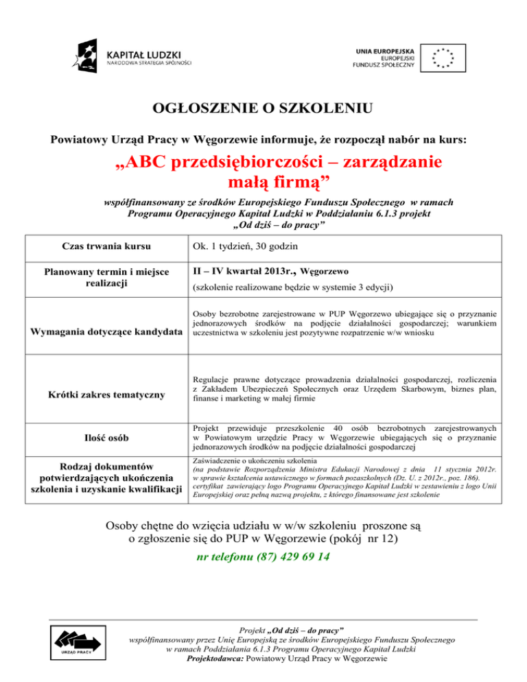 OGŁOSZENIE O SZKOLENIU Powiatowy Urząd Pracy w Węgorzewie informuje, że rozpoczął nabór na kurs: „ABC przedsiębiorczości – zarządzanie małą firmą” współfinansowany ze środków Europejskiego Funduszu Społecznego w ramach Programu Operacyjnego Kapitał Ludzki w Poddziałaniu 6.1.3 projekt „Od dziś – do pracy” Czas trwania kursu Planowany termin i miejsce realizacji Ok. 1 tydzień, 30 godzin II – IV kwartał 2013r., Węgorzewo (szkolenie realizowane będzie w systemie 3 edycji) Wymagania dotyczące kandydata Osoby bezrobotne zarejestrowane w PUP Węgorzewo ubiegające się o przyznanie jednorazowych środków na podjęcie działalności gospodarczej; warunkiem uczestnictwa w szkoleniu jest pozytywne rozpatrzenie w/w wniosku Krótki zakres tematyczny Regulacje prawne dotyczące prowadzenia działalności gospodarczej, rozliczenia z Zakładem Ubezpieczeń Społecznych oraz Urzędem Skarbowym, biznes plan, finanse i marketing w małej firmie Ilość osób Projekt przewiduje przeszkolenie 40 osób bezrobotnych zarejestrowanych w Powiatowym urzędzie Pracy w Węgorzewie ubiegających się o przyznanie jednorazowych środków na podjęcie działalności gospodarczej Rodzaj dokumentów potwierdzających ukończenia szkolenia i uzyskanie kwalifikacji Zaświadczenie o ukończeniu szkolenia (na podstawie Rozporządzenia Ministra Edukacji Narodowej z dnia 11 stycznia 2012r. w sprawie kształcenia ustawicznego w formach pozaszkolnych (Dz. U. z 2012r., poz. 186). certyfikat zawierający logo Programu Operacyjnego Kapitał Ludzki w zestawieniu z logo Unii Europejskiej oraz pełną nazwą projektu, z którego finansowane jest szkolenie Osoby chętne do wzięcia udziału w w/w szkoleniu proszone są o zgłoszenie się do PUP w Węgorzewie (pokój nr 12) nr telefonu (87) 429 69 14 Projekt „Od dziś – do pracy” współfinansowany przez Unię Europejską ze środków Europejskiego Funduszu Społecznego w ramach Poddziałania 6.1.3 Programu Operacyjnego Kapitał Ludzki Projektodawca: Powiatowy Urząd Pracy w Węgorzewie