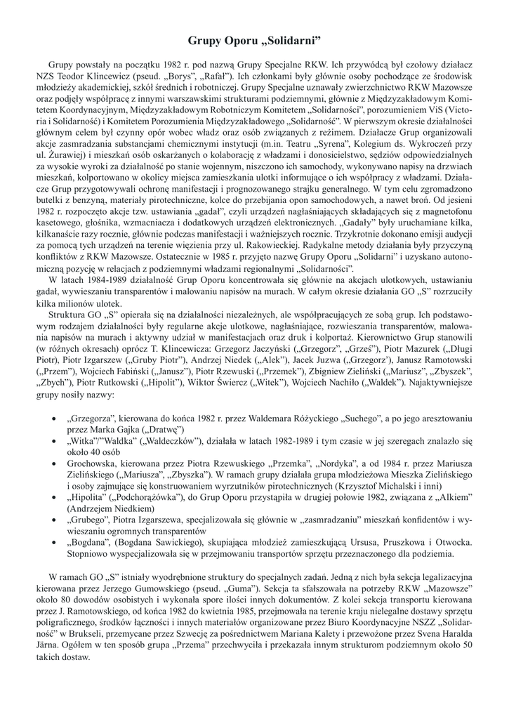 Grupy Oporu „Solidarni” Grupy powstały na początku 1982 r. pod nazwą Grupy Specjalne RKW. Ich przywódcą był czołowy działacz NZS Teodor Klincewicz (pseud. „Borys”, „Rafał”). Ich członkami były głównie osoby pochodzące ze środowisk młodzieży akademickiej, szkół średnich i robotniczej. Grupy Specjalne uznawały zwierzchnictwo RKW Mazowsze oraz podjęły współpracę z innymi warszawskimi strukturami podziemnymi, głównie z Międzyzakładowym Komitetem Koordynacyjnym, Międzyzakładowym Robotniczym Komitetem „Solidarności”, porozumieniem ViS (Victoria i Solidarność) i Komitetem Porozumienia Międzyzakładowego „Solidarność”. W pierwszym okresie działalności głównym celem był czynny opór wobec władz oraz osób związanych z reżimem. Działacze Grup organizowali akcje zasmradzania substancjami chemicznymi instytucji (m.in. Teatru „Syrena”, Kolegium ds. Wykroczeń przy ul. Żurawiej) i mieszkań osób oskarżanych o kolaborację z władzami i donosicielstwo, sędziów odpowiedzialnych za wysokie wyroki za działalność po stanie wojennym, niszczono ich samochody, wykonywano napisy na drzwiach mieszkań, kolportowano w okolicy miejsca zamieszkania ulotki informujące o ich współpracy z władzami. Działacze Grup przygotowywali ochronę manifestacji i prognozowanego strajku generalnego. W tym celu zgromadzono butelki z benzyną, materiały pirotechniczne, kolce do przebijania opon samochodowych, a nawet broń. Od jesieni 1982 r. rozpoczęto akcje tzw. ustawiania „gadał”, czyli urządzeń nagłaśniających składających się z magnetofonu kasetowego, głośnika, wzmacniacza i dodatkowych urządzeń elektronicznych. „Gadały” były uruchamiane kilka, kilkanaście razy rocznie, głównie podczas manifestacji i ważniejszych rocznic. Trzykrotnie dokonano emisji audycji za pomocą tych urządzeń na terenie więzienia przy ul. Rakowieckiej. Radykalne metody działania były przyczyną konfliktów z RKW Mazowsze. Ostatecznie w 1985 r. przyjęto nazwę Grupy Oporu „Solidarni” i uzyskano autonomiczną pozycję w relacjach z podziemnymi władzami regionalnymi „Solidarności”. W latach 1984-1989 działalność Grup Oporu koncentrowała się głównie na akcjach ulotkowych, ustawianiu gadał, wywieszaniu transparentów i malowaniu napisów na murach. W całym okresie działania GO „S” rozrzuciły kilka milionów ulotek. Struktura GO „S” opierała się na działalności niezależnych, ale współpracujących ze sobą grup. Ich podstawowym rodzajem działalności były regularne akcje ulotkowe, nagłaśniające, rozwieszania transparentów, malowania napisów na murach i aktywny udział w manifestacjach oraz druk i kolportaż. Kierownictwo Grup stanowili (w różnych okresach) oprócz T. Klincewicza: Grzegorz Jaczyński („Grzegorz”, „Grześ”), Piotr Mazurek („Długi Piotr), Piotr Izgarszew („Gruby Piotr”), Andrzej Niedek („Alek”), Jacek Juzwa („Grzegorz’), Janusz Ramotowski („Przem”), Wojciech Fabiński („Janusz”), Piotr Rzewuski („Przemek”), Zbigniew Zieliński („Mariusz”, „Zbyszek”, „Zbych”), Piotr Rutkowski („Hipolit”), Wiktor Świercz („Witek”), Wojciech Nachiło („Waldek”). Najaktywniejsze grupy nosiły nazwy: • „Grzegorza”, kierowana do końca 1982 r. przez Waldemara Różyckiego „Suchego”, a po jego aresztowaniu przez Marka Gajka („Dratwę”) • „Witka”/”Waldka” („Waldeczków”), działała w latach 1982-1989 i tym czasie w jej szeregach znalazło się około 40 osób • Grochowska, kierowana przez Piotra Rzewuskiego „Przemka”, „Nordyka”, a od 1984 r. przez Mariusza Zielińskiego („Mariusza”, „Zbyszka”). W ramach grupy działała grupa młodzieżowa Mieszka Zielińskiego i osoby zajmujące się konstruowaniem wyrzutników pirotechnicznych (Krzysztof Michalski i inni) • „Hipolita” („Podchorążówka”), do Grup Oporu przystąpiła w drugiej połowie 1982, związana z „Alkiem” (Andrzejem Niedkiem) • „Grubego”, Piotra Izgarszewa, specjalizowała się głównie w „zasmradzaniu” mieszkań konfidentów i wywieszaniu ogromnych transparentów • „Bogdana”, (Bogdana Sawickiego), skupiająca młodzież zamieszkującą Ursusa, Pruszkowa i Otwocka. Stopniowo wyspecjalizowała się w przejmowaniu transportów sprzętu przeznaczonego dla podziemia. W ramach GO „S” istniały wyodrębnione struktury do specjalnych zadań. Jedną z nich była sekcja legalizacyjna kierowana przez Jerzego Gumowskiego (pseud. „Guma”). Sekcja ta sfałszowała na potrzeby RKW „Mazowsze” około 80 dowodów osobistych i wykonała spore ilości innych dokumentów. Z kolei sekcja transportu kierowana przez J. Ramotowskiego, od końca 1982 do kwietnia 1985, przejmowała na terenie kraju nielegalne dostawy sprzętu poligraficznego, środków łączności i innych materiałów organizowane przez Biuro Koordynacyjne NSZZ „Solidarność” w Brukseli, przemycane przez Szwecję za pośrednictwem Mariana Kalety i przewożone przez Svena Haralda Järna. Ogółem w ten sposób grupa „Przema” przechwyciła i przekazała innym strukturom podziemnym około 50 takich dostaw. W ramach Grup Oporu w 1983 roku powstała Oficyna Wydawnicza „Rytm”. Oprócz wydawanych książek drukowano również ulotki i znaczki poczty podziemnej. Do 1989 r. oficyna wydała ponad 50 tytułów, w tym Drogę nadziei Lecha Wałęsy. Działalność wydawnicza przynosiła dochody pozwalające finansować działalność Grup. Z kolei w latach 1985-1989 GO „S” wydawały „Kuriera Mazowsza”, wykorzystywanego podczas akcji ulotkowania, wykonywanych na terenie Warszawy i rozrzucany głównie z dachów. Z Grupami współpracowali inni drukarze, jak Tomasz Przybyszewski czy Paweł Kozera. Dokumentacja fotograficzna działalności Grup była prowadzona w latach 1985-1989 przez Krzysztofa Frydrycha. Przedstawicielem na emigracji był mieszkający w S