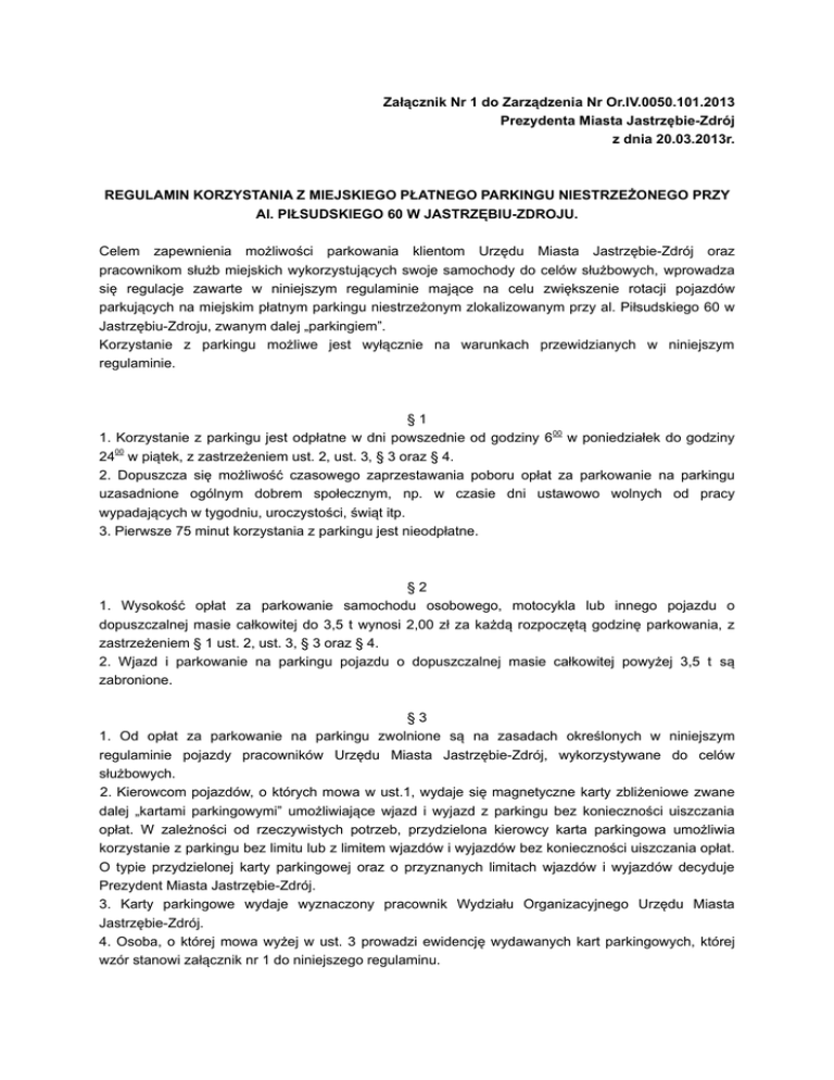 Załącznik Nr 1 do Zarządzenia Nr Or.IV.0050.101.2013 Prezydenta Miasta Jastrzębie-Zdrój z dnia 20.03.2013r. REGULAMIN KORZYSTANIA Z MIEJSKIEGO PŁATNEGO PARKINGU NIESTRZEŻONEGO PRZY Al. PIŁSUDSKIEGO 60 W JASTRZĘBIU-ZDROJU. Celem zapewnienia możliwości parkowania klientom Urzędu Miasta Jastrzębie-Zdrój oraz pracownikom służb miejskich wykorzystujących swoje samochody do celów służbowych, wprowadza się regulacje zawarte w niniejszym regulaminie mające na celu zwiększenie rotacji pojazdów parkujących na miejskim płatnym parkingu niestrzeżonym zlokalizowanym przy al. Piłsudskiego 60 w Jastrzębiu-Zdroju, zwanym dalej „parkingiem”. Korzystanie z parkingu możliwe jest wyłącznie na warunkach przewidzianych w niniejszym regulaminie. §1 00 1. Korzystanie z parkingu jest odpłatne w dni powszednie od godziny 6 w poniedziałek do godziny 00 24 w piątek, z zastrzeżeniem ust. 2, ust. 3, § 3 oraz § 4. 2. Dopuszcza się możliwość czasowego zaprzestawania poboru opłat za parkowanie na parkingu uzasadnione ogólnym dobrem społecznym, np. w czasie dni ustawowo wolnych od pracy wypadających w tygodniu, uroczystości, świąt itp. 3. Pierwsze 75 minut korzystania z parkingu jest nieodpłatne. §2 1. Wysokość opłat za parkowanie samochodu osobowego, motocykla lub innego pojazdu o dopuszczalnej masie całkowitej do 3,5 t wynosi 2,00 zł za każdą rozpoczętą godzinę parkowania, z zastrzeżeniem § 1 ust. 2, ust. 3, § 3 oraz § 4. 2. Wjazd i parkowanie na parkingu pojazdu o dopuszczalnej masie całkowitej powyżej 3,5 t są zabronione. §3 1. Od opłat za parkowanie na parkingu zwolnione są na zasadach określonych w niniejszym regulaminie pojazdy pracowników Urzędu Miasta Jastrzębie-Zdrój, wykorzystywane do celów służbowych. 2. Kierowcom pojazdów, o których mowa w ust.1, wydaje się magnetyczne karty zbliżeniowe zwane dalej „kartami parkingowymi” umożliwiające wjazd i wyjazd z parkingu bez konieczności uiszczania opłat. W zależności od rzeczywistych potrzeb, przydzielona kierowcy karta parkingowa umożliwia korzystanie z parkingu bez limitu lub z limitem wjazdów i wyjazdów bez konieczności uiszczania opłat. O typie przydzielonej karty parkingowej oraz o przyznanych limitach wjazdów i wyjazdów decyduje Prezydent Miasta Jastrzębie-Zdrój. 3. Karty parkingowe wydaje wyznaczony pracownik Wydziału Organizacyjnego Urzędu Miasta Jastrzębie-Zdrój. 4. Osoba, o której mowa wyżej w ust. 3 prowadzi ewidencję wydawanych kart parkingowych, której wzór stanowi załącznik nr 1 do niniejszego regulaminu. 5. Do odbioru kart parkingowych upoważnieni są naczelnicy poszczególnych wydziałów Urzędu Miasta Jastrzębie-Zdrój. 6. Osoby, o których mowa w ust. 5 potwierdzają własnoręcznym podpisem odebranie karty parkingowej, co jednocześnie oznacza zaakceptowanie wszystkich postanowień niniejszego regulaminu. 7. Karty parkingowe są własnością Miasta Jastrzębie-Zdrój - Jastrzębskiego Zakładu Komunalnego w Jastrzębiu-Zdroju i po ustaniu okoliczności uprawniających do ich wydania podlegają zwrotowi właścicielowi. Za zwrot wydanych kart parkingowych odpowiadają osoby, o których mowa w ust. 5. Karty parkingowe należy zwracać za potwierdzeniem, bezpośrednio osobie, o której mowa w ust. 3. 8. Karty parkingowe ważne są do końca roku kalendarzowego, w którym zostały wydane. Warunkiem wydania nowej karty parkingowej na kolejny rok kalendarzowy jest uprzednie zwrócenie właścicielowi wcześniej wydanej karty parkingowej lub uiszczenie opłaty, o której mowa ust. 9. 9. Z tytułu zniszczenia, uszkodzenia lub zagubienia karty parkingowej pobierana jest opłata w wysokości 50,00 zł. Opłatę należy uiszczać gotówką w kasie Jastrzębskiego Zakładu Komunalnego mieszczącej się przy ul. Dworcowej 17d w Jastrzębiu-Zdroju lub przelewem na konto bankowe Jastrzębskiego Zakładu Komunalnego w Jastrzębiu-Zdroju nr 28 8470 0001 2001 0029 7123 0002. §4 1. Od opłat za parkowanie na parkingu zwolnione są pojazdy osób i instytucji odwiedzających Urząd Miasta Jastrzębie-Zdrój na zaproszenie Prezydenta Miasta Jastrzębie-Zdrój. 2. Kierowcom pojazdów, o których mowa w ust. 1 wydaje się jednorazowe bilety wyjazdowe, umożliwiające wyjazd z parkingu bez konieczności uiszczania opłat. 3. Bilety, o których mowa w ust. 2 wydawane są przez wyznaczonych pracowników Wydziału Organizacyjnego Urzędu Miasta Jastrzębie-Zdrój za zgodą Prezydenta Miasta Jastrzębie-Zdrój lub osób upoważnionych przez Prezydenta Miasta Jastrzębie-Zdrój. 4. Bilety, o których mowa w ust. 2 wydawane są za pisemnym pokwitowaniem ich odebrania w ewidencji biletów jednorazowych, którą zobowiązani są prowadzić wyznaczeni pracownicy Wydziału Organizacyjnego Urzędu Miasta Jastrzębie-Zdrój, o których mowa w ust. 3. 5. Wzór ewidencji jednorazowych biletów wyjazdowych stanowi załącznik nr 2 do niniejszego regulaminu. §5 Pobieranie należnej opłaty za parkowanie na parkingu odbywa się przy pomocy automatycznego systemu poboru opłat parkingowych, którego administratorem jest Jastrzębski Zakład Komunalny w Jastrzębiu-Zdroju. §6 1. Obowiązkiem użytkownika korzystającego z płatnych niestrzeżonych miejsc parkingowych na parkingu jest opłacenie parkowania poprzez wykupienie biletu w kasie automatycznego systemu poboru opłat parkingowych, zlokalizowanej przy wejściu głównym budynku Urzędu Miasta JastrzębieZdrój, z zastrzeżeniem § 1 ust. 2, ust. 3, §3 oraz §4. 2. Wszelkich płatności dotyczących należności za parkowanie pojazdu na parkingu należy dokonywać gotówką. §7 Procedura parkowania pojazdu na parkingu przedstawia się następująco: 1. Przed wjazdem pojazdu na parking należy zatrzymać pojazd przed szlabanem wjazdowym i pobrać bilet wjazdowy, który należy bezwzględnie zachować, w celu uiszczenia opłaty. Pobranie biletu wjazdowego powoduje podniesienie się szlabanu wjazdowego, co umożliw