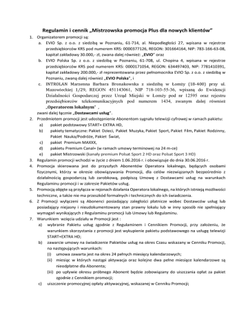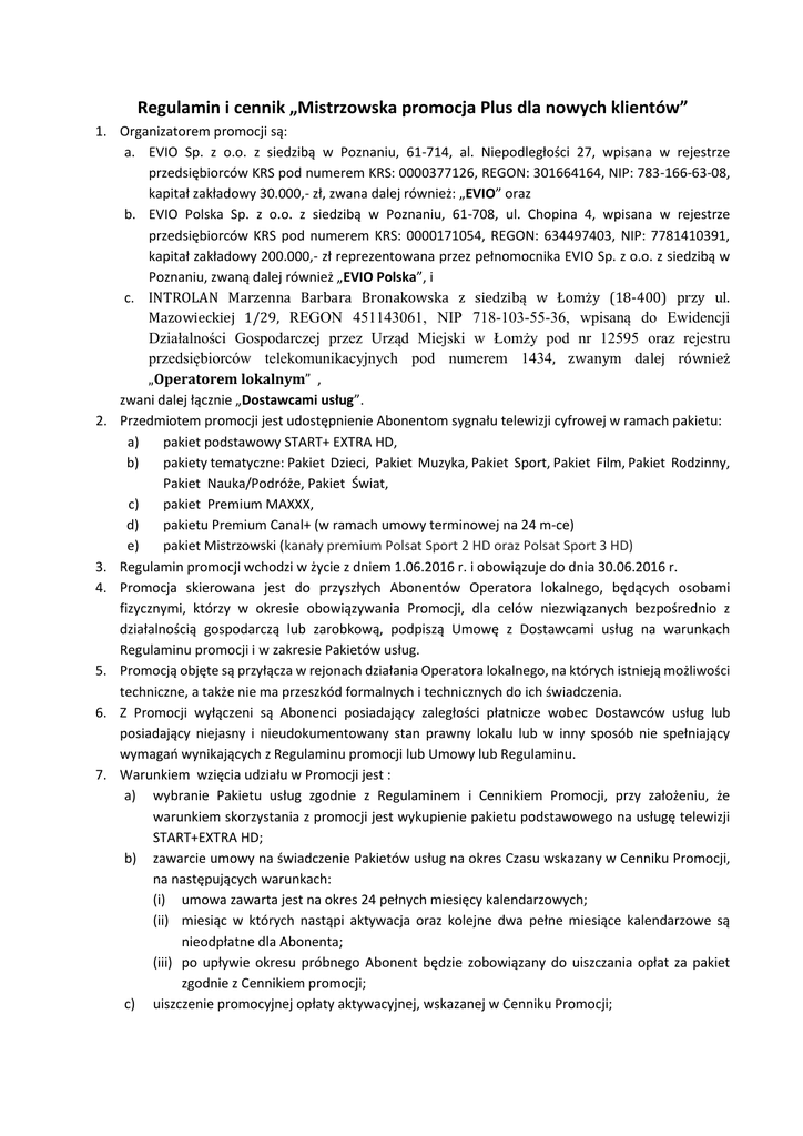 Regulamin i cennik „Mistrzowska promocja Plus dla nowych klientów” 1. Organizatorem promocji są: a. EVIO Sp. z o.o. z siedzibą w Poznaniu, 61-714, al. Niepodległości 27, wpisana w rejestrze przedsiębiorców KRS pod numerem KRS: 0000377126, REGON: 301664164, NIP: 783-166-63-08, kapitał zakładowy 30.000,- zł, zwana dalej również: „EVIO” oraz b. EVIO Polska Sp. z o.o. z siedzibą w Poznaniu, 61-708, ul. Chopina 4, wpisana w rejestrze przedsiębiorców KRS pod numerem KRS: 0000171054, REGON: 634497403, NIP: 7781410391, kapitał zakładowy 200.000,- zł reprezentowana przez pełnomocnika EVIO Sp. z o.o. z siedzibą w Poznaniu, zwaną dalej również „EVIO Polska”, i c. INTROLAN Marzenna Barbara Bronakowska z siedzibą w Łomży (18-400) przy ul. Mazowieckiej 1/29, REGON 451143061, NIP 718-103-55-36, wpisaną do Ewidencji Działalności Gospodarczej przez Urząd Miejski w Łomży pod nr 12595 oraz rejestru przedsiębiorców telekomunikacyjnych pod numerem 1434, zwanym dalej również „Operatorem lokalnym” , zwani dalej łącznie „Dostawcami usług”. 2. Przedmiotem promocji jest udostępnienie Abonentom sygnału telewizji cyfrowej w ramach pakietu: a) pakiet podstawowy START+ EXTRA HD, b) pakiety tematyczne: Pakiet Dzieci, Pakiet Muzyka, Pakiet Sport, Pakiet Film, Pakiet Rodzinny, Pakiet Nauka/Podróże, Pakiet Świat, c) pakiet Premium MAXXX, d) pakietu Premium Canal+ (w ramach umowy terminowej na 24 m-ce) e) pakiet Mistrzowski (kanały premium Polsat Sport 2 HD oraz Polsat Sport 3 HD) 3. Regulamin promocji wchodzi w życie z dniem 1.06.2016 r. i obowiązuje do dnia 30.06.2016 r. 4. Promocja skierowana jest do przyszłych Abonentów Operatora lokalnego, będących osobami fizycznymi, którzy w okresie obowiązywania Promocji, dla celów niezwiązanych bezpośrednio z działalnością gospodarczą lub zarobkową, podpiszą Umowę z Dostawcami usług na warunkach Regulaminu promocji i w zakresie Pakietów usług. 5. Promocją objęte są przyłącza w rejonach działania Operatora lokalnego, na których istnieją możliwości techniczne, a także nie ma przeszkód formalnych i technicznych do ich świadczenia. 6. Z Promocji wyłączeni są Abonenci posiadający zaległości płatnicze wobec Dostawców usług lub posiadający niejasny i nieudokumentowany stan prawny lokalu lub w inny sposób nie spełniający wymagań wynikających z Regulaminu promocji lub Umowy lub Regulaminu. 7. Warunkiem wzięcia udziału w Promocji jest : a) wybranie Pakietu usług zgodnie z Regulaminem i Cennikiem Promocji, przy założeniu, że warunkiem skorzystania z promocji jest wykupienie pakietu podstawowego na usługę telewizji START+EXTRA HD; b) zawarcie umowy na świadczenie Pakietów usług na okres Czasu wskazany w Cenniku Promocji, na następujących warunkach: (i) umowa zawarta jest na okres 24 pełnych miesięcy kalendarzowych; (ii) miesiąc w których nastąpi aktywacja oraz kolejne dwa pełne miesiące kalendarzowe są nieodpłatne dla Abonenta; (iii) po upływie okresu próbnego Abonent będzie zobowiązany do uiszczania opłat za pakiet zgodnie z Cennikiem promocji; c) uiszczenie promocyjnej opłaty aktywacyjnej, wskazanej w Cenniku Promocji; d) wyrażenie przez Abonenta zgody na przesyłanie faktur przez Operatora lokalnego za świadczone usługi telekomunikacyjne drogą elektroniczną. Abonent deklarując chęć otrzymywania faktur drogą elektroniczną przy zawieraniu Umowy w ramach Promocji jest zobowiązany podać adres mailowy niezbędny do przesyłania korespondencji drogą elektroniczną. 8. W ramach zawarcia umowy na warunkach niniejszej promocji Abonent otrzymuje następujące bonusy promocyjne: a) przez pierwszy niepełny miesiąc kalendarzowy (liczony od momentu podpisania umowy do początku kolejnego miesiąca kalendarzowego) oraz dwa kolejne miesiące kalendarzowe nie będzie ponosił opłaty za udostepnienie pakietu START+ Extra HD (wartość ulgi przyznanej Abonamentowi z tego tytułu wynosi 139,60 brutto); b) w okresie od zawarcia umowy na warunkach niniejszej promocji do dnia 10 lipca 2016 r. abonent otrzyma darmowy dostęp do Pakietu Mistrzowskiego, zawierającego kanały Premium Polsat Sport 2 HD oraz Polsat Sport 3 HD), po tym terminie dostęp ten zostaje zablokowany. 9. Skorzystanie z Promocji nie wyklucza korzystania przez Abonenta z innych Promocji dostępnych w ofercie Operatora lokalnego, chyba, że warunki czy regulaminy tych ofert promocyjnych stanowią inaczej. 10. Cennik promocji określa ceny usług dla usług świadczonych w ramach Promocji oraz wysokość ulgi przyznanej Abonentowi. 11. Przez okres trwania Umowy Abonent zobowiązany będzie do utrzymania Pakietów usług oraz do terminowego uiszczania Abonamentu wynikającego z Cennika Promocji (nie dotyczy Pakietu Mistrzowskiego, który będzie udostępniany przez Nadawcę kanałów Polsat Sport 2 HD oraz Polsat Sport 3 HD do dnia 10 lipca 2016 r. nieodpłatnie). 12. Dostawcy usług zastrzegają sobie prawo do zmiany lub odwołania promocji w każdym czasie bez podawania przyczyny, z zastrzeżeniem, iż zmiana lub odwołanie nie wpływa na prawa i obowiązki uprzednio nabyte przez Abonenta, który zawarł Umowę w ramach promocji. Informacja o zmianie lub odwołaniu promocji zostanie opublikowana na stronie internetowej Operatora lokalnego lub w inny sposób podana do wiadomości publicznej. 13. Wszelkie wyrazy lub wyrażenia pisane w treści Regulaminu promocji dużą literą i nie zdefiniowane w Regulaminie promocji należy rozumieć zgodnie z ich definicją zawartą odpowiednio w Regulaminie świadczenia usług lub Cenniku świadczenia usług przez Dostawców Usług. 14. W sprawach nieuregulowanych treścią Regulaminu promocji stosuje się odpowiednio postanowienia dokumentów wskazanych w pkt 13 powyżej. 15. W przypadku rozbieżności pomiędzy postanowieniami Regulaminu promocji, a postanowieniami dokumentów wskazanych w pkt. 13 powyżej, postanowienia Regulaminu Promocji będą mia