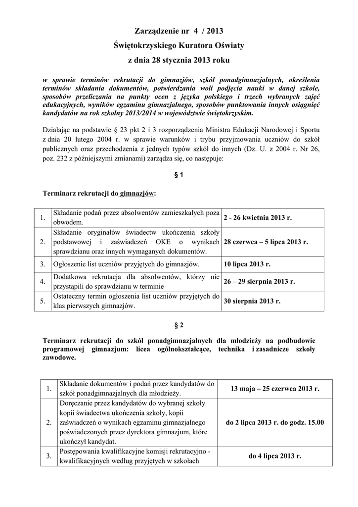Zarządzenie nr 4 / 2013 Świętokrzyskiego Kuratora Oświaty z dnia 28 stycznia 2013 roku w sprawie terminów rekrutacji do gimnazjów, szkół ponadgimnazjalnych, określenia terminów składania dokumentów, potwierdzania woli podjęcia nauki w danej szkole, sposobów przeliczania na punkty ocen z języka polskiego i trzech wybranych zajęć edukacyjnych, wyników egzaminu gimnazjalnego, sposobów punktowania innych osiągnięć kandydatów na rok szkolny 2013/2014 w województwie świętokrzyskim. Działając na podstawie § 23 pkt 2 i 3 rozporządzenia Ministra Edukacji Narodowej i Sportu z dnia 20 lutego 2004 r. w sprawie warunków i trybu przyjmowania uczniów do szkół publicznych oraz przechodzenia z jednych typów szkół do innych (Dz. U. z 2004 r. Nr 26, poz. 232 z późniejszymi zmianami) zarządza się, co następuje: §1 Terminarz rekrutacji do gimnazjów: Składanie podań przez absolwentów zamieszkałych poza 2 - 26 kwietnia 2013 r. obwodem. Składanie oryginałów świadectw ukończenia szkoły podstawowej i zaświadczeń OKE o wynikach 28 czerwca – 5 lipca 2013 r. sprawdzianu oraz innych wymaganych dokumentów. 1. 2. 3. Ogłoszenie list uczniów przyjętych do gimnazjów. 10 lipca 2013 r. Dodatkowa rekrutacja dla absolwentów, którzy nie 26 – 29 sierpnia 2013 r. przystąpili do sprawdzianu w terminie Ostateczny termin ogłoszenia list uczniów przyjętych do 30 sierpnia 2013 r. klas pierwszych gimnazjów. 4. 5. §2 Terminarz rekrutacji do szkół ponadgimnazjalnych dla młodzieży na podbudowie programowej gimnazjum: licea ogólnokształcące, technika i zasadnicze szkoły zawodowe. 1. 2. 3. Składanie dokumentów i podań przez kandydatów do szkół ponadgimnazjalnych dla młodzieży. Doręczanie przez kandydatów do wybranej szkoły kopii świadectwa ukończenia szkoły, kopii zaświadczeń o wynikach egzaminu gimnazjalnego poświadczonych przez dyrektora gimnazjum, które ukończył kandydat. Postępowania kwalifikacyjne komisji rekrutacyjno kwalifikacyjnych według przyjętych w szkołach 13 maja – 25 czerwca 2013 r. do 2 lipca 2013 r. do godz. 15.00 do 4 lipca 2013 r. procedur. 4. 5. 6. 7. 8. 9. Ogłoszenie wstępnych list kandydatów 4 lipca 2013 r. do godz. 1200 zakwalifikowanych do szkół ponadgimnazjalnych. Potwierdzenie woli podjęcia nauki w danej szkole poprzez dostarczenie oryginału świadectwa od 4 lipca 2013 r. od godz. 1300 ukończenia gimnazjum i oryginału zaświadczenia o do 8 lipca 2013 r. do godz. 1500 wynikach egzaminu gimnazjalnego. Niedoręczenie przez kandydata oryginału świadectwa i zaświadczenia do wybranej szkoły traktowane jest jako jego rezygnacja ze starania się o przyjęcie do tej szkoły. Ogłoszenie ostatecznych list uczniów przyjętych do poszczególnych szkół i podanie informacji 9 lipca 2013 r. do godz.1200 o wolnych miejscach. Przeprowadzenie rekrutacji uzupełniającej. Składanie przez kandydatów niezakwalifikowanych do żadnej ze szkół oryginału dokumentów (świadectwa i do 11 lipca 2013 r. do godz. 12.00 zaświadczenia o wyniku egzaminu gimnazjalnego) do szkół dysponujących wolnymi miejscami. Ogłoszenie list uczniów przyjętych w wyniku 12 lipca 2013 r. godz. 10.00 rekrutacji uzupełniającej. Przeprowadzenie dodatkowej rekrutacji do szkół, do 30 sierpnia 2013 r. które dysponują wolnymi miejscami. §3 Przekazywanie informacji o przebiegu rekrutacji w szkołach ponadgimnazjalnych przez dyrektora szkoły do Kuratorium Oświaty w Kielcach. 1. Terminarz przekazywania informacji do Kuratorium Oświaty w Kielcach o przebiegu rekrutacji w województwie świętokrzyskim: • do 9 lipca 2013 r. do godz. 1500 informacja o wynikach naboru w szkole wg. załącznika nr 2; • do 9 września 2013 r. do godz. 1000 informacja o wynikach naboru do szkoły na rok szkolny 2013/2014 wg. załącznika nr.3. 2. Informacje z poszczególnych szkół o przebiegu rekrutacji należy przesyłać drogą elektroniczną w nieprzekraczalnych terminach do Kuratorium Oświaty w Kielcach. §4 Zasady przyznawania punktów przy rekrutacji. 1. Maksymalna liczba punktów możliwa do uzyskania w postępowaniu kwalifikacyjnym za oceny z języka polskiego i trzech wybranych obowiązkowych zajęć przedmiotów, a także za wyniki egzaminu przeprowadzanego w ostatnim roku nauki w gimnazjum oraz inne osiągnięcia kandydatów - 200 pkt., w tym: 1) liczba punktów możliwych do uzyskania za egzamin przeprowadzony w ostatnim roku nauki w gimnazjum - 100 pkt., 2) liczba punktów możliwych do uzyskania za oceny na świadectwie ukończenia gimnazjum z czterech przedmiotów - języka polskiego i trzech obowiązkowych zajęć edukacyjnych wskazanych przez szkolną komisję rekrutacyjną oraz za inne osiągnięcia ucznia wymienione w świadectwie ukończenia gimnazjum - 100 pkt. 2. Wyniki egzaminu gimnazjalnego (zawarte w zaświadczeniu o szczegółowych wynikach egzaminu), wyrażone w skali procentowej dla zadań z zakresu: 1) języka polskiego, 2) historii i wiedzy o społeczeństwie, 3) matematyki, 4) przedmiotów przyrodniczych: biologii, geografii, fizyki i chemii, 5) języka obcego nowożytnego na poziomie podstawowym, przeliczane są na punkty według zasady, iż z każdego zakresu można uzyskać maksymalnie 20 punktów, czyli jeden procent w każdym z zakresów odpowiada 0,2 punkta 3. Oceny ze świadectwa ukończenia szkoły gimnazjalnej z j. polskiego i trzech wybranych obowiązkowych zajęć edukacyjnych – maksymalnie 76 punktów. Przy ustalaniu liczby punktów za oceny na świadectwie ukończenia gimnazjum stosujemy następujące przeliczenia: 1) 2) 3) 4) 5) celujący - 19 punktów (4 przedmioty x 19 pkt =76 pkt), bardzo dobry - 15 punktów, dobry - 10 punktów, dostateczny - 5 punktów, dopuszczający - 2 punkty; 4. Szczególne osiągnięcia ucznia – maksymalnie 24 punkty: a. ukończenie gimnazjum z wyróżnieniem – maksymalnie 5 punktów; b. szczególne osiągnięcia ucznia wymienione na świadectwie, w tym: 1) potwierdzone os