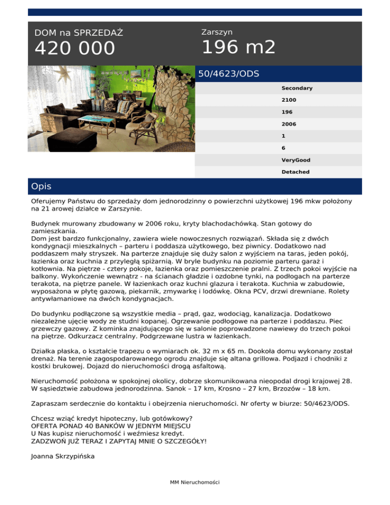 DOM na SPRZEDAŻ 420 000 Zarszyn 196 m2 50/4623/ODS Secondary 2100 196 2006 1 6 VeryGood Detached Opis Oferujemy Państwu do sprzedaży dom jednorodzinny o powierzchni użytkowej 196 mkw położony na 21 arowej działce w Zarszynie. Budynek murowany zbudowany w 2006 roku, kryty blachodachówką. Stan gotowy do zamieszkania. Dom jest bardzo funkcjonalny, zawiera wiele nowoczesnych rozwiązań. Składa się z dwóch kondygnacji mieszkalnych – parteru i poddasza użytkowego, bez piwnicy. Dodatkowo nad poddaszem mały stryszek. Na parterze znajduje się duży salon z wyjściem na taras, jeden pokój, łazienka oraz kuchnia z przyległą spiżarnią. W bryle budynku na poziomie parteru garaż i kotłownia. Na piętrze - cztery pokoje, łazienka oraz pomieszczenie pralni. Z trzech pokoi wyjście na balkony. Wykończenie wewnątrz - na ścianach gładzie i ozdobne tynki, na podłogach na parterze terakota, na piętrze panele. W łazienkach oraz kuchni glazura i terakota. Kuchnia w zabudowie, wyposażona w płytę gazową, piekarnik, zmywarkę i lodówkę. Okna PCV, drzwi drewniane. Rolety antywłamaniowe na dwóch kondygnacjach. Do budynku podłączone są wszystkie media – prąd, gaz, wodociąg, kanalizacja. Dodatkowo niezależne ujęcie wody ze studni kopanej. Ogrzewanie podłogowe na parterze i poddaszu. Piec grzewczy gazowy. Z kominka znajdującego się w salonie poprowadzone nawiewy do trzech pokoi na piętrze. Odkurzacz centralny. Podgrzewane lustra w łazienkach. Działka płaska, o kształcie trapezu o wymiarach ok. 32 m x 65 m. Dookoła domu wykonany został drenaż. Na terenie zagospodarowanego ogrodu znajduje się altana grillowa. Podjazd i chodniki z kostki brukowej. Dojazd do nieruchomości drogą asfaltową. Nieruchomość położona w spokojnej okolicy, dobrze skomunikowana nieopodal drogi krajowej 28. W sąsiedztwie zabudowa jednorodzinna. Sanok – 17 km, Krosno – 27 km, Brzozów – 18 km. Zapraszam serdecznie do kontaktu i obejrzenia nieruchomości. Nr oferty w biurze: 50/4623/ODS. Chcesz wziąć kredyt hipoteczny, lub gotówkowy? OFERTA PONAD 40 BANKÓW W JEDNYM MIEJSCU U Nas kupisz nieruchomość i weźmiesz kredyt. ZADZWOŃ JUŻ TERAZ I ZAPYTAJ MNIE O SZCZEGÓŁY! Joanna Skrzypińska MM Nieruchomości Agent ds. nieruchomości MM Nieruchomości tel. 502 477 701 Oddział Sanok: ul. Szopena 10 tel. +48 13 492 41 61 +48 881-799-704 e-mail.: [email protected] MM Nieruchomości oddział w Sanoku tel. +48 13 492 41 61 +48 881-799-704 ZAPŁACISZ TYLKO WTEDY, KIEDY OKAŻEMY SIĘ SKUTECZNI! MM 360 tel. +48 881 799 704; +48 13 492 41 61 email: [email protected] MM Nieruchomości Powered by TCPDF (www.tcpdf.org)