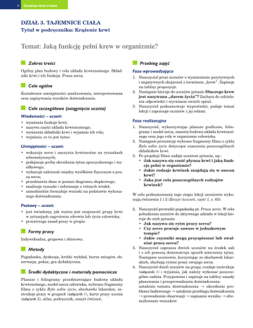 Scenariusz lekcji w klasie 1 DZIAŁ 3. TAJEMNICE CIAŁA Tytuł w podr´czniku: Krà˝enie krwi Temat: Jakà funkcj´ pełni krew w organizmie? Zakres treÊci Ogólny plan budowy i rola układu krwionoÊnego. Składniki krwi i ich funkcja. Praca serca. Cele ogólne Kształcenie umiej´tnoÊci analizowania, interpretowania oraz zapisywania wyników doÊwiadczenia. Cele szczegółowe (osiàgni´cia ucznia) Przebieg zaj´ç Faza wprowadzajàca 1. Nauczyciel prosi uczniów o wymienienie pozytywnych i negatywnych skojarzeƒ z terminem „krew”. Zapisuje na tablicy propozycje. 2. Nast´pnie kieruje do uczniów pytanie Dlaczego krew jest nazywana ,,darem ˝ycia”? Zach´ca do udzielania odpowiedzi i wyra˝ania swoich opinii. 3. Nauczyciel podsumowuje wypowiedzi, podaje temat lekcji i zapoznaje uczniów z jej celami. WiadomoÊci – uczeƒ: • • • • wymienia funkcje krwi; nazywa cz´Êci układu krwionoÊnego; wymienia składniki krwi i wyjaÊnia ich rol´; wyjaÊnia, co to jest t´tno. Umiej´tnoÊci – uczeƒ: • wskazuje serce i naczynia krwionoÊne na rysunkach schematycznych; • podejmuje prób´ okreÊlenia t´tna spoczynkowego i wysiłkowego; • wykazuje zale˝noÊç mi´dzy wysiłkiem fizycznym a pracà serca; • przedstawia dane w postaci diagramu słupkowego; • analizuje rysunki i informacje z ró˝nych êródeł; • samodzielnie formułuje wnioski na podstawie wykonanego doÊwiadczenia. Postawy – uczeƒ: • jest Êwiadomy, jak wa˝na jest znajomoÊç grupy krwi w sytuacjach zagro˝enia zdrowia lub ˝ycia człowieka; • przestrzega zasad pracy w grupie. Formy pracy Indywidualna, grupowa i zbiorowa. Metody Pogadanka, dyskusja, krótki wykład, burza mózgów, obserwacja, pokaz, gra dydaktyczna. Ârodki dydaktyczne i materiały pomocnicze Plansze i foliogramy przedstawiajàce budow´ układu krwionoÊnego, model serca człowieka, wybrane fragmenty filmu z cyklu Było sobie ˝ycie, słuchawki lekarskie, instrukcje pracy w grupach (załàcznik 1), karty pracy ucznia (załàcznik 2), atlas, podr´cznik, zeszyt çwiczeƒ. Faza realizacyjna 1. Nauczyciel, wykorzystujàc plansze graficzne, foliogramy i model serca, omawia budow´ układu krwionoÊnego oraz jego rol´ w organizmie człowieka. 2. Nast´pnie prezentuje wybrane fragmenty filmu z cyklu Było sobie ˝ycie dotyczàce znaczenia poszczególnych składników krwi. 3. Po projekcji filmu zadaje uczniom pytania, np.: • Jak nazywa si´ cz´Êç płynna krwi i jakà funkcj´ pełni w organizmie? • Jakie rodzaje krwinek znajdujà si´ w osoczu krwi? • Jaka jest rola poszczególnych rodzajów krwinek? W celu podsumowania tego etapu lekcji uczniowie wykonujà çwiczenia 1 i 2 (Zeszyt çwiczeƒ, cz´Êç 1, s. 63). 2. Nauczyciel prowadzi pogadank´ pt. Praca serca. W celu pobudzenia uczniów do aktywnego udziału w lekcji kieruje do nich pytania: • Jak nazywa si´ rytm pracy serca? • Czy serce pracuje zawsze w jednakowym tempie? • Jakie czynniki mogà przyspieszaç lub zwalniaç prac´ serca? 3. Nauczyciel zaprasza dwóch uczniów na Êrodek sali i z ich pomocà demonstruje sposób mierzenia t´tna. Nast´pnie uczniowie, korzystajàc ze słuchawek lekarskich, słuchajà rytmu pracy swojego serca. 4. Nauczyciel dzieli uczniów na grupy, rozdaje instrukcje (załàcznik 1) i wyjaÊnia, jak nale˝y wykonaç poszczególne zadnia. Przypomina i zapisuje na tablicy zasady planowania i przeprowadzania doÊwiadczenia: ustalenie tematu doÊwiadczenia → okreÊlenie problemu badawczego → ustalenie przebiegu doÊwiadczenia → prowadzenie obserwacji → zapisanie wyniku → sformułowanie wniosków Praca nauczyciela 5. Uczniowie pracujà w grupach, zgodnie z instrukcjà. Nauczyciel sprawdza poprawnoÊç wykonywanej pracy. 6. Nauczyciel wyjaÊnia uczniom zasady tworzenia diagramu słupkowego na przykładzie çwiczenia 3 (Zeszyt çwiczeƒ, cz´Êç 1, s. 64). Omawia znajomoÊç grupy krwi w sytuacjach zagro˝enia zdrowia i ˝ycia człowieka. Nast´pnie rozdaje uczniom karty pracy (załàcznik 2). Uczniowie wykonujà zadanie 1 z karty pracy. Faza podsumowujàca 1. Nauczyciel podsumowuje lekcj´ – prosi uczniów o wymienienie czynników, które wpływajà korzystnie na prac´ serca oraz szkodliwych dla serca. Uczniowie wykonujà zadanie 2 z karty pracy. Praca domowa 1. WyjaÊnij jednym zdaniem, czym zajmuje si´ kardiolog. 2. Dowiedz si´, jakà masz grup´ krwi, i zapisz informacj´ w zeszycie czerwonym pisakiem. Przygotuj plakietk´ z tà informacjà, którà b´dziesz nosił przy sobie. Zadanie dodatkowe dla ch´tnych uczniów Wyszukaj w ró˝nych êródłach informacje o chorobach układu krwionoÊnego: niedokrwistoÊci (potocznie anemia), białaczki, hemofilii. Sporzàdê o nich krótkà notatk´. Załàcznik 1 Instrukcja dla grup Zbadaj swoje t´tno, czyli jak szybko bije twoje serce Rytm uderzeƒ serca, czyli t´tno, najłatwiej wyczuç powy˝ej nadgarstka na t´tnicy promieniowej lub na t´tnicy szyjnej. Spróbuj zmierzyç liczb´ uderzeƒ serca w spoczynku i po wysiłku. Wykonaj doÊwiadczenie opisane w poleceniu 3 na s. 64 (Zeszyt çwiczeƒ, cz´Êç 1). W tym celu: 1. Usiàdê wygodnie i połó˝ r´k´ na stole, wn´trze dłoni skieruj do góry, jak pokazano na zdj´ciu. tym palcem wyczuj t´tno 2. UmieÊç Êrodkowy palec drugiej r´ki powy˝ej nadgarstka. Czy czujesz rytmiczne uderzenia serca? JeÊli nie, to zmieƒ poło˝enie palca, tak aby wyraênie wyczuç t´tno. 3. Policz liczb´ uderzeƒ serca w ciàgu minuty lub zmierz t´tno w ciàgu 15 sekund, a wynik pomnó˝ przez 4. Zapisz wynik w tabeli. 4. Wykonaj dziesi´ç przysiadów i ponownie policz liczb´ uderzeƒ serca w ciàgu minuty. Zapisz wynik w tabeli. 5. Uzupełnij pozostałe punkty polecenia 3 z zeszytu çwiczeƒ. 2 3 Załàcznik 2 Karta pracy 1 Przedstawianie danych w formie wykresu słupkowego. Przeanalizuj dane zapisane w tabeli. Rodzaj aktywnoÊci fizycznej Spoczynek Spacer Bieg Liczba uderzeƒ serca 70 100 130 Przedstaw informacje zawarte tabe