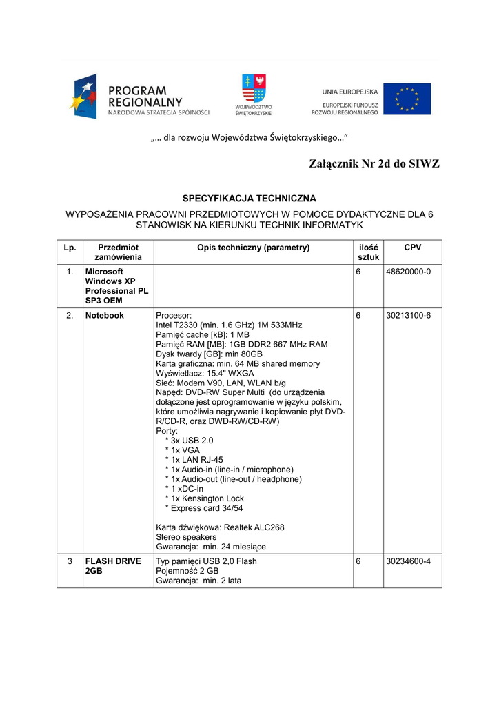 „… dla rozwoju Województwa Świętokrzyskiego…” Załącznik Nr 2d do SIWZ SPECYFIKACJA TECHNICZNA WYPOSAśENIA PRACOWNI PRZEDMIOTOWYCH W POMOCE DYDAKTYCZNE DLA 6 STANOWISK NA KIERUNKU TECHNIK INFORMATYK Lp. Przedmiot zamówienia 1. Microsoft Windows XP Professional PL SP3 OEM 2. Notebook Opis techniczny (parametry) Procesor: Intel T2330 (min. 1.6 GHz) 1M 533MHz Pamięć cache [kB]: 1 MB Pamięć RAM [MB]: 1GB DDR2 667 MHz RAM Dysk twardy [GB]: min 80GB Karta graficzna: min. 64 MB shared memory Wyświetlacz: 15.4" WXGA Sieć: Modem V90, LAN, WLAN b/g Napęd: DVD-RW Super Multi (do urządzenia dołączone jest oprogramowanie w języku polskim, które umoŜliwia nagrywanie i kopiowanie płyt DVDR/CD-R, oraz DWD-RW/CD-RW) Porty: * 3x USB 2.0 * 1x VGA * 1x LAN RJ-45 * 1x Audio-in (line-in / microphone) * 1x Audio-out (line-out / headphone) * 1 xDC-in * 1x Kensington Lock * Express card 34/54 ilość sztuk CPV 6 48620000-0 6 30213100-6 6 30234600-4 Karta dźwiękowa: Realtek ALC268 Stereo speakers Gwarancja: min. 24 miesiące 3 FLASH DRIVE 2GB Typ pamięci USB 2,0 Flash Pojemność 2 GB Gwarancja: min. 2 lata 4 Drukarka laserowa nominalna prędkość druku mono: 12 str./min. nominalna prędkość druku kolor: 8 str./min. rozdzielczość w pionie mono: 600 dpi rozdzielczość w poziomie mono: 600 dpi rozdzielczość w pionie kolor: 600 dpi rozdzielczość w poziomie kolor: 600 dpi normatywny cykl pracy: 25 000 str./mies. gramatura papieru: 60 - 220 g/m² pojemność podajnika papieru: 150 szt. maks. rozmiar nośnika: A4 zainstalowana pamięć: 16 MB złącza zewnętrzne: USB 2.0 Gwarancja: 1 rok 1 30232110-8 5 Przełącznik (switch) liczba portów 10/100 Mbit: 8 szt. prędkość magistrali wew.1,6 Gb/s Gwarancja 2 lata 1 30237110-3 …….……………………… Podpis wykonawcy