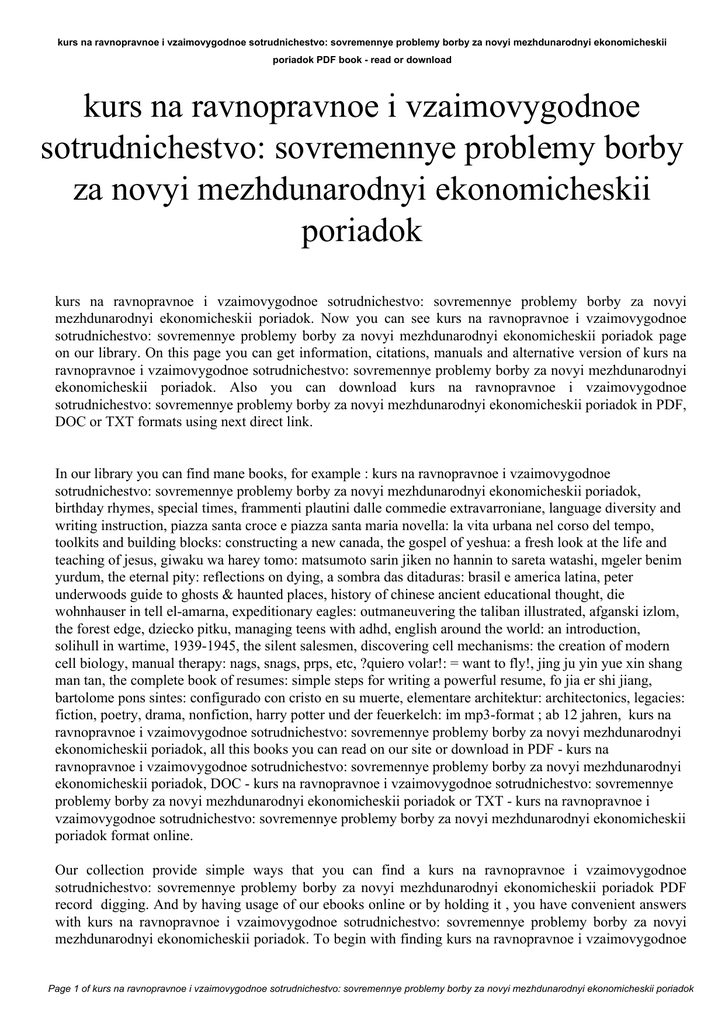 kurs na ravnopravnoe i vzaimovygodnoe sotrudnichestvo: sovremennye problemy borby za novyi mezhdunarodnyi ekonomicheskii poriadok PDF book - read or download kurs na ravnopravnoe i vzaimovygodnoe sotrudnichestvo: sovremennye problemy borby za novyi mezhdunarodnyi ekonomicheskii poriadok kurs na ravnopravnoe i vzaimovygodnoe sotrudnichestvo: sovremennye problemy borby za novyi mezhdunarodnyi ekonomicheskii poriadok. Now you can see kurs na ravnopravnoe i vzaimovygodnoe sotrudnichestvo: sovremennye problemy borby za novyi mezhdunarodnyi ekonomicheskii poriadok page on our library. On this page you can get information, citations, manuals and alternative version of kurs na ravnopravnoe i vzaimovygodnoe sotrudnichestvo: sovremennye problemy borby za novyi mezhdunarodnyi ekonomicheskii poriadok. Also you can download kurs na ravnopravnoe i vzaimovygodnoe sotrudnichestvo: sovremennye problemy borby za novyi mezhdunarodnyi ekonomicheskii poriadok in PDF, DOC or TXT formats using next direct link. In our library you can find mane books, for example : kurs na ravnopravnoe i vzaimovygodnoe sotrudnichestvo: sovremennye problemy borby za novyi mezhdunarodnyi ekonomicheskii poriadok, birthday rhymes, special times, frammenti plautini dalle commedie extravarroniane, language diversity and writing instruction, piazza santa croce e piazza santa maria novella: la vita urbana nel corso del tempo, toolkits and building blocks: constructing a new canada, the gospel of yeshua: a fresh look at the life and teaching of jesus, giwaku wa harey tomo: matsumoto sarin jiken no hannin to sareta watashi, mgeler benim yurdum, the eternal pity: reflections on dying, a sombra das ditaduras: brasil e america latina, peter underwoods guide to ghosts & haunted places, history of chinese ancient educational thought, die wohnhauser in tell el-amarna, expeditionary eagles: outmaneuvering the taliban illustrated, afganski izlom, the forest edge, dziecko pitku, managing teens with adhd, english around the world: an introduction, solihull in wartime, 1939-1945, the silent salesmen, discovering cell mechanisms: the creation of modern cell biology, manual therapy: nags, snags, prps, etc, ?quiero volar!: = want to fly!, jing ju yin yue xin shang man tan, the complete book of resumes: simple steps for writing a powerful resume, fo jia er shi jiang, bartolome pons sintes: configurado con cristo en su muerte, elementare architektur: architectonics, legacies: fiction, poetry, drama, nonfiction, harry potter und der feuerkelch: im mp3-format ; ab 12 jahren, kurs na ravnopravnoe i vzaimovygodnoe sotrudnichestvo: sovremennye problemy borby za novyi mezhdunarodnyi ekonomicheskii poriadok, all this books you can read on our site or download in PDF - kurs na ravnopravnoe i vzaimovygodnoe sotrudnichestvo: sovremennye problemy borby za novyi mezhdunarodnyi ekonomicheskii poriadok, DOC - kurs na ravnopravnoe i vzaimovygodnoe sotrudnichestvo: sovremennye problemy borby za novyi mezhdunarodnyi ekonomicheskii poriadok or TXT - kurs na ravnopravnoe i vzaimovygodnoe sotrudnichestvo: sovremennye problemy borby za novyi mezhdunarodnyi ekonomicheskii poriadok format online. Our collection provide simple ways that you can find a kurs na ravnopravnoe i vzaimovygodnoe sotrudnichestvo: sovremennye problemy borby za novyi mezhdunarodnyi ekonomicheskii poriadok PDF record digging. And by having usage of our ebooks online or by holding it , you have convenient answers with kurs na ravnopravnoe i vzaimovygodnoe sotrudnichestvo: sovremennye problemy borby za novyi mezhdunarodnyi ekonomicheskii poriadok. To begin with finding kurs na ravnopravnoe i vzaimovygodnoe Page 1 of kurs na ravnopravnoe i vzaimovygodnoe sotrudnichestvo: sovremennye problemy borby za novyi mezhdunarodnyi ekonomicheskii poriadok kurs na ravnopravnoe i vzaimovygodnoe sotrudnichestvo: sovremennye problemy borby za novyi mezhdunarodnyi ekonomicheskii poriadok PDF book - read or download sotrudnichestvo: sovremennye problemy borby za novyi mezhdunarodnyi ekonomicheskii poriadok, you are find our website that includes a comprehensive assortment of kurs na ravnopravnoe i vzaimovygodnoe sotrudnichestvo: sovremennye problemy borby za novyi mezhdunarodnyi ekonomicheskii poriadok manuals listed. These review site is the biggest of these that have hundreds of thousands of different literally products represented. So as to there are specific sites catered to different product also types or categories, brands or niche categories related with kurs na ravnopravnoe i vzaimovygodnoe sotrudnichestvo: sovremennye problemy borby za novyi mezhdunarodnyi ekonomicheskii poriadok. So depending on what exactly you are searching, you will be in a position to choose ebooks kurs na ravnopravnoe i vzaimovygodnoe sotrudnichestvo: sovremennye problemy borby za novyi mezhdunarodnyi ekonomicheskii poriadok to suit your own needs, kurs na ravnopravnoe i vzaimovygodnoe sotrudnichestvo: sovremennye problemy borby za novyi mezhdunarodnyi ekonomicheskii poriadok. Page 2 of kurs na ravnopravnoe i vzaimovygodnoe sotrudnichestvo: sovremennye problemy borby za novyi mezhdunarodnyi ekonomicheskii poriadok