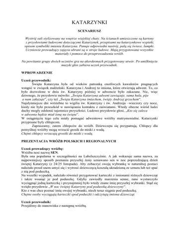KATARZYNKI SCENARIUSZ Wystrój sali stylizowany na wnętrze wiejskiej chaty. Na ścianach umieszczone są kartony z przysłowiami ludowymi dotyczącymi Katarzynek, przepisami na katarzynkowe wypieki, opisem symboliki imienia Katarzyna. Panuje odpowiedni nastrój, palą się świece, lampki. Uczniowie prowadzący zajęcia ubrani są w stroje ludowe. Mają przygotowane wszystkie materiały i pomoce do przeprowadzenia wróŜb. Na powitanie grupy dwóch uczniów gra na akordeonach przygotowany utwór. Po umilknięciu muzyki głos zabiera uczeń przewodnik. WPROWADZENIE Uczeń przewodnik: Święta Katarzyna była od wieków patronką cnotliwych kawalerów pragnących wstąpić w związek małŜeński. Katarzyna i Andrzej to imiona, które otwierają adwent. To, co było dozwolone w dniu św. Katarzyny później w adwencie było zakazane. Nic, więc dziwnego, Ŝe przysłowie mówiło: „Święta Katarzyna adwent zawiązuje, sama hula, pije a nam zakazuje”, czy teŜ „Święta Katarzyna śmiechem, święty Andrzej grzechem”. Najsłynniejsze dni wróŜebne to wigilia św. Katarzyny i św. Andrzeja –wieczory czy noce, kiedy nie było przeszkód w nawiązaniu kontaktu z zaświatami. Wtedy obecne wśród ludzi duchy mogły odsłonić tajemnice przyszłości. Ludowe przysłowie głosi, „Kto się zaleca w adwenta będzie miał Ŝonę na święta”. W osiągnięciu tego celu miały pomagać adwentowe wróŜby matrymonialne. Katarzynki przypisane były chłopcom. Zapraszamy, zatem chłopców do wróŜb. Dziewczęta się przypatrują. Chłopcy dla pomyślnej wróŜby mogą wrzucić grosik do miski z wodą. Chętni chłopcy wrzucają grosiki do miski z wodą. PREZENTACJA WRÓśB POLSKICH I REGIONALNYCH Uczeń prowadzący wróŜbę: WróŜba nosi nazwę SEN. Była ona popularna w szczególności na Lubelszczyźnie. A jak wskazuje sama nazwa, za najpewniejszy sposób poznania przyszłej Ŝony uznawano sen w noc poprzedzającą dzień świętej Katarzyny (z 24/25 listopada). Aby zobaczyć swoją wybrankę w naturalnej postaci naleŜało przed snem umyć się i wytrzeć dziewczęcą koszulą ukradzioną ze sznura lub teŜ spać z nią pod poduszką. Na wszelki wypadek, naleŜało równieŜ przygotować karteczki z imionami róŜnych dziewcząt i takŜe wsunąć je pod poduszkę. Gdyby zawiodły marzenia senne, rano wystarczyło wyciągnąć jedną karteczkę i przynajmniej było wtedy znane imię przyszłej wybranki. Stąd się wzięło przysłowie „W noc świętej Katarzyny pod poduszką dziewczyny”. Kto z was chce poznać imię swojej wybranki, niech teraz sięgnie pod poduszkę. Chętne osoby wyciągają karteczki spod poduszki i odczytują imiona dziewcząt. Uczeń przewodnik: Przejdźmy do stanowiska z następną wróŜbą. Uczeń prowadzący wróŜbę: WróŜbę określano po prostu PIÓRO. Prowadzący trzyma pióro w ręku. Za pomocą pióra wróŜyli sobie młodzieńcy w całej Polsce, jeśli chcieli poznać charakter lub stan majątkowy przyszłej Ŝony. W tym celu naleŜało wsunąć przed snem pod poduszkę piórko i czekać na pojawienie się we śnie ptaka, który określi pannę młodą. Z piórami na wsiach nie było problemu. Ptactwa było w zagrodach duŜo. Z piór robiono poduszki, pierzyny. Kobiety spotykały się na skubaniu ptactwa a następnie na darciu pierza. W tej chwili wy równieŜ macie moŜliwość wejrzeć w swoją przyszłość. Na rozłoŜonych planszach narysowane są ptaki, które mogły się wówczas przyśnić. Ci, którzy chcą dowiedzieć się, jaki będzie stan majątkowy czy charakter przyszłej Ŝony mogą wskazać wybrane plansze a ja odczytam jej znaczenie. Chętne osoby wskazują plansze, prowadzący odkrywa je i odczytuje wróŜbę. Kogut –plany małŜeńskie trzeba jeszcze odłoŜyć, wróŜył pozostanie w stanie wolnym Biała kura –ślub z młodą panną Czarna kura –ślub z wdową Kura z kurczętami –małŜeństwo z wdową z dziećmi Paw –symbolizował osobę dumną i znającą się na modzie Sowa –wróŜyła mądrą Ŝonę, choć niesympatyczną Gołąb –zapowiadał Ŝonę miłą, ładną, ale niestety głupią Uczeń przewodnik: Kolejna wróŜba związana była z jedzeniem zobaczmy, na czym polegała. Uczeń prowadzący wróŜbę: Nazwa wróŜby to POSIŁEK. WróŜba ta była rozpowszechniona w sąsiednim regionie –regionie radomskim. Rankiem kawalerowie zbierali się na wspólnym śniadaniu i kaŜdy z nich przynosił suchary. Następnie je zjadano. Czy ktoś chce się poczęstować sucharem, a tym samym wziąć udział we wróŜbie? Prowadzący prosi dwie chętne osoby. Po skonsumowaniu przez nie sucharów objaśnia: Ten, kto pierwszy skończył jeść, mógł oŜenić się jeszcze w tym roku. Uczeń przewodnik: A teraz zapraszam dalej. Przyjrzyjcie się wróŜbie z naszego, chełmskiego regionu. Uczeń prowadzący wróŜbę: Od pływających to na wodzie łupin orzechów będziemy nazywać tą wróŜbę ŁUPINY ORZECHÓW. Na przygotowanej misce z wodą przyklejone są karteczki z imionami Ŝeńskimi. W misce łupiny orzechów włoskich wypełnione plasteliną, w których umocowane są małe, zapalone świeczki urodzinowe. Prowadzący wybiera 2 chętnych chłopców. Do krawędzi miski przyklejone są karteczki z imionami dziewcząt. Zadaniem chłopców jest dmuchanie w łupinki małych stateczków. Jeśli łupiny orzecha dopłyną do krawędzi miski, poznamy imiona wybranek ich serc. Prowadzący odczytuje imiona, gdy „stateczki” podpłyną do krawędzi miski. Uczeń przewodnik: A teraz posłuchajcie o innej moŜliwości poznania przyszłości. 2 Uczeń prowadzący wróŜbę: WróŜba nazywa się GAŁĄZKA. Prowadzący trzyma gałązkę w ręku Z pomocą gałązki wiśni lub czereśni wróŜono sobie na Lubelszczyźnie. Jeśli ktoś chce dzięki gałązce wejrzeć w przyszłość, to proszę sobie teraz jedną wziąć. Chętni chłopcy biorą gałązki. W dzień św. Katarzyny naleŜało wstawić tą gałązkę do wody. Je