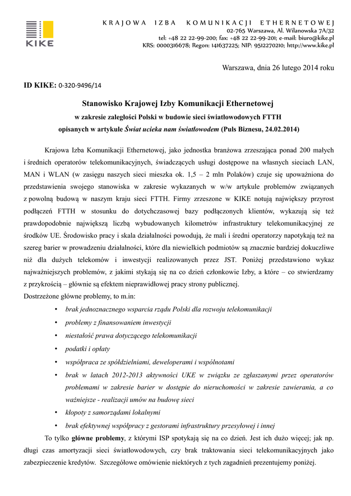 KRAJOWA IZBA KOMUNIKACJI ETHERNETOWEJ 02-765 Warszawa, Al. Wilanowska 7A/32 tel: +48 22 22-99-200; fax: +48 22 22-99-201; e-mail: [email protected] KRS: 0000316678; Regon: 141637225; NIP: 9512270210; http://www.kike.pl Warszawa, dnia 26 lutego 2014 roku ID KIKE: 0-320-9496/14 Stanowisko Krajowej Izby Komunikacji Ethernetowej w zakresie zaległości Polski w budowie sieci światłowodowych FTTH opisanych w artykule Świat ucieka nam światłowodem (Puls Biznesu, 24.02.2014) Krajowa Izba Komunikacji Ethernetowej, jako jednostka branżowa zrzeszająca ponad 200 małych i średnich operatorów telekomunikacyjnych, świadczących usługi dostępowe na własnych sieciach LAN, MAN i WLAN (w zasięgu naszych sieci mieszka ok. 1,5 – 2 mln Polaków) czuje się upoważniona do przedstawienia swojego stanowiska w zakresie wykazanych w w/w artykule problemów związanych z powolną budową w naszym kraju sieci FTTH. Firmy zrzeszone w KIKE notują największy przyrost podłączeń FTTH w stosunku do dotychczasowej bazy podłączonych klientów, wykazują się też prawdopodobnie największą liczbą wybudowanych kilometrów infrastruktury telekomunikacyjnej ze środków UE. Środowisko pracy i skala działalności powodują, że mali i średni operatorzy napotykają też na szereg barier w prowadzeniu działalności, które dla niewielkich podmiotów są znacznie bardziej dokuczliwe niż dla dużych telekomów i inwestycji realizowanych przez JST. Poniżej przedstawiono wykaz najważniejszych problemów, z jakimi stykają się na co dzień członkowie Izby, a które – co stwierdzamy z przykrością – głównie są efektem nieprawidłowej pracy strony publicznej. Dostrzeżone główne problemy, to m.in: • brak jednoznacznego wsparcia rządu Polski dla rozwoju telekomunikacji • problemy z finansowaniem inwestycji • niestałość prawa dotyczącego telekomunikacji • podatki i opłaty • współpraca ze spółdzielniami, deweloperami i wspólnotami • brak w latach 2012-2013 aktywności UKE w związku ze zgłaszanymi przez operatorów problemami w zakresie barier w dostępie do nieruchomości w zakresie zawierania, a co ważniejsze - realizacji umów na budowę sieci • kłopoty z samorządami lokalnymi • brak efektywnej współpracy z gestorami infrastruktury przesyłowej i innej To tylko główne problemy, z którymi ISP spotykają się na co dzień. Jest ich dużo więcej; jak np. długi czas amortyzacji sieci światłowodowych, czy brak traktowania sieci telekomunikacyjnych jako zabezpieczenie kredytów. Szczegółowe omówienie niektórych z tych zagadnień prezentujemy poniżej. KRAJOWA IZBA KOMUNIKACJI ETHERNETOWEJ 02-765 Warszawa, Al. Wilanowska 7A/32 tel: +48 22 22-99-200; fax: +48 22 22-99-201; e-mail: [email protected] KRS: 0000316678; Regon: 141637225; NIP: 9512270210; http://www.kike.pl Podatki i opłaty związane z budową i utrzymaniem infrastruktury: koszty projektów i uzgodnień; opłaty za zajęcie pasa drogowego; opłaty za umieszczenie infrastruktury; opłaty dla właścicieli nieruchomości w sytuacji wskazanej w art. 33 Megaustawy; opłaty za nadzór prac instalacyjnych i serwisowych dyskutowana od początku 2014 r. koncepcja obłożenia kabli telekomunikacyjnych podatkiem w wysokości 2 procent wartości księgowej aktywów, co w sposób zauważalny podniosłoby koszty inwestycji i obniżyło ich rentowność Naruszenia artykułu 30 megaustawy, zgodnie z którą Właściciel, użytkownik wieczysty lub zarządca nieruchomości, niebędący przedsiębiorcą telekomunikacyjnym, jest obowiązany zapewnić przedsiębiorcy telekomunikacyjnemu dostęp do nieruchomości, w tym do budynku, oraz miejsca w budynku (…) w celu zapewnienia telekomunikacji Notorycznie zdarzają się sytuacje, w których z różnych powodów obowiązek ten nie jest przestrzegany: zła wola spółdzielni mieszkaniowych bierność UKE w zakresie zgłaszanych na tym gruncie problemów niejasne reguły prawne pozwalające jednostkom blokować inwestycje na rzecz większych podmiotów brak identyfikowalnego partnera – zwłaszcza w przypadku wspólnot mieszkaniowych pomimo złożenia kompletów dokumentów czas oczekiwania na podpisanie umowy na dostęp nieruchomości to niejednokrotnie ponad pół roku zarządcy i właściciele nieruchomości (wbrew art 30 Megaustawy) często żądają opłat za dostarczanie mieszkańcom usług telekomunikacyjnych Równocześnie dokuczliwy jest brak wsparcia UKE w zakresie zwalczania takich samowoli. Samowolne decyzje jednostek administracji publicznej - blokowanie inwestycji na różnych poziomach pozwolenia i zgody, ZUDy, geodezja, opłaty za zajęcie pasa drogowego niewspółmierne do sytuacji i reguł prawnych (problem dotyczy zwłaszcza dróg pozostających w gestii samorządów, a więc gminnych, powiatowych i wojewódzkich, dla których brak jest ustalonych stawek, jak to ma miejsce w przypadku dróg krajowych) KRAJOWA IZBA KOMUNIKACJI ETHERNETOWEJ 02-765 Warszawa, Al. Wilanowska 7A/32 tel: +48 22 22-99-200; fax: +48 22 22-99-201; e-mail: [email protected] KRS: 0000316678; Regon: 141637225; NIP: 9512270210; http://www.kike.pl brak zdroworozsądkowych reguł biznesowych przy ustalaniu stawek za zajęcie pasa drogowego; często stawka za jeden metr zajęcia drogi gminnej jest kilkunastokrotnie większa, niż przy drodze krajowej. brak wsparcia resortu infrastruktury oraz zarządców dróg w zakresie realizacji inwestycji w pasie drogowym – w szczególności poza obszarem zabudowanym trwające całymi miesiącami wymagane przez powiaty uzgodnienia z zarządcami dróg i ich podwykonawcami z uwagi na brak zawitych terminów w tym zakresie; nakładanie na PT obowiązków uzgodnieniowych w zakresie wprost nie wymaganym przez przepisy prawa odmowy zgody na wykonanie inwestycji możliwej do wykonania np. w trybie zgłoszenia i nieuzasadnione forsowanie w to miejsce realizacji pełnych procedur uzyskania pozwolenia na budowę Niedoskonałości istniejących unijny