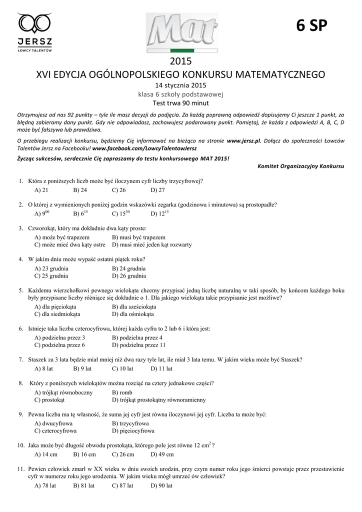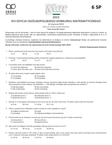 6 SP 2015 XVI EDYCJA OGÓLNOPOLSKIEGO KONKURSU MATEMATYCZNEGO 14 stycznia 2015 klasa 6 szkoły podstawowej Test trwa 90 minut Otrzymujesz od nas 92 punkty – tyle ile masz decyzji do podjęcia. Za każdą poprawną odpowiedź dopisujemy Ci jeszcze 1 punkt, za błędną zabieramy dany punkt. Gdy nie odpowiadasz, zachowujesz podarowany punkt. Pamiętaj, że każda z odpowiedzi A, B, C, D może być fałszywa lub prawdziwa. O przebiegu realizacji konkursu, będziemy Cię informować na bieżąco na stronie www.jersz.pl. Dołącz do społeczności Łowców Talentów Jersz na Facebooku! www.facebook.com/LowcyTalentowJersz Życząc sukcesów, serdecznie Cię zapraszamy do testu konkursowego MAT 2015! Komitet Organizacyjny Konkursu 1. Która z poniższych liczb może być iloczynem cyfr liczby trzycyfrowej? A) 21 B) 24 C) 26 D) 27 2. O której z wymienionych poniżej godzin wskazówki zegarka (godzinowa i minutowa) są prostopadłe? A) 900 B) 615 C) 1530 D) 1215 3. Czworokąt, który ma dokładnie dwa kąty proste: A) może być trapezem C) może mieć dwa kąty ostre B) musi być trapezem D) musi mieć jeden kąt rozwarty 4. W jakim dniu może wypaść ostatni piątek roku? A) 23 grudnia C) 25 grudnia B) 24 grudnia D) 26 grudnia 5. Każdemu wierzchołkowi pewnego wielokąta chcemy przypisać jedną liczbę naturalną w taki sposób, by końcom każdego boku były przypisane liczby różniące się dokładnie o 1. Dla jakiego wielokąta takie przypisanie jest możliwe? A) dla pięciokąta C) dla siedmiokąta B) dla sześciokąta D) dla ośmiokąta 6. Istnieje taka liczba czterocyfrowa, której każda cyfra to 2 lub 6 i która jest: A) podzielna przez 3 C) podzielna przez 6 B) podzielna przez 4 D) podzielna przez 11 7. Staszek za 3 lata będzie miał mniej niż dwa razy tyle lat, ile miał 3 lata temu. W jakim wieku może być Staszek? A) 8 lat 8. B) 9 lat C) 10 lat D) 11 lat Który z poniższych wielokątów można rozciąć na cztery jednakowe części? A) trójkąt równoboczny C) prostokąt B) romb D) trójkąt prostokątny równoramienny 9. Pewna liczba ma tę własność, że suma jej cyfr jest równa iloczynowi jej cyfr. Liczba ta może być: A) dwucyfrowa C) czterocyfrowa B) trzycyfrowa D) pięciocyfrowa 10. Jaka może być długość obwodu prostokąta, którego pole jest równe 12 cm2 ? A) 14 cm B) 16 cm C) 26 cm D) 49 cm 11. Pewien człowiek zmarł w XX wieku w dniu swoich urodzin, przy czym numer roku jego śmierci powstaje przez przestawienie cyfr w numerze roku jego urodzenia. W jakim wieku mógł umrzeć ów człowiek? A) 78 lat B) 81 lat C) 87 lat D) 90 lat 12. Ile czwartków może wypaść w roku przestępnym? A) 51 B) 52 C) 53 D) 54 13. Suma czterech kolejnych liczb naturalnych: A) może być parzysta C) może być podzielna przez 4 B) musi być parzysta D) musi być podzielna przez 4 14. Prostokątna szachownica ma cztery narożne pola. Wśród tych pól mogą być: A) 4 białe pola C) 2 pola białe i 2 pola czarne B) 3 pola białe i 1 pole czarne D) 1 pole białe i 3 pola czarne 15. W pewnej klasie liczba dziewcząt jest dokładnie półtora raza większa od liczby chłopców. Ilu uczniów może liczyć ta klasa? A) 15 B) 18 C) 20 D) 24 16. Pani Kamila kończy dzisiaj tyle lat ile wynosi iloczyn cyfr roku jej urodzenia. Ile lat może mieć pani Kamila? A) 54 B) 72 C) 81 D) 90 17. Która może być godzina, jeśli do północy zostało jeszcze mniej niż półtora raza tyle czasu, ile upłynęło od południa? A) 1630 B) 1640 C) 1650 D) 1700 18. Ile może wynosić różnica dwóch liczb dwucyfrowych, z których jedna powstaje z drugiej przez przestawienie cyfr? A) 24 B) 27 C) 32 D) 36 19. Wszystkie dzieci pani Agnieszki obchodzą dziś urodziny. Ile dzieci może mieć pani Agnieszka, jeśli wiemy, że każde z dzieci jest w innym wieku, a iloczyn liczb ich lat jest równy 216? A) 4 B) 5 C) 6 D) 7 20. Szachownicę o wymiarach 6×6 można rozciąć na prostokąty o wymiarach 3×1 nie rozcinając żadnego z pól tak, żeby liczba części zawierających dwa pola białe i jedno czarne była równa: A) 4 B) 5 C) 6 D) 7 21. Agata ma monety trzech nominałów: złotówki, dwuzłotówki i pięciozłotówki. Ile monet może mieć Agata, jeśli wiemy, że w monetach każdego nominału ma tę samą kwotę pieniędzy? A) 17 B) 21 C) 24 D) 30 22. Na pastwisku pasą się krowy i gęsi, przy czym krów jest ponad dwa razy więcej niż gęsi. Zwierzęta te mogą mieć łącznie: A) 6 głów i 20 nóg C) 8 głów i 28 nóg B) 7 głów i 22 nogi D) 9 głów i 32 nogi 23. Najstarszy z 10 mieszkańców pewnej kamienicy ma 60 lat, a najmłodszy – 12 lat. Ilu spośród mieszkańców tej kamienicy może mieć skończone 18 lat, jeśli łączny wiek wszystkich mieszkańców to 200 lat? A) 5 B) 6 C) 7 D) 8 PATRONI I PARTNERZY © COPYRIGHT BY ŁOWCY TALENTÓW – JERSZ. WILCZYN 2013