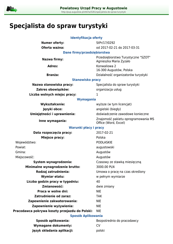 Powiatowy Urząd Pracy w Augustowie http://pup.augustow.pl/oferta/5261/specjalista-do-spraw-turystyki Specjalista do spraw turystyki Identyfikacja oferty Numer oferty: StPr/17/0292 Oferta ważna: od 2017-02-21 do 2017-03-31 Dane firmy/przedsiębiorstwa Przedsiębiorstwo Turystyczne "SZOT" Agnieszka Maria Zyzało Nazwa firmy: Adres: Konwaliowa 2 16-300 Augustów, Polska Branża: Działalność organizatorów turystyki Stanowisko pracy Nazwa stanowiska pracy: Specjalista do spraw turystyki Zakres obowiązków: organizacja usług Liczba wolnych miejsc pracy: 1 Wymagania Wykształcenie: wyższe (w tym licencjat) Języki obce: angielski (biegły) Umiejętności i uprawnienia: doświadczenie zawodowe konieczne Znajomość pakietu oprogramowania MS Office (Word, Excel) Inne wymagania: Warunki płacy i pracy Data rozpoczęcia pracy: Miejsce pracy: 2017-02-21 Polska Województwo: PODLASKIE Powiat: augustowski Gmina: Augustów Miejscowość: Augustów System wynagrodzenia: Minimalne wynagrodzenie brutto: Rodzaj zatrudnienia: Czasowy ze stawką miesięczną 3000.00 PLN Umowa o pracę na czas określony Wymiar etatu: w pełnym wymiarze Liczba godzin pracy w tygodniu: Zmianowość: 40 dwie zmiany Praca w wolne dni: NIE Zatrudnienie od zaraz: TAK Zapewnienie zakwaterowania: NIE Zapewnienie wyżywienia: NIE Pracodawca pokrywa koszty przejazdu do Polski: NIE Sposób Aplikowania Sposób aplikowania: Wymagane dokumenty: Język składania aplikacji: Bezpośrednio do pracodawcy CV polski Adres: Konwaliowa 2 16-300 Augustów, Polska Adres e-mail: pokaż adres Czy oferta jest subsydiowana: NIE Czy oferta jest finansowana z PFRON: NIE Upowszechnienie krajowej oferty pracy na terenie NIE państw EOG: