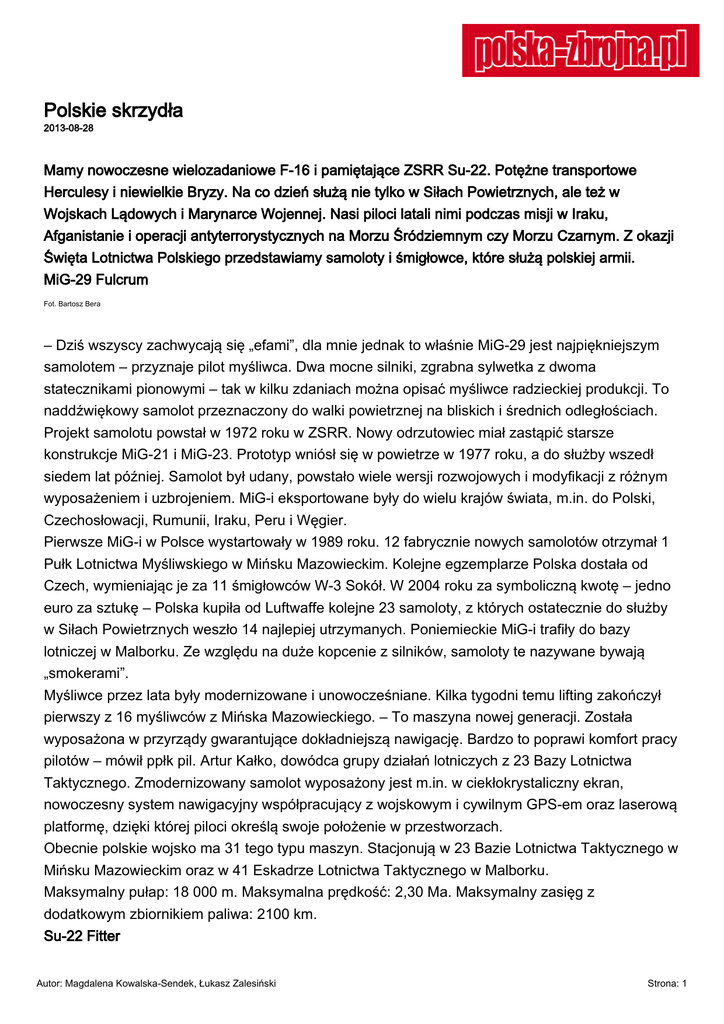 Polskie skrzydła 2013-08-28 Mamy nowoczesne wielozadaniowe F-16 i pamiętające ZSRR Su-22. Potężne transportowe Herculesy i niewielkie Bryzy. Na co dzień służą nie tylko w Siłach Powietrznych, ale też w Wojskach Lądowych i Marynarce Wojennej. Nasi piloci latali nimi podczas misji w Iraku, Afganistanie i operacji antyterrorystycznych na Morzu Śródziemnym czy Morzu Czarnym. Z okazji Święta Lotnictwa Polskiego przedstawiamy samoloty i śmigłowce, które służą polskiej armii. MiG-29 Fulcrum Fot. Bartosz Bera – Dziś wszyscy zachwycają się „efami”, dla mnie jednak to właśnie MiG-29 jest najpiękniejszym samolotem – przyznaje pilot myśliwca. Dwa mocne silniki, zgrabna sylwetka z dwoma statecznikami pionowymi – tak w kilku zdaniach można opisać myśliwce radzieckiej produkcji. To naddźwiękowy samolot przeznaczony do walki powietrznej na bliskich i średnich odległościach. Projekt samolotu powstał w 1972 roku w ZSRR. Nowy odrzutowiec miał zastąpić starsze konstrukcje MiG-21 i MiG-23. Prototyp wniósł się w powietrze w 1977 roku, a do służby wszedł siedem lat później. Samolot był udany, powstało wiele wersji rozwojowych i modyfikacji z różnym wyposażeniem i uzbrojeniem. MiG-i eksportowane były do wielu krajów świata, m.in. do Polski, Czechosłowacji, Rumunii, Iraku, Peru i Węgier. Pierwsze MiG-i w Polsce wystartowały w 1989 roku. 12 fabrycznie nowych samolotów otrzymał 1 Pułk Lotnictwa Myśliwskiego w Mińsku Mazowieckim. Kolejne egzemplarze Polska dostała od Czech, wymieniając je za 11 śmigłowców W-3 Sokół. W 2004 roku za symboliczną kwotę – jedno euro za sztukę – Polska kupiła od Luftwaffe kolejne 23 samoloty, z których ostatecznie do służby w Siłach Powietrznych weszło 14 najlepiej utrzymanych. Poniemieckie MiG-i trafiły do bazy lotniczej w Malborku. Ze względu na duże kopcenie z silników, samoloty te nazywane bywają „smokerami”. Myśliwce przez lata były modernizowane i unowocześniane. Kilka tygodni temu lifting zakończył pierwszy z 16 myśliwców z Mińska Mazowieckiego. – To maszyna nowej generacji. Została wyposażona w przyrządy gwarantujące dokładniejszą nawigację. Bardzo to poprawi komfort pracy pilotów – mówił ppłk pil. Artur Kałko, dowódca grupy działań lotniczych z 23 Bazy Lotnictwa Taktycznego. Zmodernizowany samolot wyposażony jest m.in. w ciekłokrystaliczny ekran, nowoczesny system nawigacyjny współpracujący z wojskowym i cywilnym GPS-em oraz laserową platformę, dzięki której piloci określą swoje położenie w przestworzach. Obecnie polskie wojsko ma 31 tego typu maszyn. Stacjonują w 23 Bazie Lotnictwa Taktycznego w Mińsku Mazowieckim oraz w 41 Eskadrze Lotnictwa Taktycznego w Malborku. Maksymalny pułap: 18 000 m. Maksymalna prędkość: 2,30 Ma. Maksymalny zasięg z dodatkowym zbiornikiem paliwa: 2100 km. Su-22 Fitter Autor: Magdalena Kowalska-Sendek, Łukasz Zalesiński Strona: 1 Fot. Przemysław Maliszewski Przez lotników samolot ten zwyczajowo nazywany jest „Suczką”. Przydomek ten wywodzi od skrótu Su, ten zaś pochodzi od nazwiska Pawła Suchoja, szefa biura konstrukcyjnego, w którym powstał ten samolot. W latach osiemdziesiątych, kiedy pierwsze egzemplarze pojawiły się w Polsce, samolot spowijała aura tajemnicy. To obecnie najstarszy bojowy samolot w lotnictwie polskim. Mimo to maszyna jest intensywnie wykorzystywana, lubiana i niezawodna. Dla większości pilotów i techników pozostaje legendą lotnictwa. Su-22 jest eksportową wersją radzieckiego samolotu szturmowo-bombowego Su-17. Maszyna używana była przez armie państw byłego Układu Warszawskiego, trafiła również do krajów na Bliskim Wschodzie, do Libii, Wietnamu, Peru i Angoli. W latach 80. do Polski dotarło ponad 100 egzemplarzy samolotu w różnych wersjach: M4 i szkolnej UM3K. Druga to tzw. szparka. Wyposażona jest m.in. w peryskop, dzięki któremu instruktor widzi przestrzeń przed samolotem. Su-22 to jednosilnikowa maszyna o konstrukcji półskorupowej. Skrzydła o zmiennej geometrii, dzięki czemu można regulować kąt natarcia od +28 do +68 stopni. Wlot powietrza znajduje się w nosie, a w stożku zamontowano urządzenia radiolokacyjne. Niegdyś Su-22 służyły na wojskowych lotniskach w Powidzu, Mirosławcu, Świdwinie i w Pile. Obecnie polskie Siły Powietrzne mają 32 egzemplarze tego samolotu. Wszystkie służą w 21 Bazie Lotnictwa Taktycznego w Świdwinie. Warto wspomnieć o dwu szczególnych egzemplarzach samolotu Su-22. Maszyna z numerem 3005 jest pierwszym egzemplarzem, który otrzymaliśmy od ZSRR (obecnie jest w Muzeum Lotnictwa Polskiego w Krakowie). Drugi Su-22 z numerem 707 wyróżnia się niezwykłym, tygrysim malowaniem. Został tak ozdobiony przed udziałem w NATO Tiger Meet. Maksymalny pułap: 15 200 m. Maksymalna prędkość: 1850 km/h. Maksymalny zasięg: 2550 km. C-130 E Hercules Fot. Damian Figaj Amerykański, czterosilnikowy samolot transportowy po raz pierwszy wylądował w Powidzu w marcu 2009 roku. Kolejne dwa egzemplarze dotarły do Polski rok później. Obecnie w wyposażeniu Sił Powietrznych jest pięć takich transportowców. Do dyspozycji lotników jest jeszcze jeden, nielatający Hercules. Żołnierze wykorzystują go do szkolenia naziemnego. Wszystkie egzemplarze stacjonują w Powidzu w 33 Bazie Lotnictwa Transportowego. Hercules to samolot o napędzie turbośmigłowym, produkowany przez amerykańską wytwórnię Lockheed. Maszyna rozpoczęła służbę za oceanem pod koniec 1956 roku. Wyprodukowano przeszło 2200 egzemplarzy tych maszyn w kilkudziesięciu wersjach. Samolot lata w armiach aż 50 państw. C-130 to największy samolot transportowy w polskim wojsku. Jego głównym zadaniem jest transport towarów i ludzi (także rannych) na średnich odległościach. Herculesy latają w rejon stacjonowania polskich żołnierzy, np. do Afganistanu, przewożą wojskowych i sprzęt na Autor: Magdalena Kowalska-Sendek, Łukasz Zale