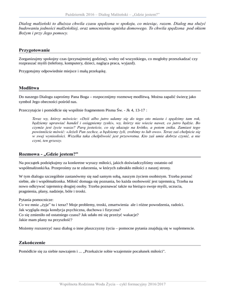 Pażdziernik 2016 – Dialog Małżeński – „Gdzie jestem?” Dialog małżeński to dłuższa chwila czasu spędzona w spokoju, co miesiąc, razem. Dialog ma służyć budowaniu jedności małżeńskiej, oraz umocnieniu ogniska domowego. To chwila spędzona pod okiem Bożym i przy Jego pomocy. Przygotowanie Zorganizujmy spokojny czas (przynajmniej godzinę), wolny od wszystkiego, co mogłoby przeszkadzać czy rozpraszać myśli (telefony, komputery, dzieci, nagląca praca, wyjazd). Przygotujmy odpowiednie miejsce i małą przekąskę. Modlitwa Do naszego Dialogu zaprośmy Pana Boga – rozpocznijmy rozmowę modlitwą. Można zapalić świecę jako symbol Jego obecności pośród nas. Przeczytajcie i pomódlcie się wspólnie fragmentem Pisma Św. - Jk 4, 13-17 : Teraz wy, którzy mówicie: «Dziś albo jutro udamy się do tego oto miasta i spędzimy tam rok, będziemy uprawiać handel i osiągniemy zyski», wy, którzy nie wiecie nawet, co jutro będzie. Bo czymże jest życie wasze? Parą jesteście, co się ukazuje na krótko, a potem znika. Zamiast tego powinniście mówić: «Jeżeli Pan zechce, a będziemy żyli, zrobimy to lub owo». Teraz zaś chełpicie się w swej wyniosłości. Wszelka taka chełpliwość jest przewrotna. Kto zaś umie dobrze czynić, a nie czyni, ten grzeszy. Rozmowa - „Gdzie jestem?” Na początek podziękujmy za konkretne wyrazy miłości, jakich doświadczyliśmy ostatnio od współmałżonki/ka. Przeprośmy za te zdarzenia, w których zabrakło miłości z naszej strony. W tym dialogu szczególnie zastanówmy się nad samym sobą, naszym życiem osobistym. Trzeba poznać siebie, ale i współmałżonka. Miłość domaga się poznania, bo każda osobowość jest tajemnicą. Trzeba na nowo odkrywać tajemnicę drugiej osoby. Trzeba poznawać także na bieżąco swoje myśli, uczucia, pragnienia, plany, nadzieje, bóle i troski. Pytania pomocnicze: Co we mnie „żyje” tu i teraz? Moje problemy, troski, zmartwienia ale i różne powodzenia, radości. Jak wygląda moja kondycja psychiczna, duchowa i fizyczna? Co się zmieniło od ostatniego czasu? Jak udało mi się przeżyć wakacje? Jakie mam plany na przyszłość? Możemy rozszerzyć nasz dialog o inne płaszczyzny życia – pomocne pytania znajdują się w suplemencie. Zakończenie Pomódlcie się za siebie nawzajem i ... „Przekażcie sobie wzajemnie pocałunek miłości". Wspólnota Rodzinna Woda Życia – cykl formacyjny 2016/2017