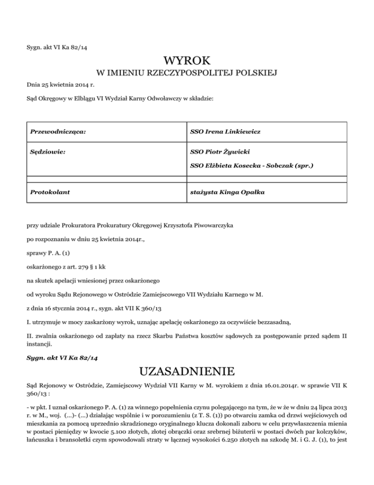 Sygn. akt VI Ka 82/14 WYROK W IMIENIU RZECZYPOSPOLITEJ POLSKIEJ Dnia 25 kwietnia 2014 r. Sąd Okręgowy w Elblągu VI Wydział Karny Odwoławczy w składzie: Przewodnicząca: SSO Irena Linkiewicz Sędziowie: SSO Piotr Żywicki SSO Elżbieta Kosecka - Sobczak (spr.) Protokolant stażysta Kinga Opałka przy udziale Prokuratora Prokuratury Okręgowej Krzysztofa Piwowarczyka po rozpoznaniu w dniu 25 kwietnia 2014r., sprawy P. A. (1) oskarżonego z art. 279 § 1 kk na skutek apelacji wniesionej przez oskarżonego od wyroku Sądu Rejonowego w Ostródzie Zamiejscowego VII Wydziału Karnego w M. z dnia 16 stycznia 2014 r., sygn. akt VII K 360/13 I. utrzymuje w mocy zaskarżony wyrok, uznając apelację oskarżonego za oczywiście bezzasadną, II. zwalnia oskarżonego od zapłaty na rzecz Skarbu Państwa kosztów sądowych za postępowanie przed sądem II instancji. Sygn. akt VI Ka 82/14 UZASADNIENIE Sąd Rejonowy w Ostródzie, Zamiejscowy Wydział VII Karny w M. wyrokiem z dnia 16.01.2014r. w sprawie VII K 360/13 : - w pkt. I uznał oskarżonego P. A. (1) za winnego popełnienia czynu polegającego na tym, że w że w dniu 24 lipca 2013 r. w M., woj. (...)- (...) działając wspólnie i w porozumieniu (z T. S. (1)) po otwarciu zamka od drzwi wejściowych od mieszkania za pomocą uprzednio skradzionego oryginalnego klucza dokonali zaboru w celu przywłaszczenia mienia w postaci pieniędzy w kwocie 5.100 złotych, złotej obrączki oraz srebrnej biżuterii w postaci dwóch par kolczyków, łańcuszka i bransoletki czym spowodowali straty w łącznej wysokości 6.250 złotych na szkodę M. i G. J. (1), to jest popełnienia przestępstwa kwalifikowanego z art.279§1kk i za to na podstawie art. 279 § 1 kk wymierzył mu karę 1 roku i 6 miesięcy pozbawienia wolności; -w pkt. IV na podstawie art.46§1kk orzekł wobec P. A. (1) i T. S. (1) obowiązek naprawienia szkody w całości przez zapłatę solidarnie na rzecz pokrzywdzonych M. J. i G. J. (1) kwoty 6250 złotych. Ponadto wyrokiem tym zwolniono oskarżonego od zapłaty kosztów sądowych i opłaty. Od powyższego wyroku apelację wniósł oskarżony, nie zgadzając z w/w wyrokiem i wnosząc o jego zmianę lub uchylenie wyroku i przekazanie sprawy sądowi I instancji do ponownego rozpoznania. W swojej apelacji skarżący podniósł, że nie jest prawdą by współoskarżony T. S. (1), po dokonanym czynie, spotkał się z oskarżonym i podzielił skradzionymi rzeczami i pieniędzmi, gdyż to T. S. (1) sam wydał wszystkie pieniądze. Podkreślił, że nie brał czynnego udziału w dokonaniu kradzieży oraz nie miał miejsca podział skradzionej biżuterii i pieniędzy. Sąd Okręgowy zważył co następuje: Apelacja wniesiona przez oskarżonego nie zasługiwała na uwzględnienie. Na wstępie stwierdzić należy, iż Sąd Rejonowy w sposób prawidłowy, drobiazgowy i rzetelny przeprowadził postępowanie gromadząc materiał dowodowy pozwalający na merytoryczne rozstrzygnięcie sprawy. Ustalenia faktyczne które poczynił w sprawie sąd I instancji nie wykraczają poza granice swobodnej oceny dowodów. Ponadto w pisemnych motywach zaskarżonego wyroku, w których dokonano bardzo szczegółowej i starannej analizy zgromadzonego materiału dowodowego, Sąd Rejonowy wskazał jakie fakty uznał za ustalone, na czym opierał poszczególne ustalenia, a następnie wskazał prawidłowe zdaniem Sądu Okręgowego wnioski jakie wyprowadził z dokonanych ustaleń w zakresie opisu i kwalifikacji prawnej czynu przypisanego oskarżonemu. Przechodząc natomiast to omówienia zarzutów z apelacji oskarżonego, to należy zarzuty te uznać za niewystarczające do podważenia ustaleń poczynionych przez sąd I instancji. Pierwszoplanowym zarzutem tego środka zaskarżenia jest zakwestionowanie ustaleń Sądu Rejonowego co do tego, że po dokonaniu kradzieży T. S. (1) spotkał się z oskarżonym, z którym podzielił się skradzionymi pieniędzmi i biżuterią. Ustalenia te poczyniono w oparciu m.in. o wyjaśnienia T. S. (1), wyjaśnienia samego P. A., protokół zatrzymania rzeczy od P. A. (1). Skarżący wskazał w apelacji, że nie jest to prawdą, by współoskarżony podzielił się z nim łupem uzyskanym w wyniku przestępstwa, przy czym w żaden sposób nie wdał się w szerszą polemikę z ustaleniami sądu orzekającego, nie wskazał też na inne dowody, które miałyby poprzeć prezentowaną przez niego wersję. Tymczasem nie można zapominać, że to właśnie u oskarżonego P. A. (1), w miejscu jego zamieszkania, ujawniono kawałki biżuterii, co do których, to przecież sam oskarżony nie kwestionował, iż ujawnione w jego mieszkaniu fragmenty biżuterii pochodziły z zarzucanej mu kradzieży z włamaniem, że dostał je od T. S. (1) i że podjął działania w celu sprzedaży tej biżuterii w lombardzie, a gdy okazały się one nieskuteczne, to zabrał ją do domu by podjąć kolejne kroki w celu jej sprzedaży. W świetle zaś tych ostatnich okoliczności, to stanowisko oskarżonego z apelacji dot. braku styczności z łupem, należy uznać za nie uzasadnione materiałem dowodowym i gołosłowne. Sąd I instancji słusznie więc przyjął za wiarygodną wersję T. S. o tym, że doszło do podziału łupów, przy czym jedynie za niefortunne, niezbyt precyzyjne należy potraktować użyte w pisemnym uzasadnieniu na str. 3 sformułowanie, że po dokonaniu kradzieży T. S. „spotkał się z P. A. (1), z którym podzielił się skradzionymi pieniędzmi i biżuterią”, czy użyte w pisemnym uzasadnieniu na str. 6 sformułowanie, że „skradzione przedmioty zostały podzielone między P. A. (1) i T. S. (1)” bez zaznaczenia, że to T. S. zabrał pieniądze, a P. A. –biżuterię. W tym miejscu należy też zaznaczyć, że skarżący nie wskazał jaki wpływ okoliczność dot. podziału łupu miałaby, na postulowaną przez oskarżonego „zmianę wyroku” i w jakim kierunku zmiana ta miałaby nastąpić, stąd trudno odnieść się w sposób wyczer